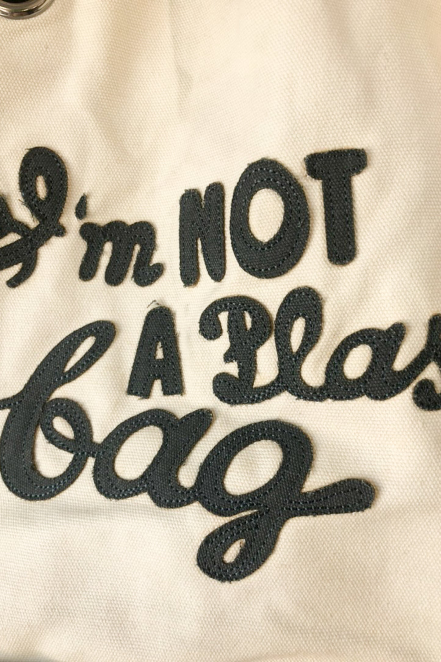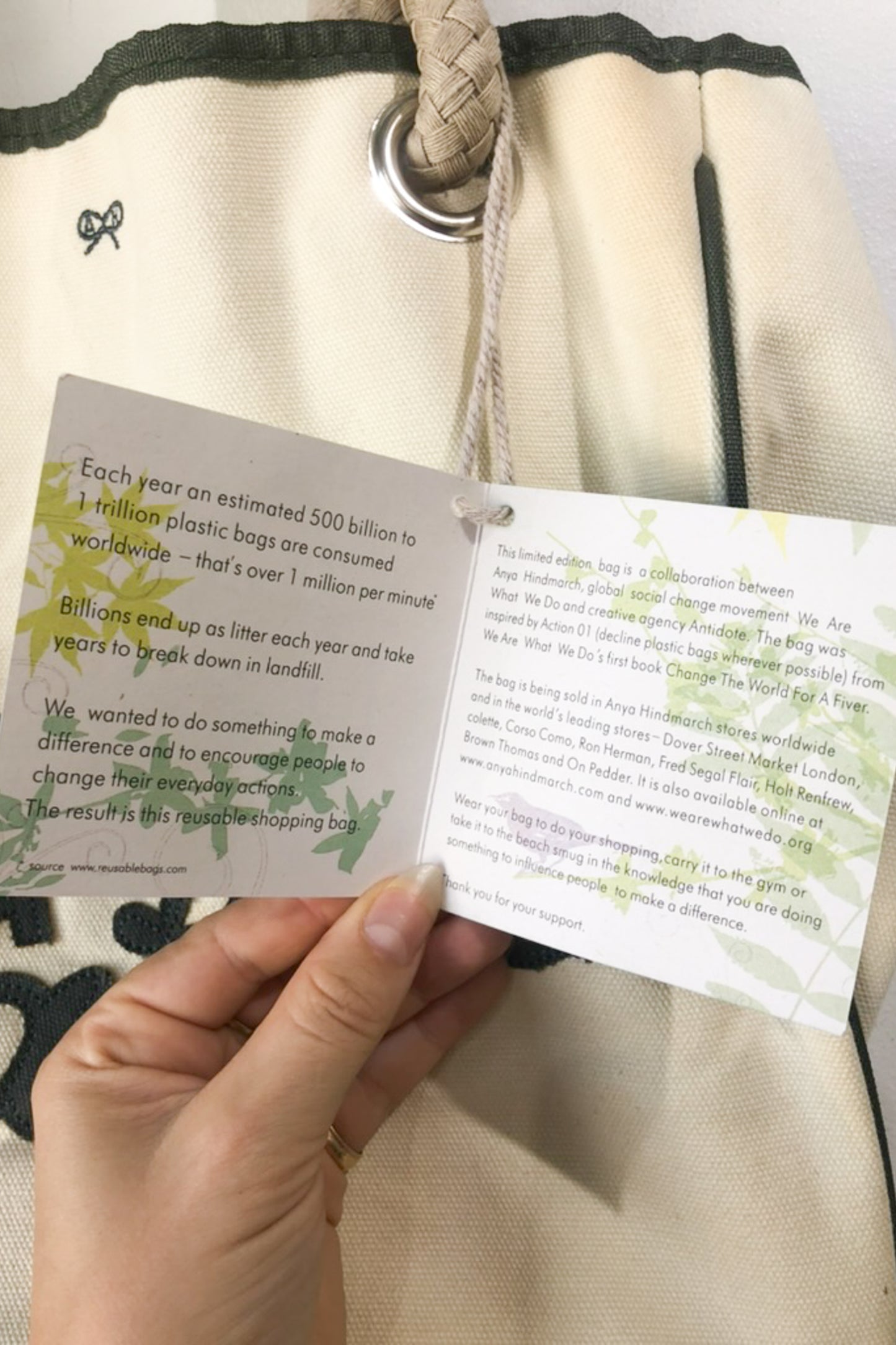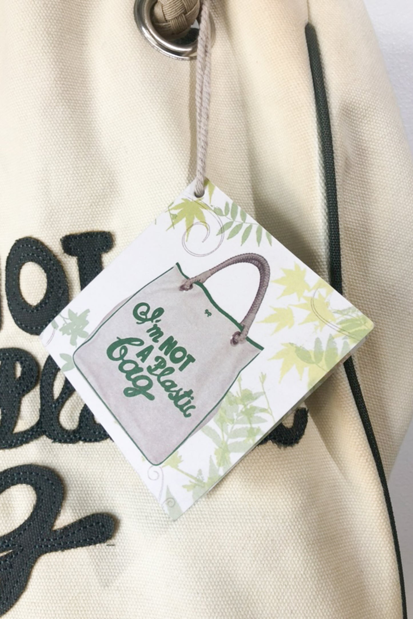 Anya Hindmarch Canvas Bag. "I am not a Plastic Bag" canvas bag in cream and olive. Has rope handles looped through large silver grommets. No marked content, feels like cotton. Hand wash only. One Size. Imported.