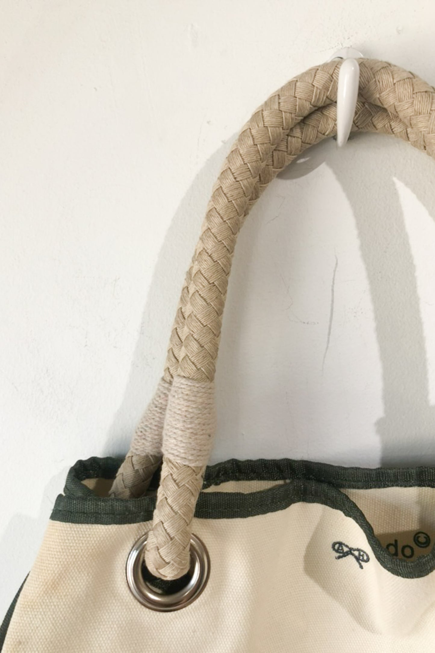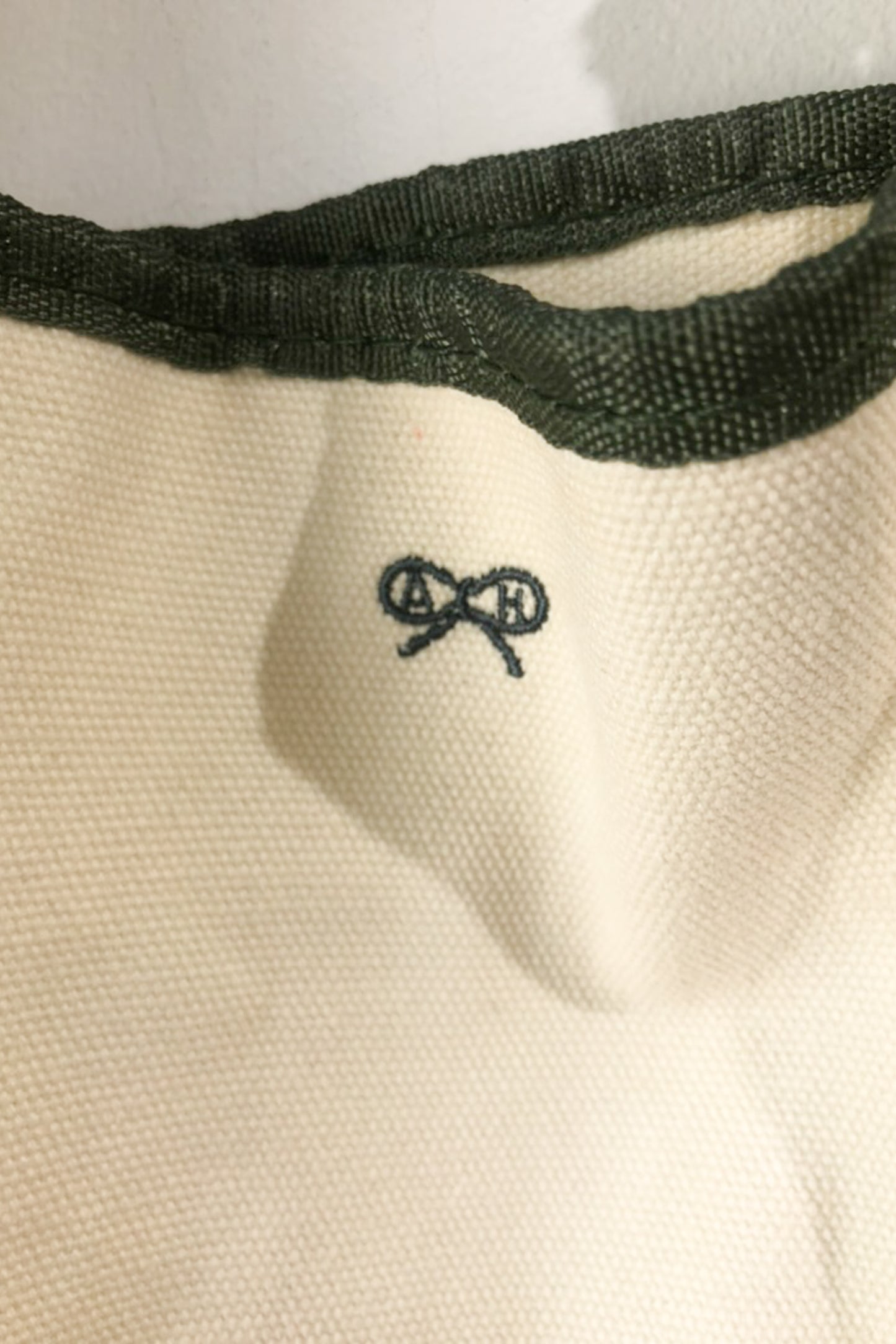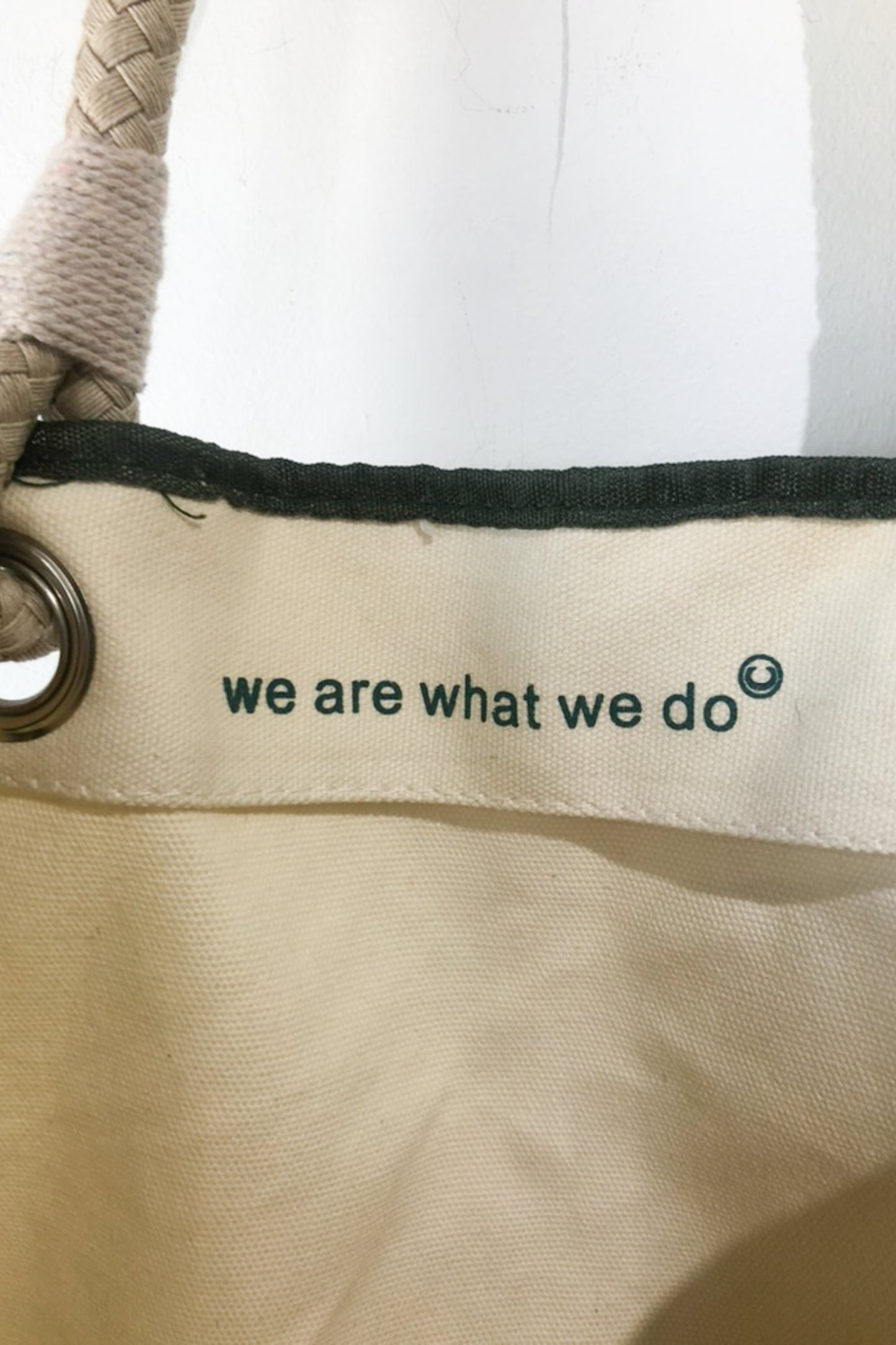 Anya Hindmarch Canvas Bag. "I am not a Plastic Bag" canvas bag in cream and olive. Has rope handles looped through large silver grommets. No marked content, feels like cotton. Hand wash only. One Size. Imported.