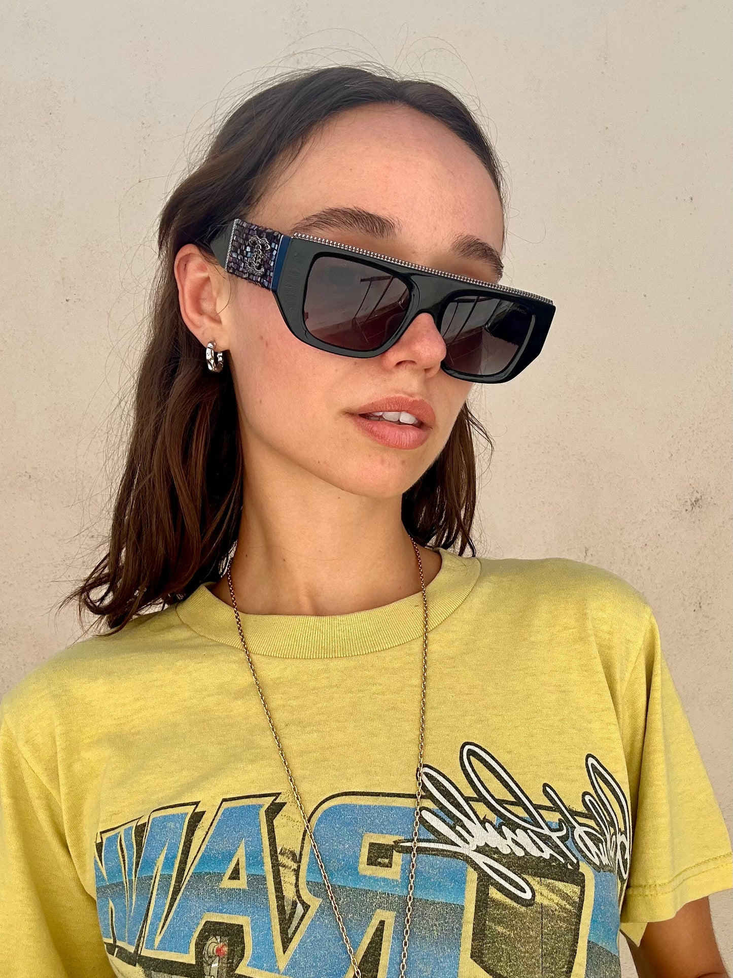 Not your average black frames. These Chanel rectangles bring the drama with a silver chain-link detail across the top and multi-color mosaic arms that turn heads from every angle. Add in the chain-link CC logo at the temple and grey gradient lenses, and you've got a pair that says effortlessly collected. Designed to be noticed—but never loud.