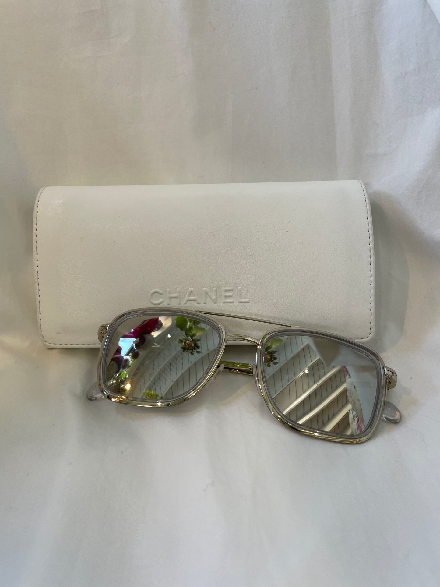 Chanel Silver Frame Pilot Mirrored Sunglasses. A beautiful pair of silver framed sunglasses from Chanel. Adds style to any outfit. Comes with white quilted case. Made in Italy. In good condition with some scratches on both lenses.