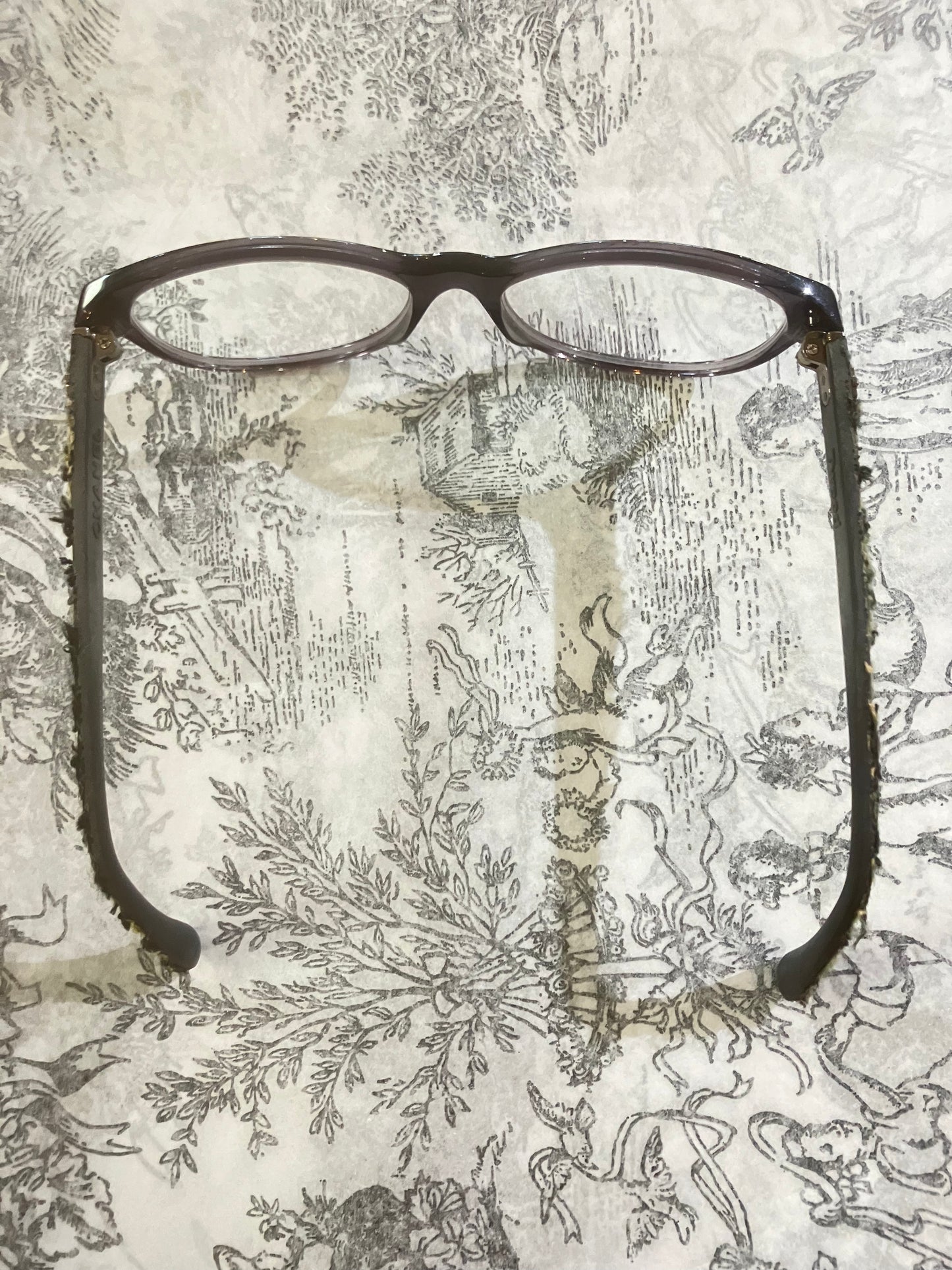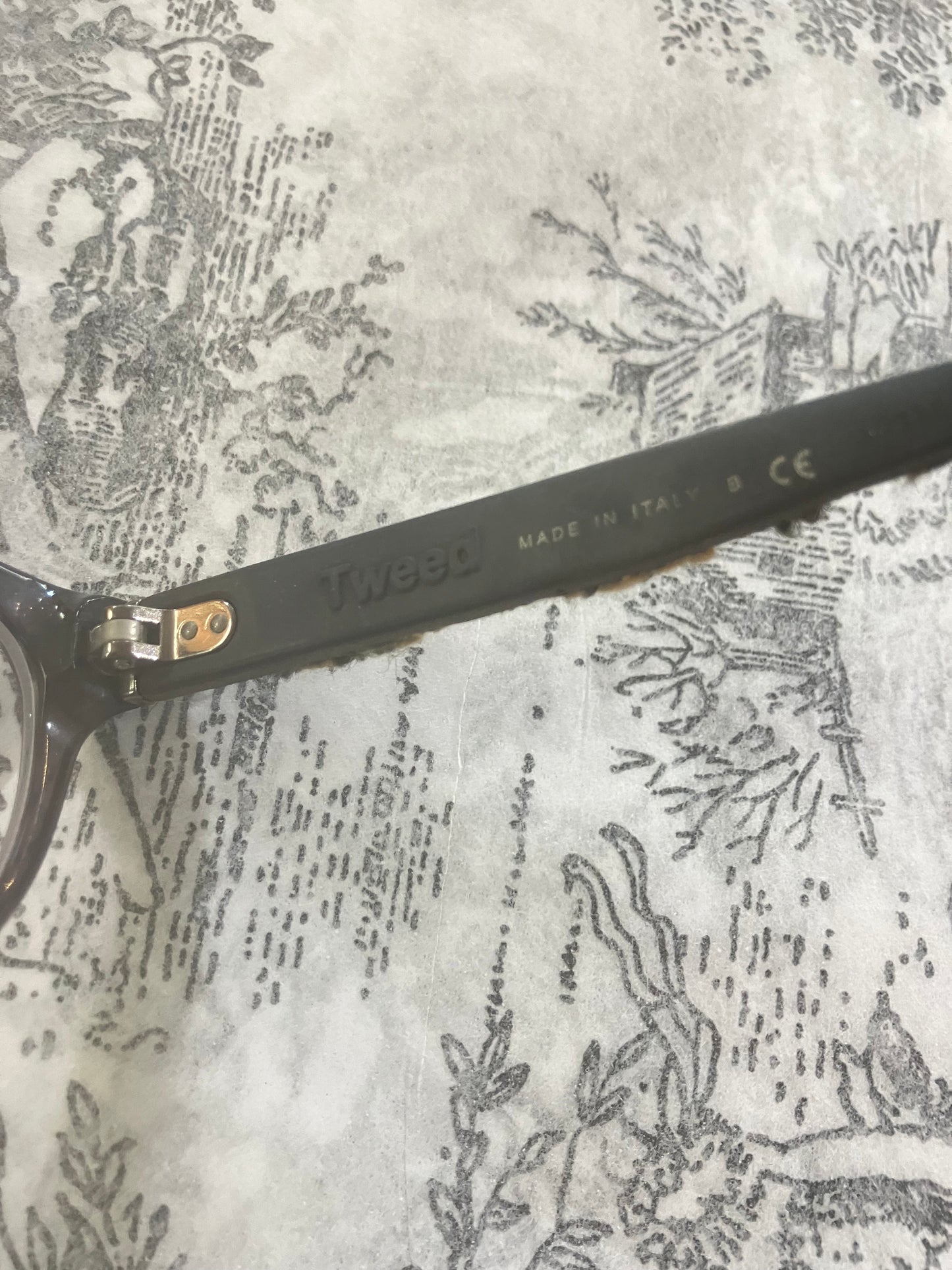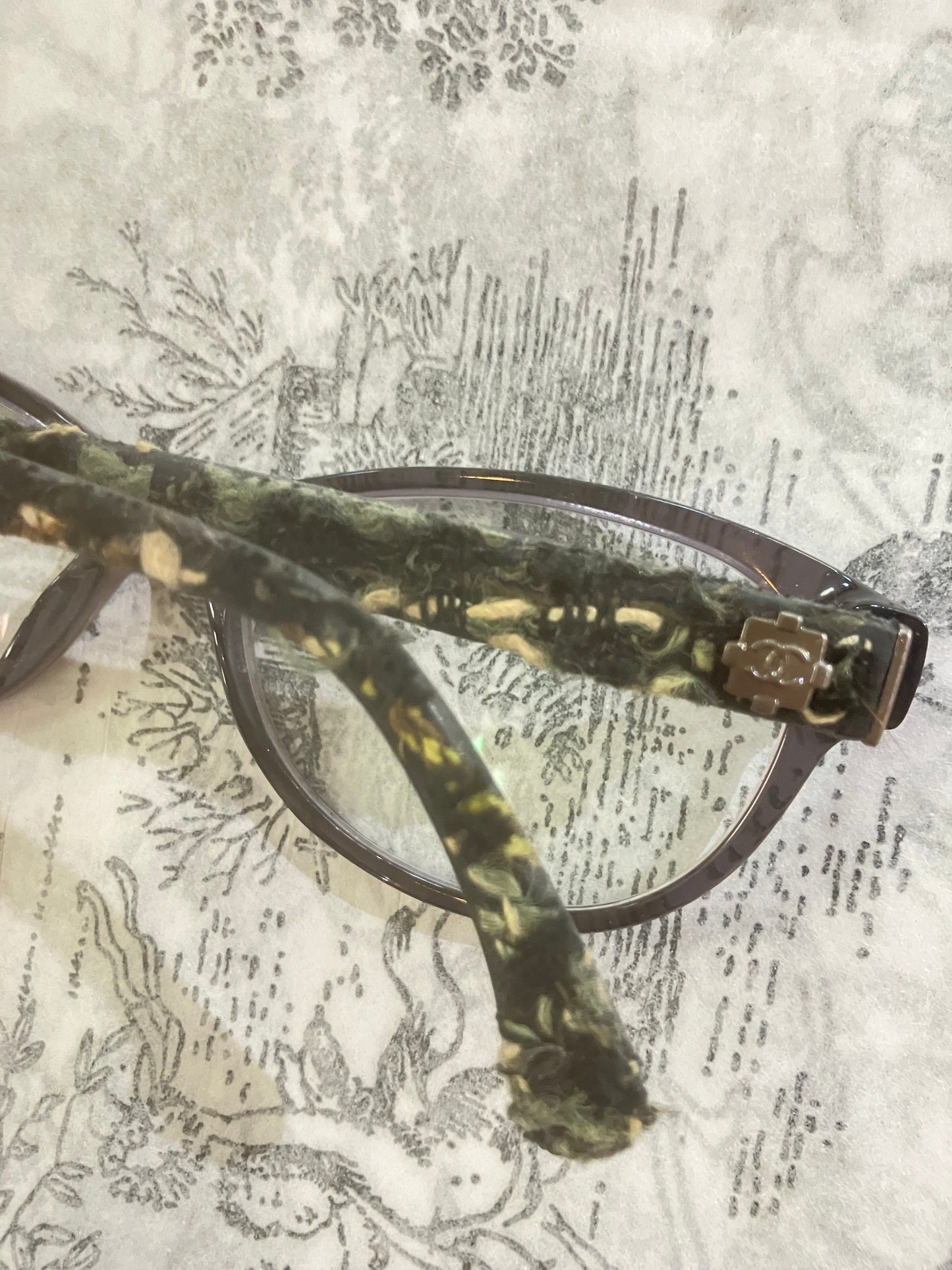 Chanel Black and Green Tweed Glasses. A fun pair of tweed adorned frames in a classic shape. Small signatures embossed in metal accents. Frame is in lovely condition, sort of a charcoal, not quite black. Lenses display wear and will need replacing. Sold as is. Comes with original box and fabric case showing some wear.