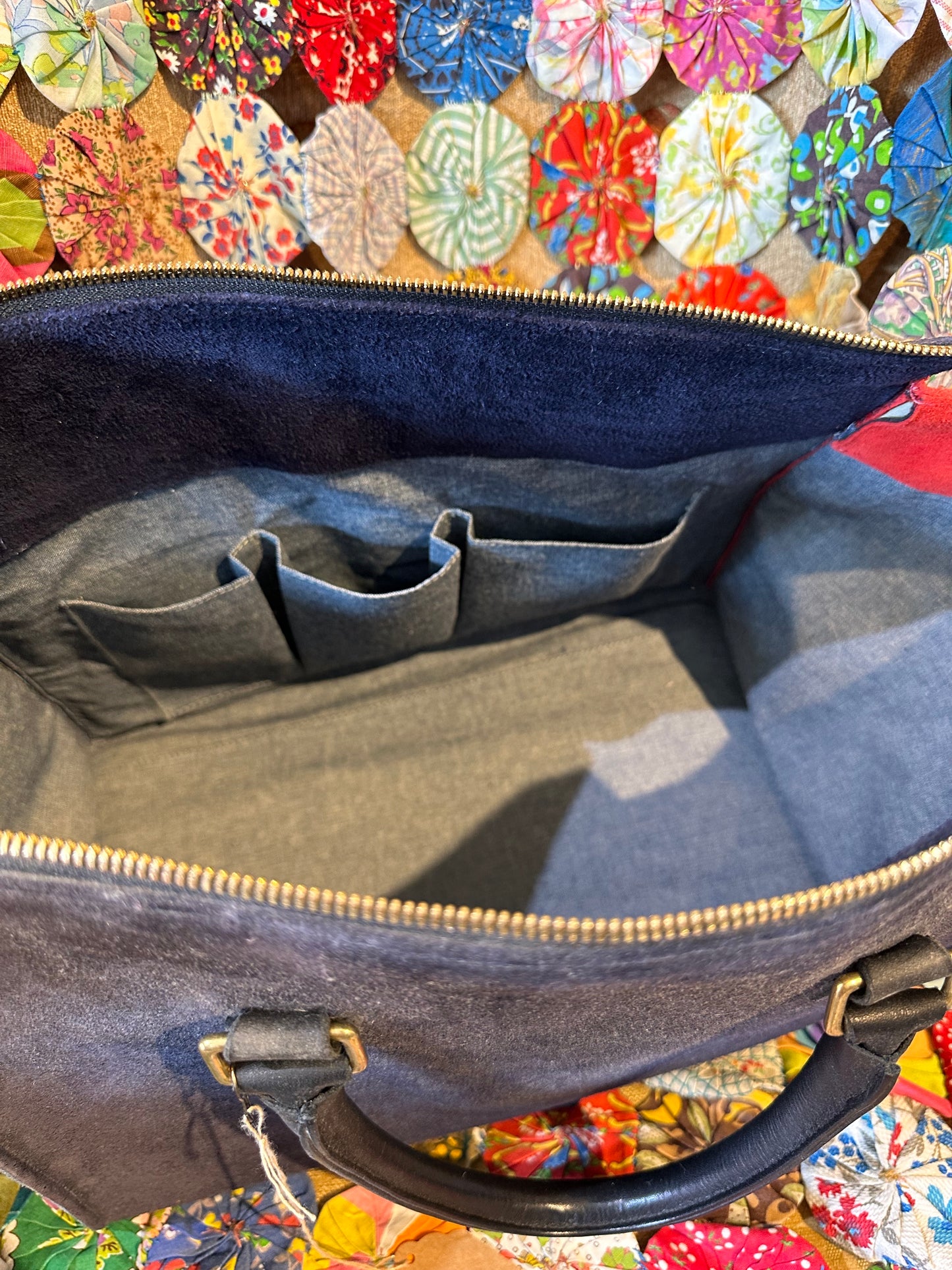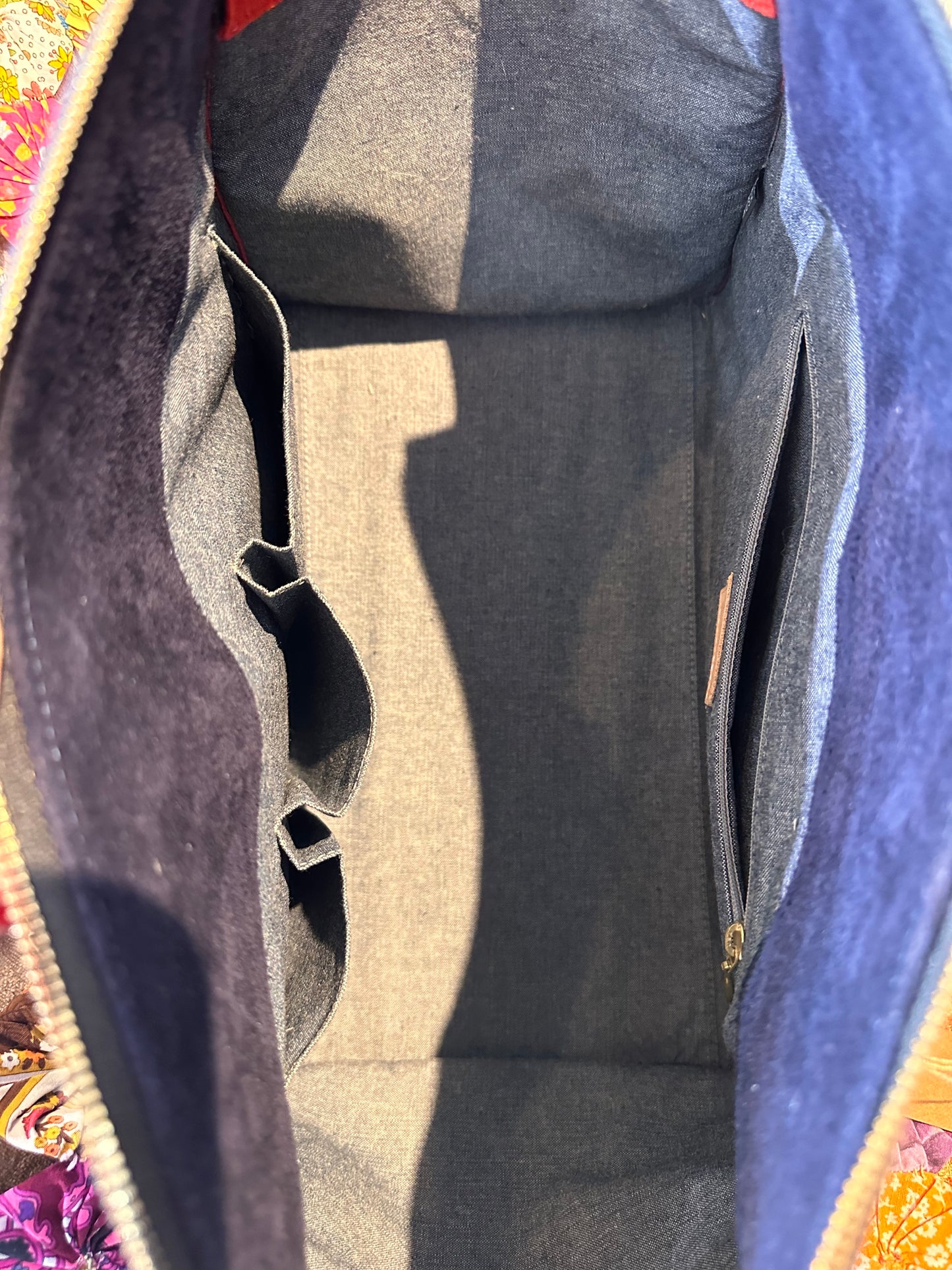 Clare V. Colorblock Suede Handbag. Red blue and navy. Gold hardware and chambray interior. Interior includes three open pockets and one zipper pocket. Made in the USA. Some slight fading, sold as-is.
