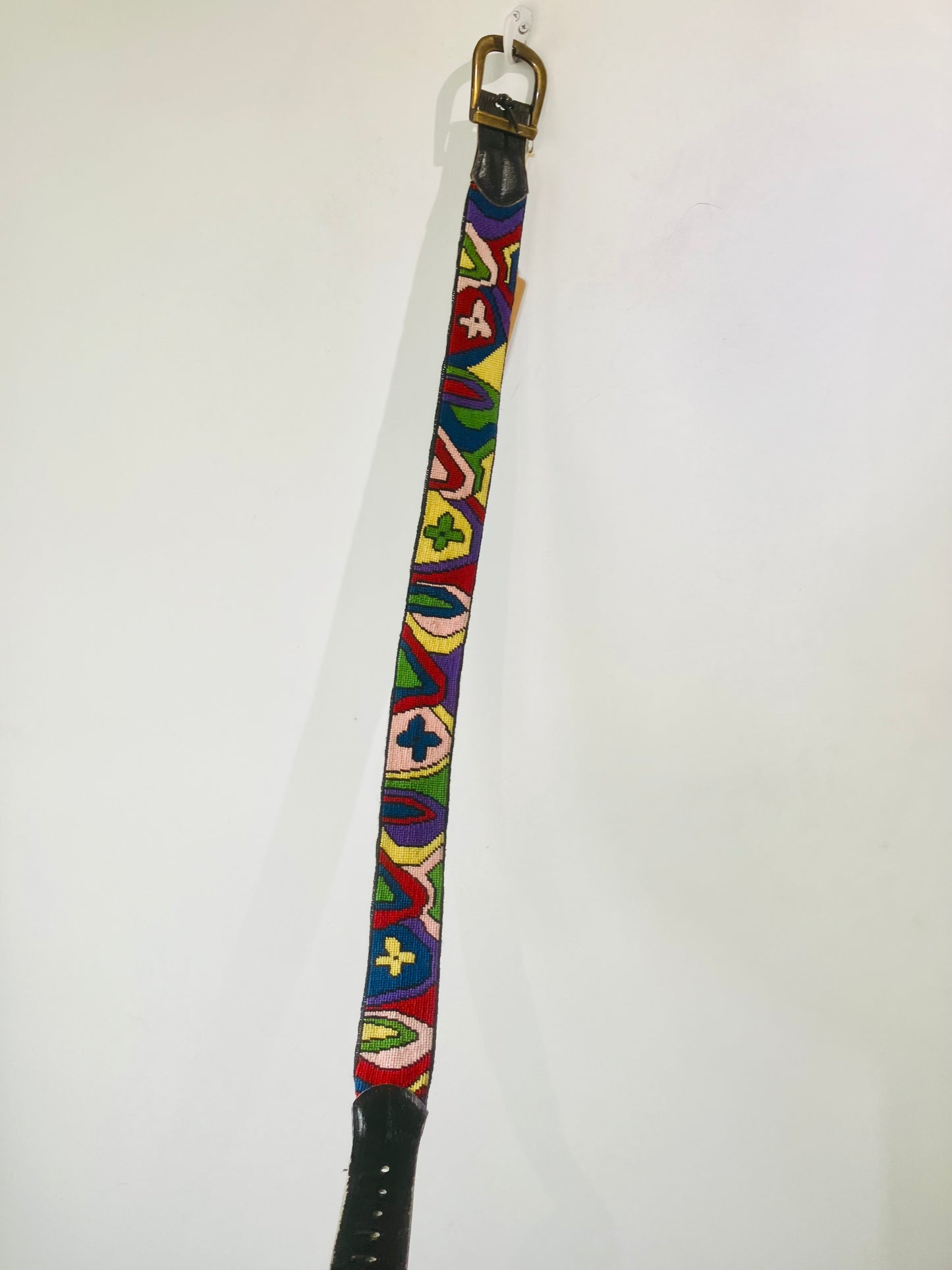 Vintage Rainbow Needlepoint Leather Belt in great condition. Silver buckle on leather base with pristine and beautiful needlepoint.