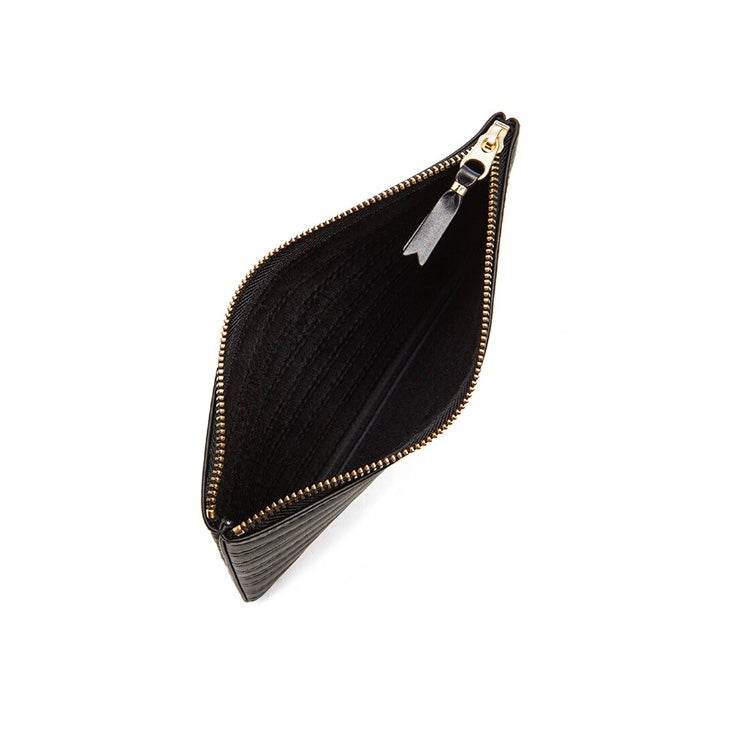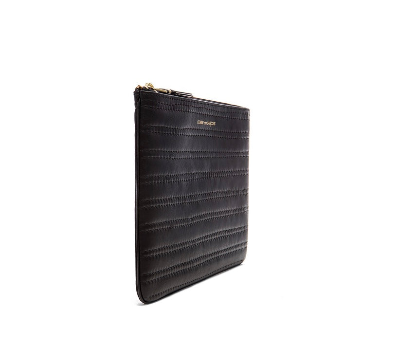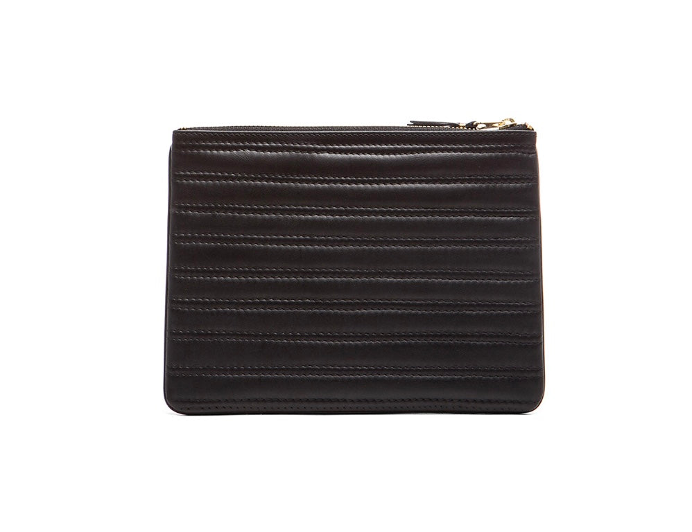 COMME des GARÇONS gives a fresh twist to a house classic with this chic and timeless pouch zip wallet. Crafted from smooth black leather, it’s accented with sleek horizontal stitching and finished with a gleaming gold zipper up top. A discreet signature stamp keeps the branding minimal, letting the design speak for itself-quiet luxury at its most functional. In excellent condition, wallet is free of notable flaws.