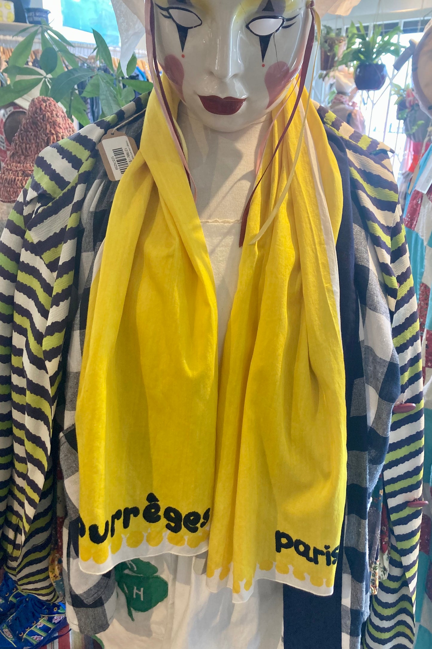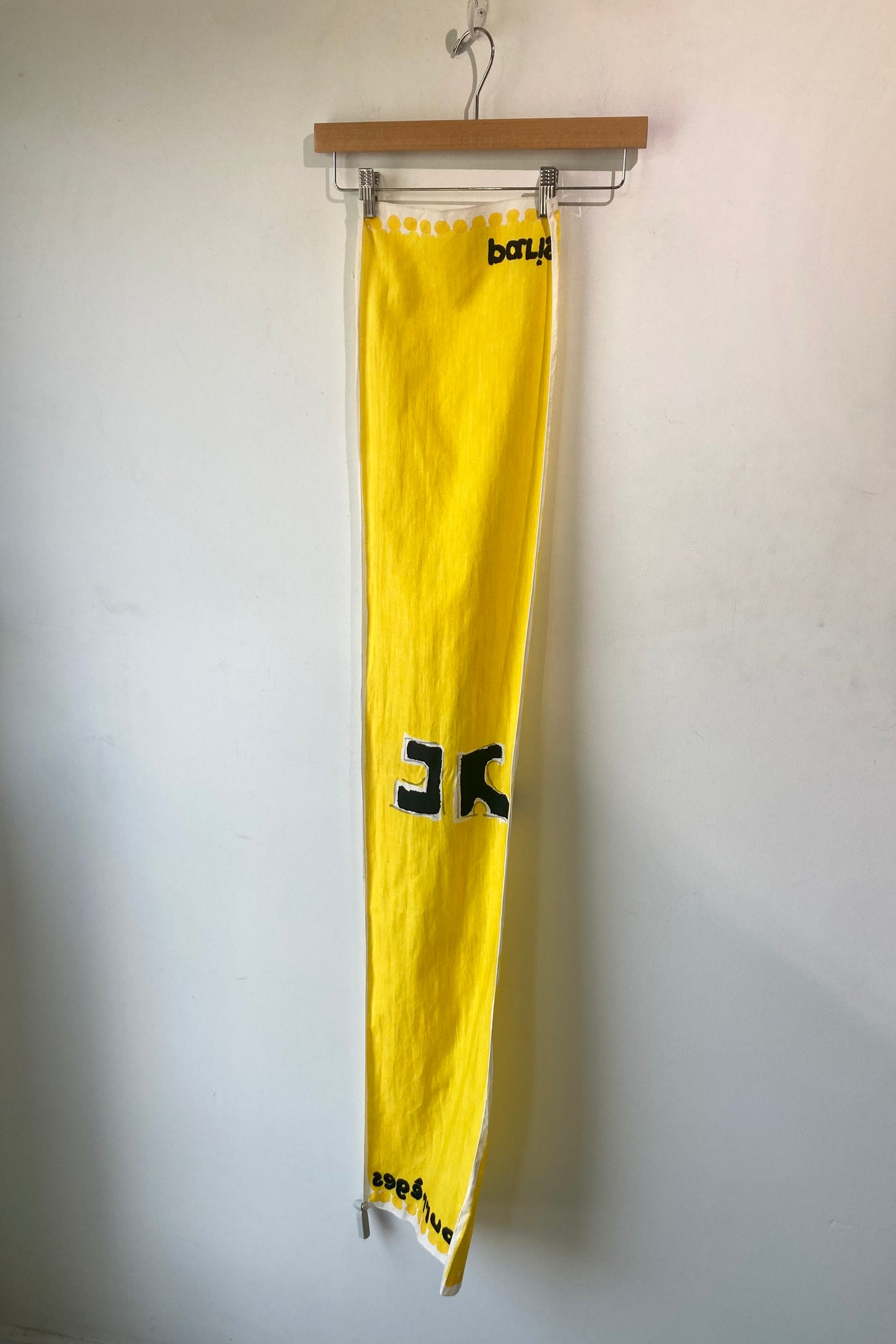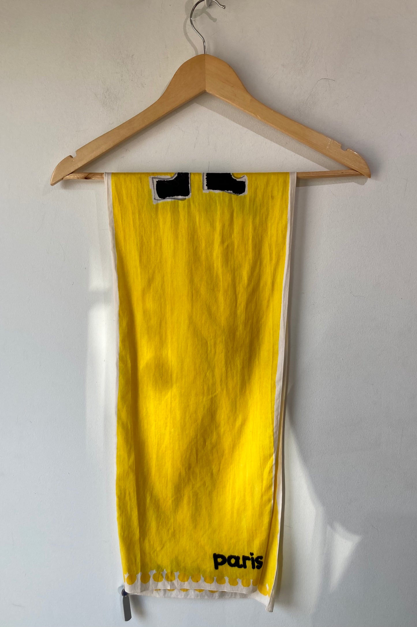 Courreges Yellow Cotton Scarf in really great condition, one minor spot (last picture). Perfect lightweight summery accent to neck, hat, hair or bag. Sunny yellow with a dramatic black signature of Paris and Courreges on either end. Gently hand wash cold.