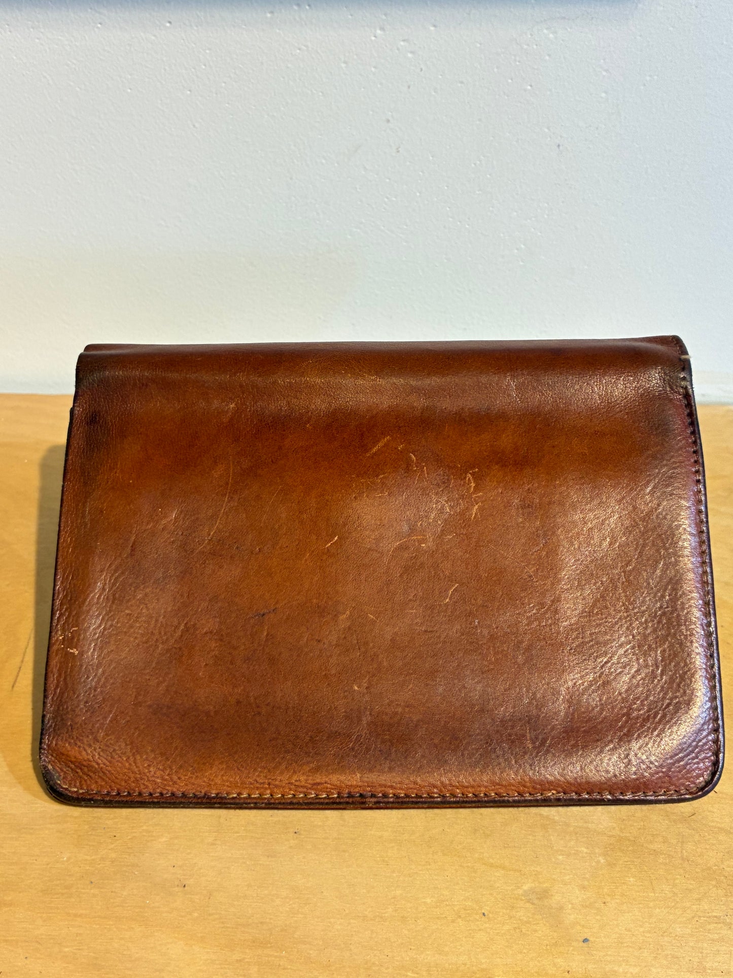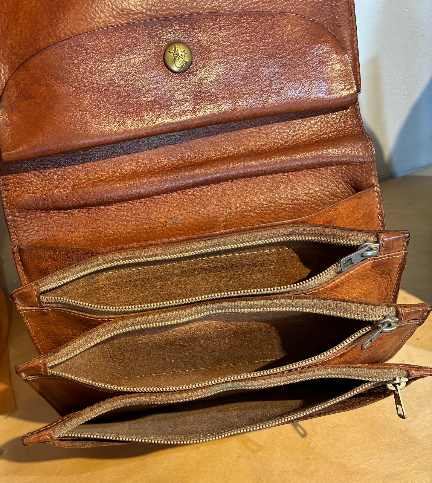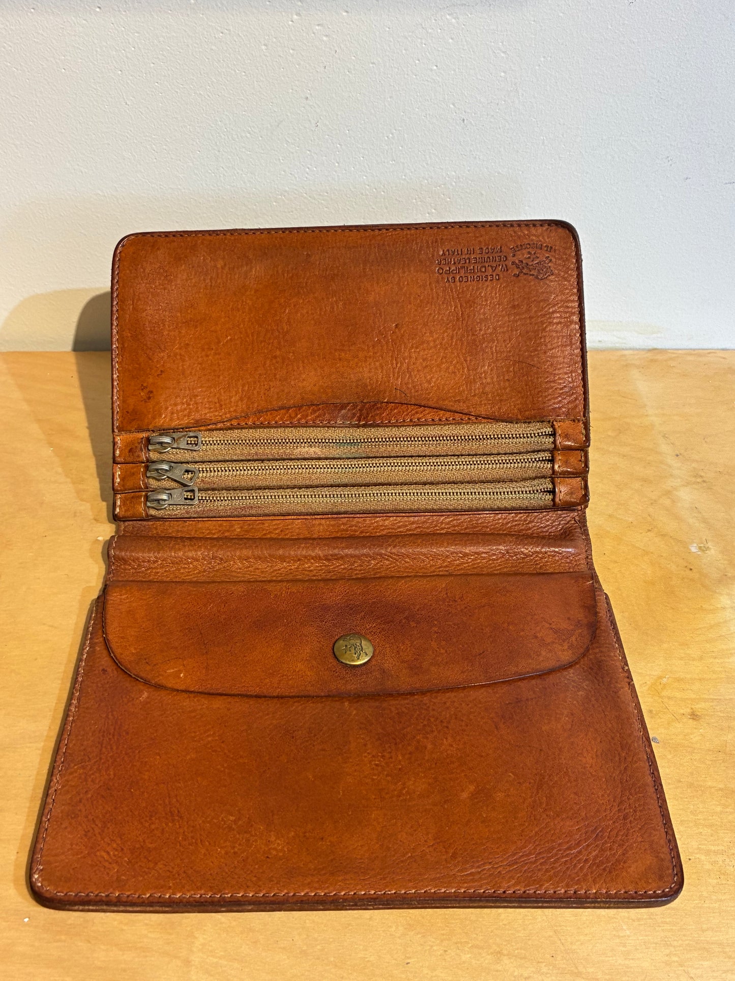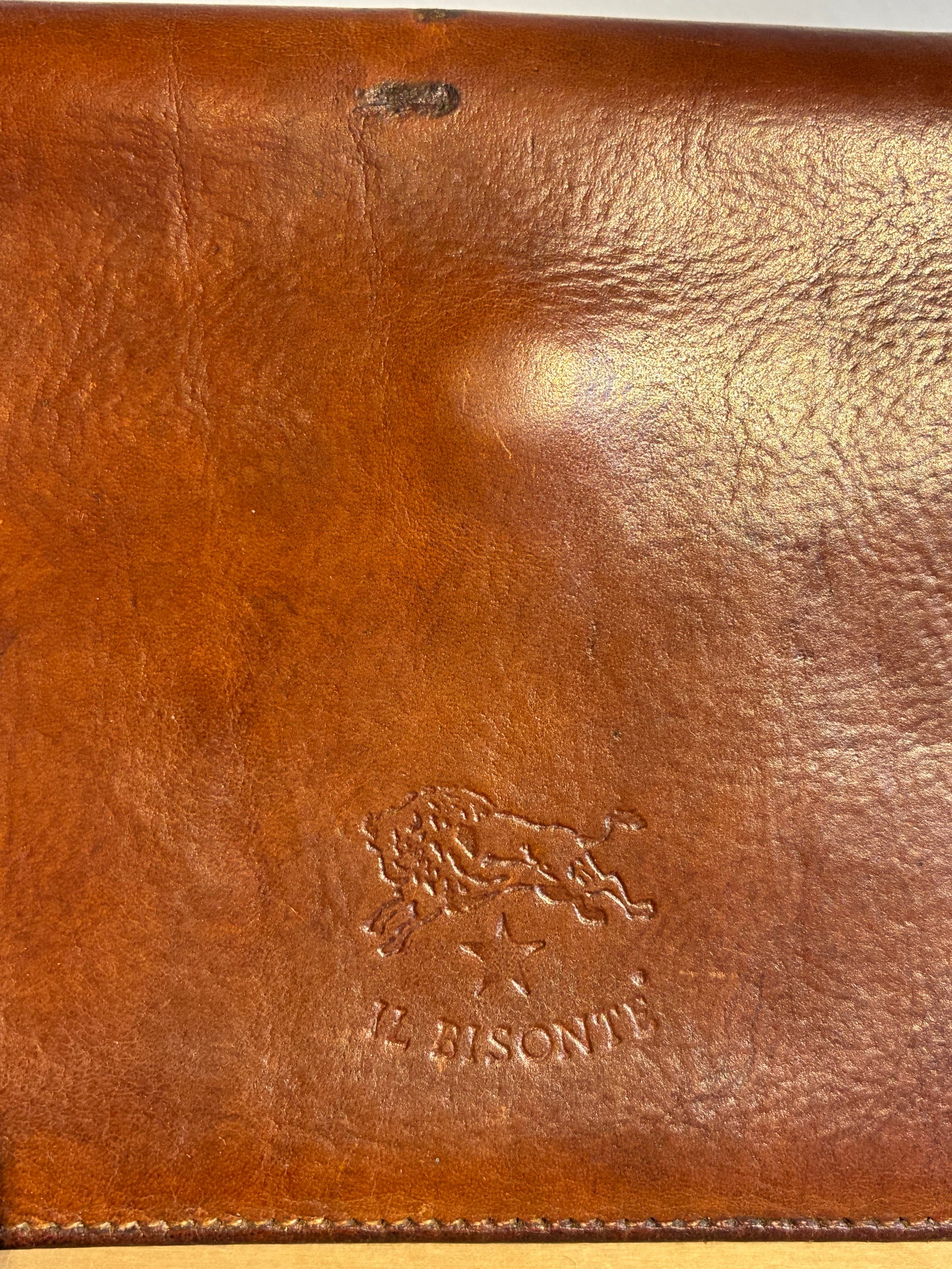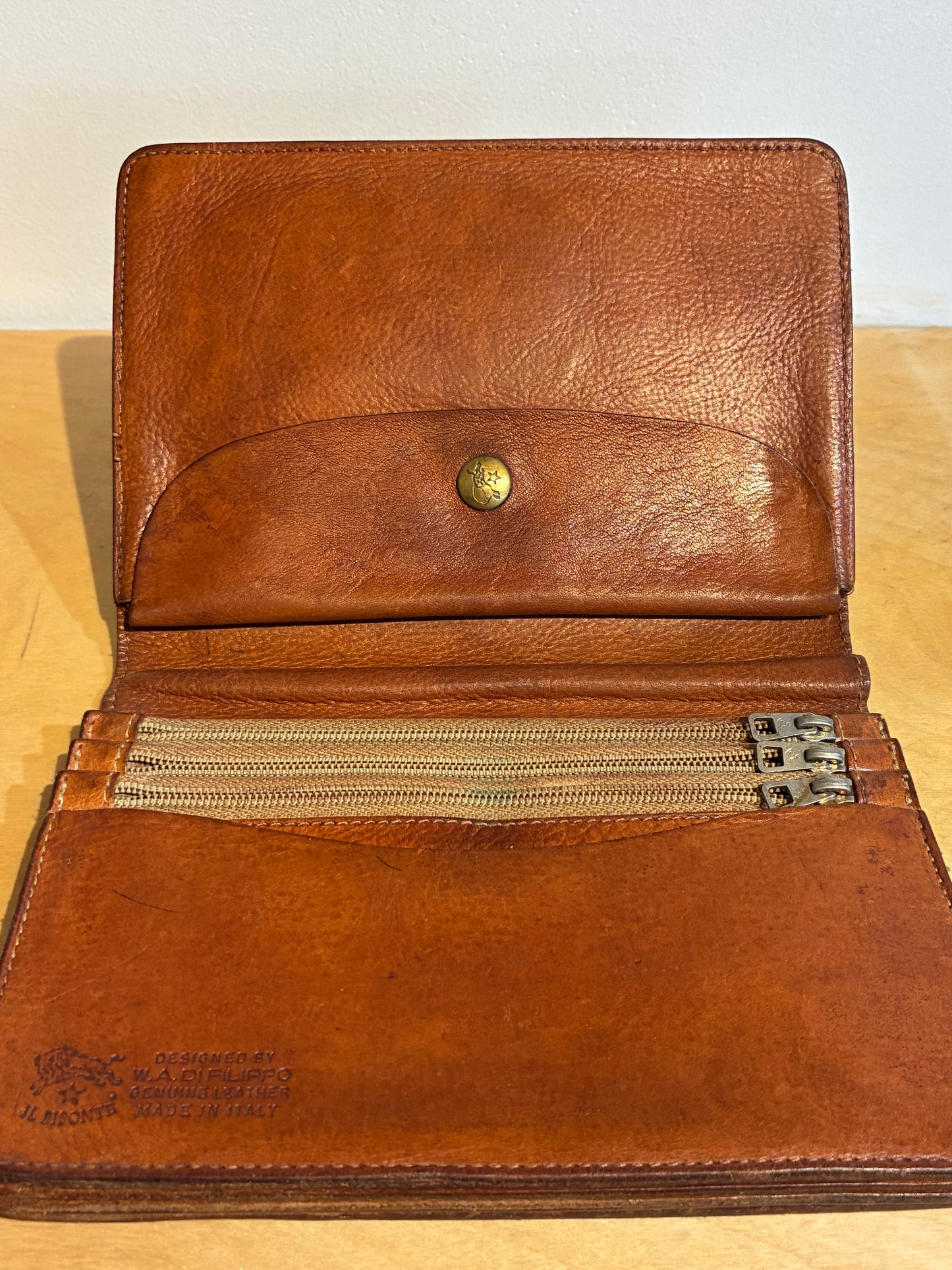 Il Bisonte Cognac Leather Folio Wallet. Featuring a two-fold design, this embossed Italian leather folio wallet has a large snap closure interior pouch, three accordion zip pouches, three hidden pockets and a large top opening for bills, receipts, documents and what have you! Perfect for organizing on the go! The leather has a few discoloration spots on the fold which are a natural part of the leather. Otherwise, wallet is in very good condition and is free of stains and defects.