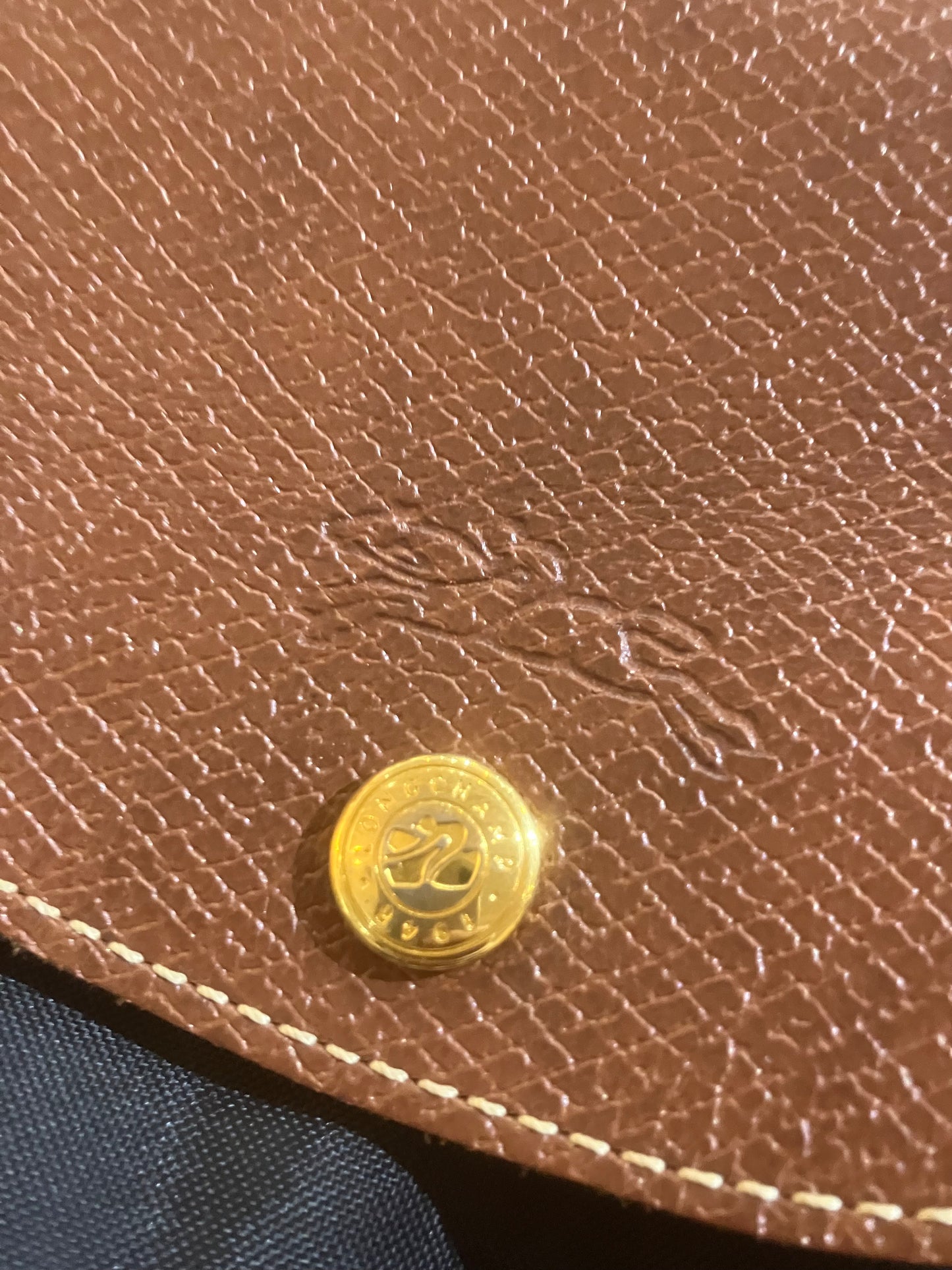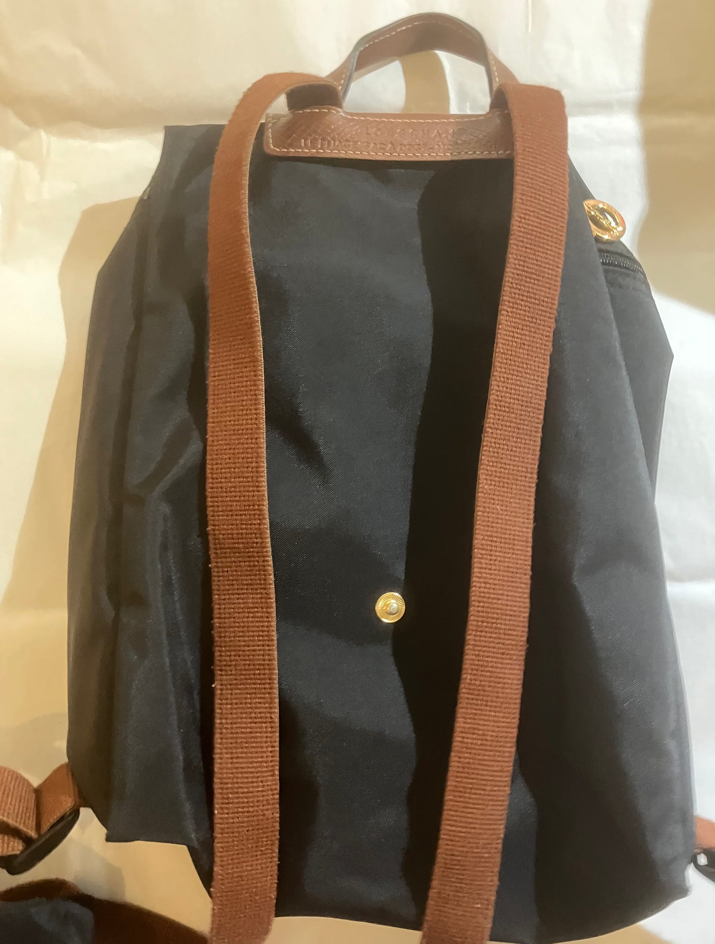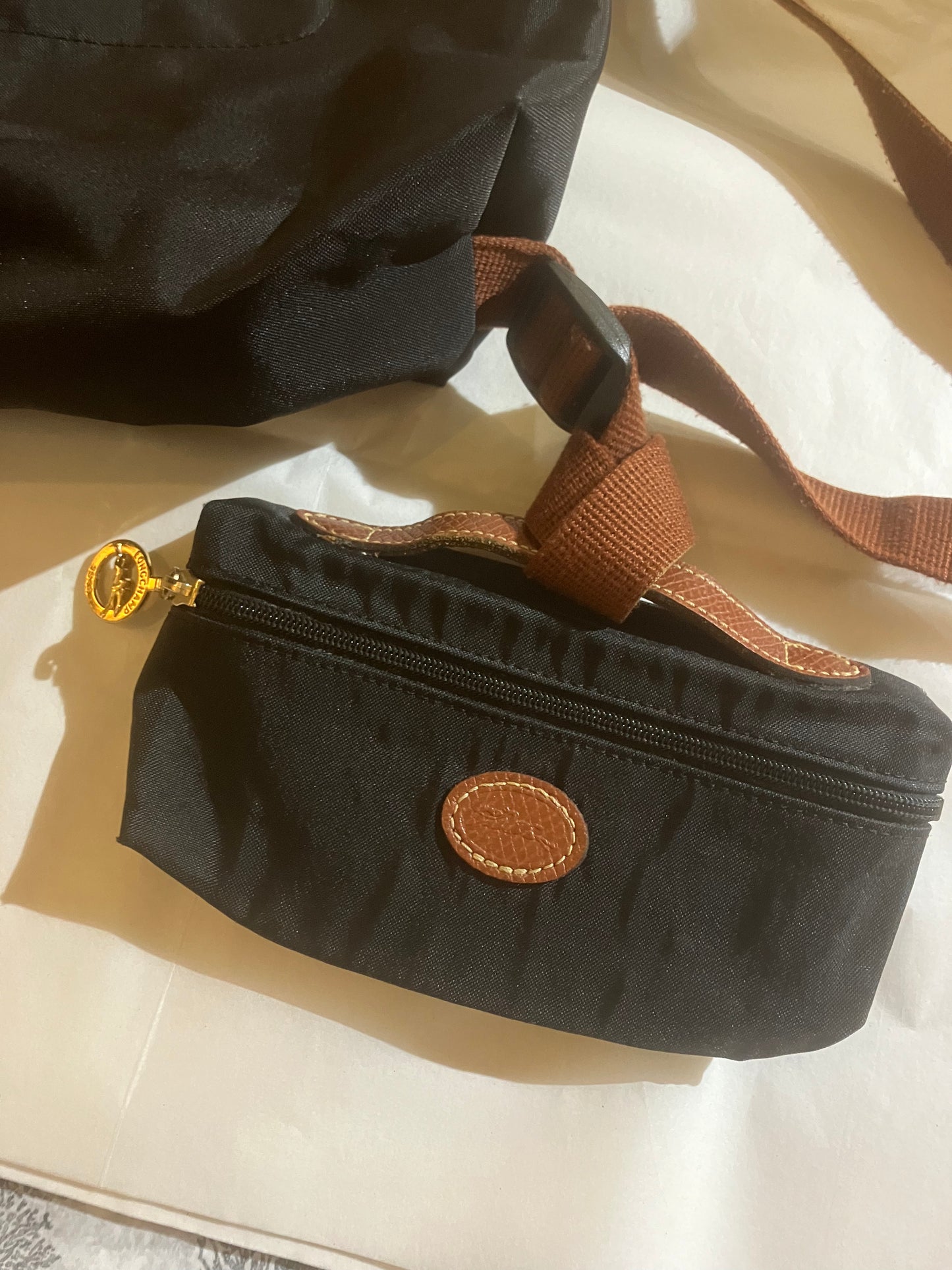 Longchamp Black Backpack w/ Makeup Bag (2 pc.). Like new condition. Longchamp Le Pliage collection. Heavy nylon with tan grained leather trim. Zip top closure. Goldtone hardware.