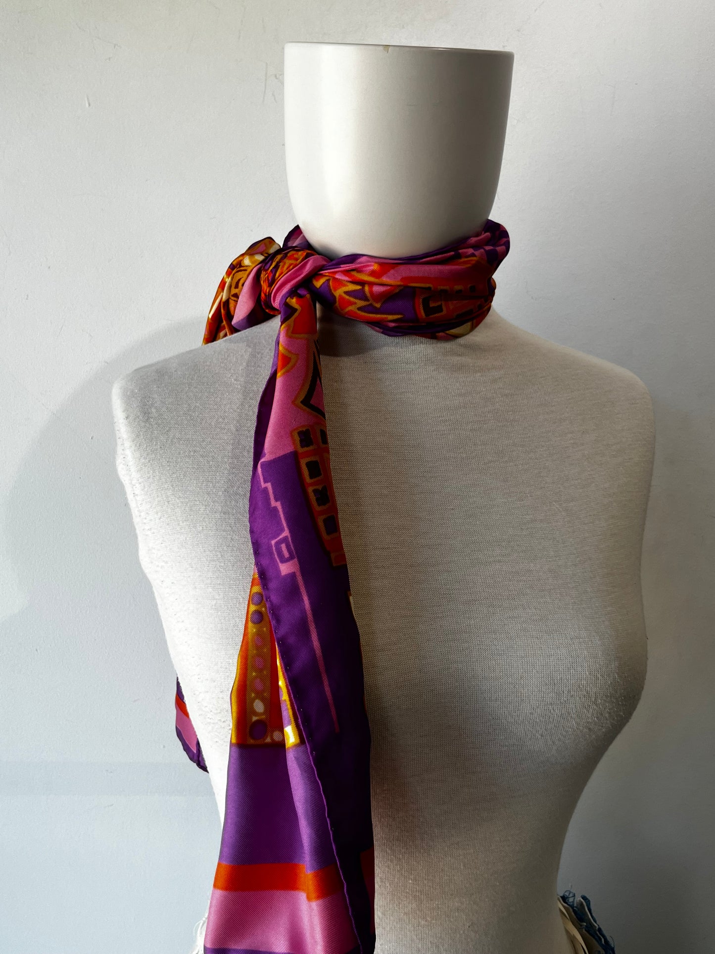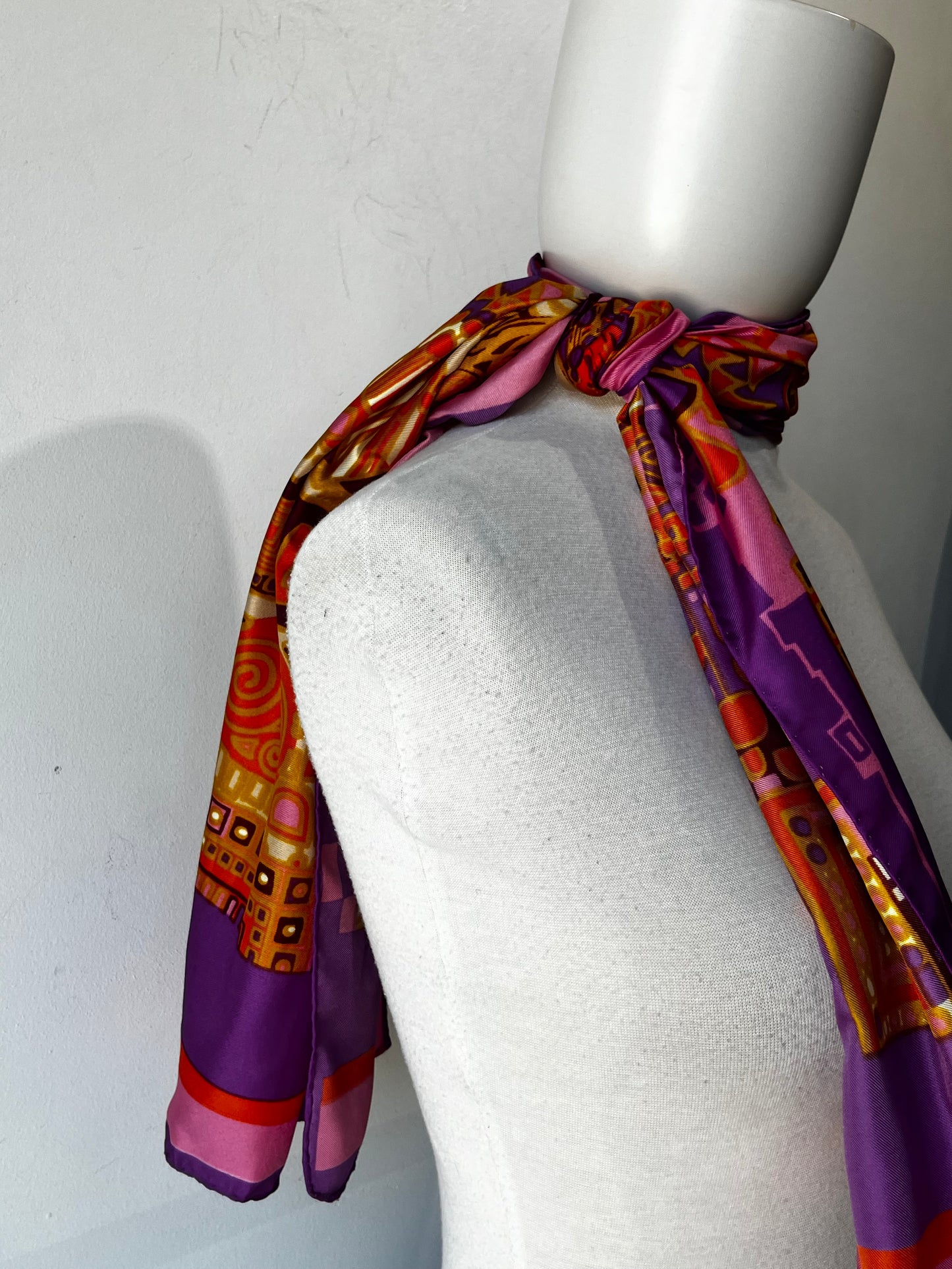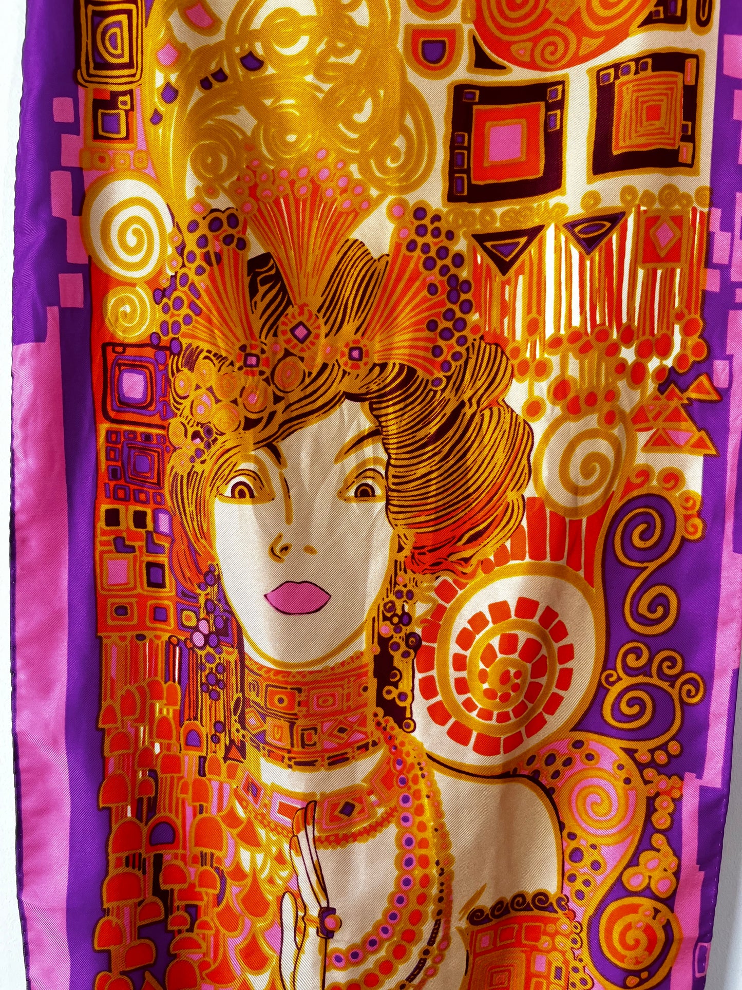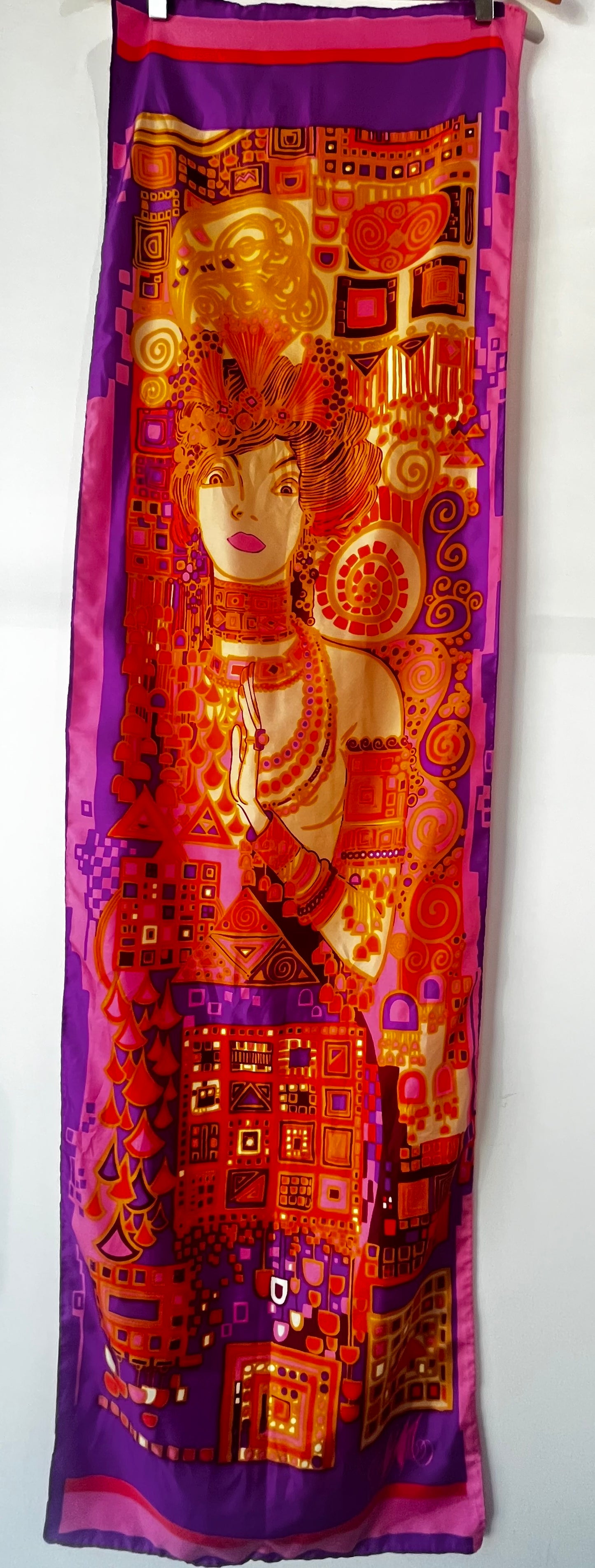 Purple, Pink and Orange Psychedelic Hypnotic Woman Scarf. Hypnotic, psychedelic and far out! This colorful and playful scarf features a large scale graphic of a 1960s/1970s dame with all the groovy detail one could ever hope for! Scarf is in excellent condition and is free of stains, tears and defects.