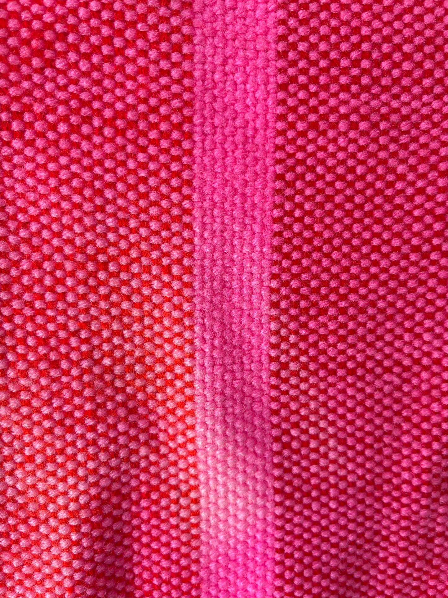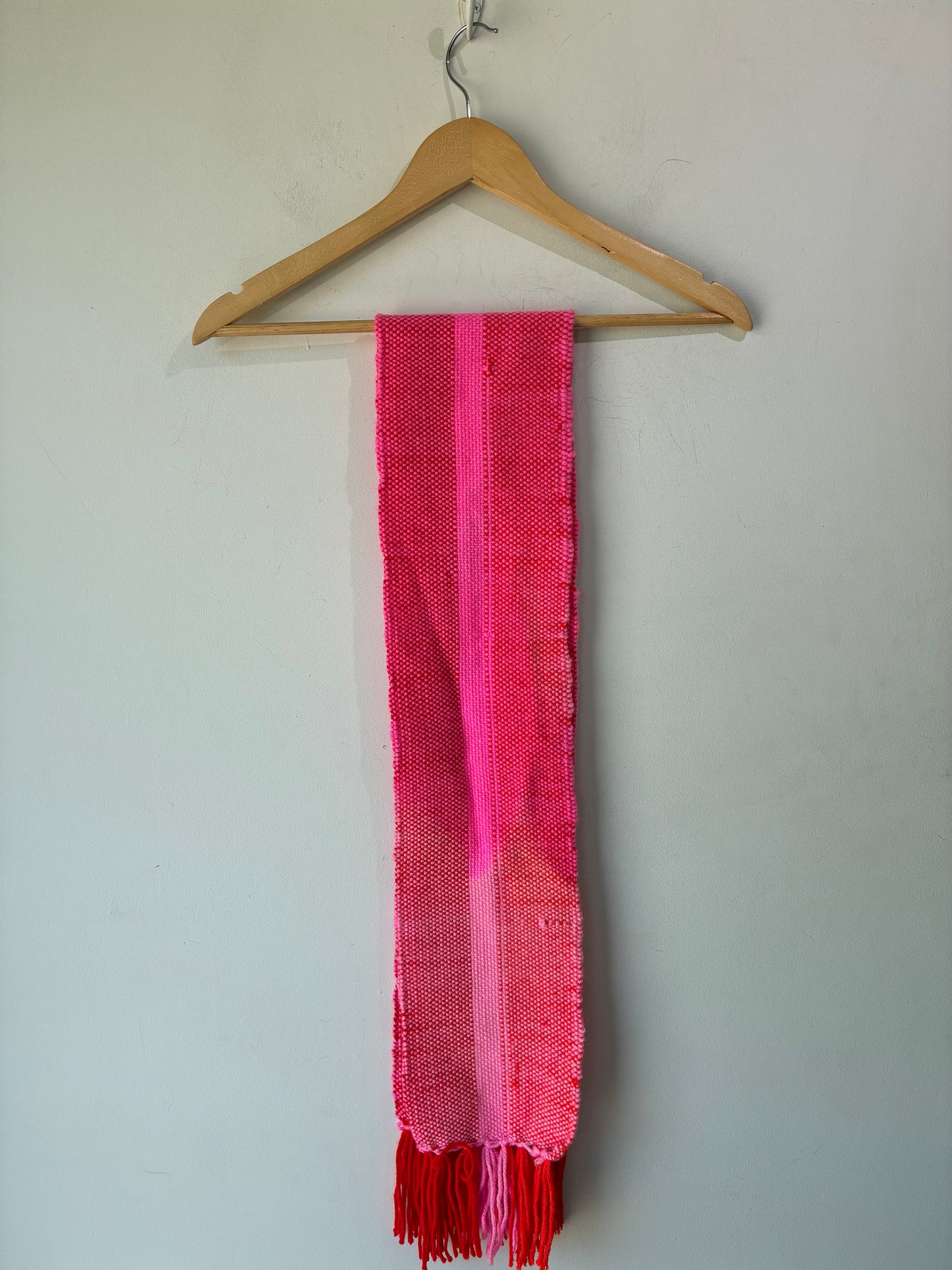 Red and Pink Woven Knit Scarf. Add a splash of color and keep comfy on those chilly days with this adorable and cheerful woven scarf! Bright red and pink cotton/wool yarn check weave with a pink center stripe and tasseled fringe combine to make this cutie! Scarf is in very good condition, there is some discoloration due to the yarn dye process, which adds to the charm and patina.