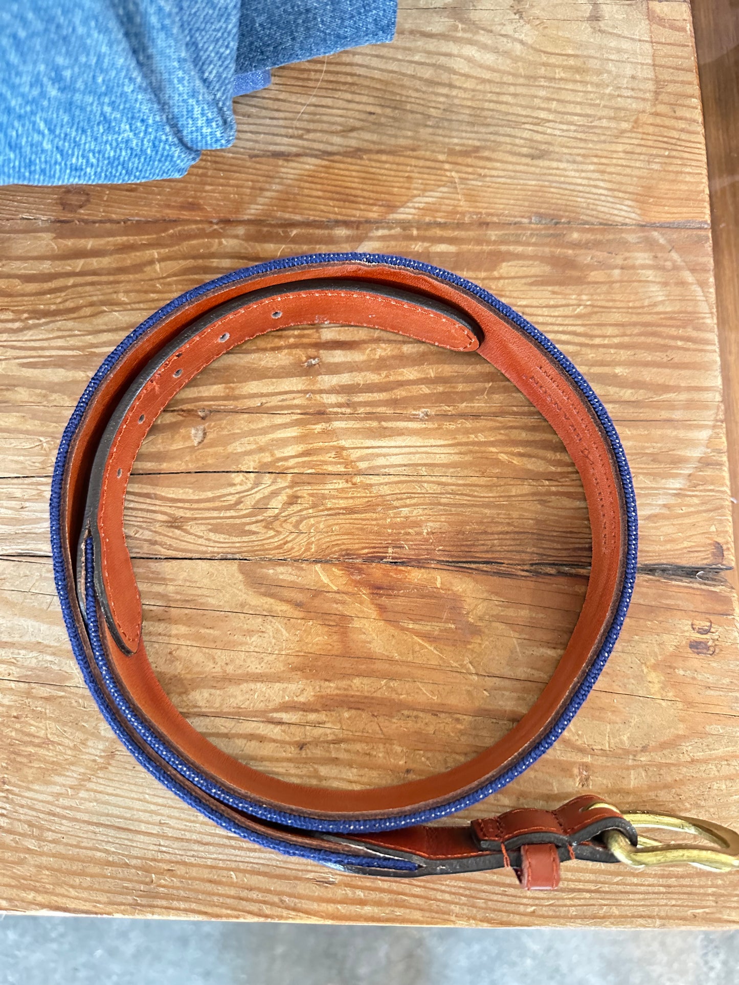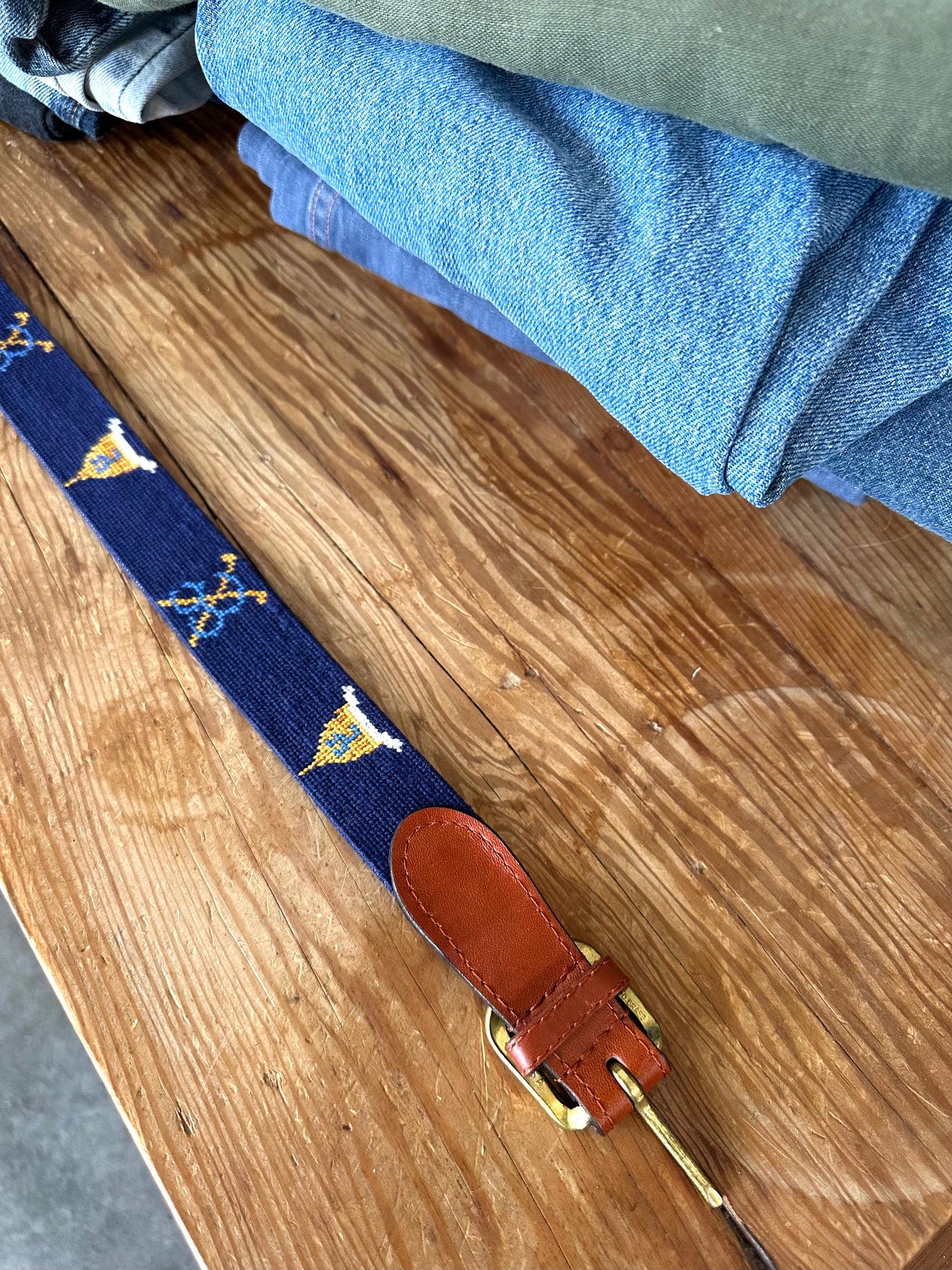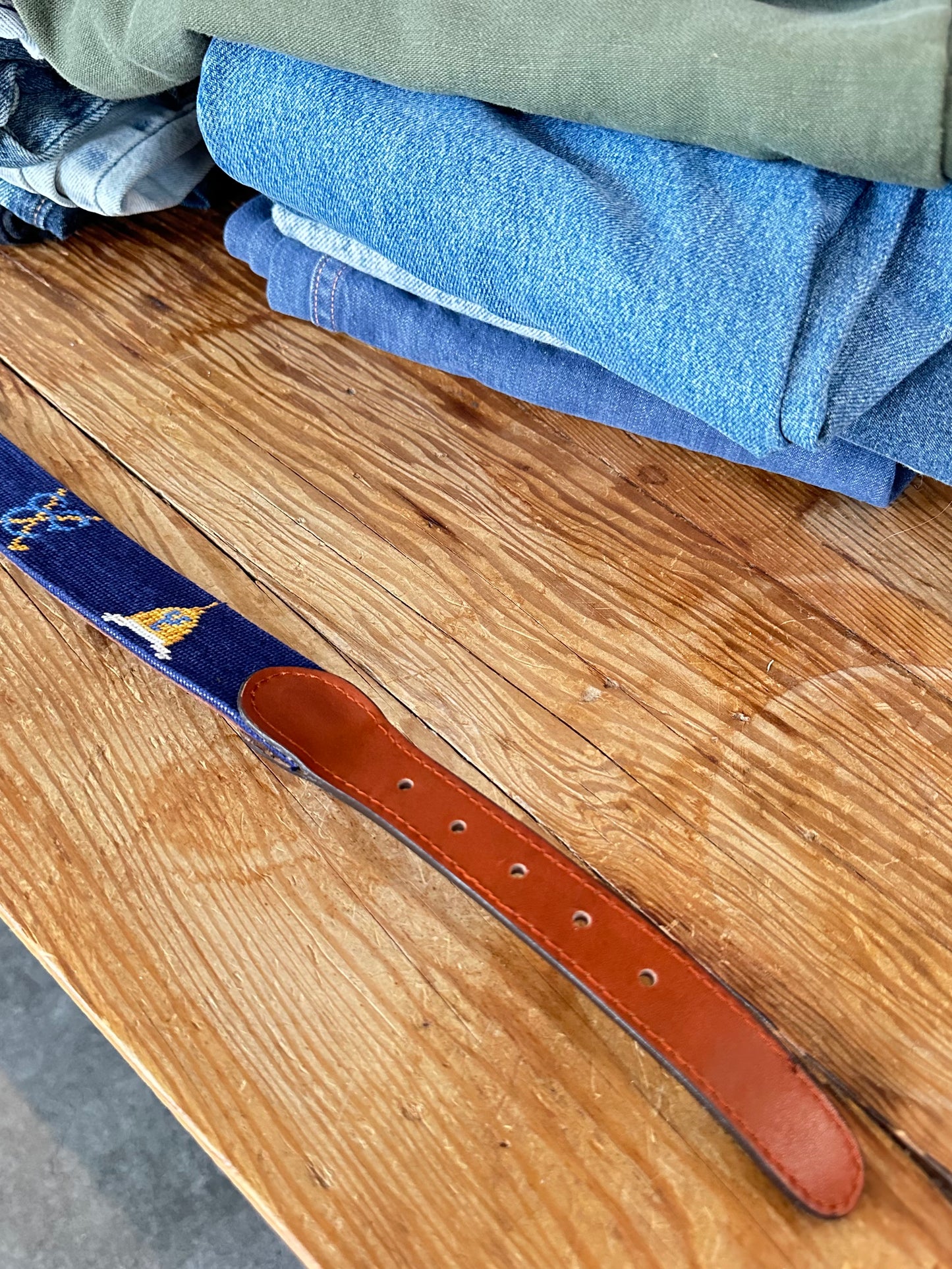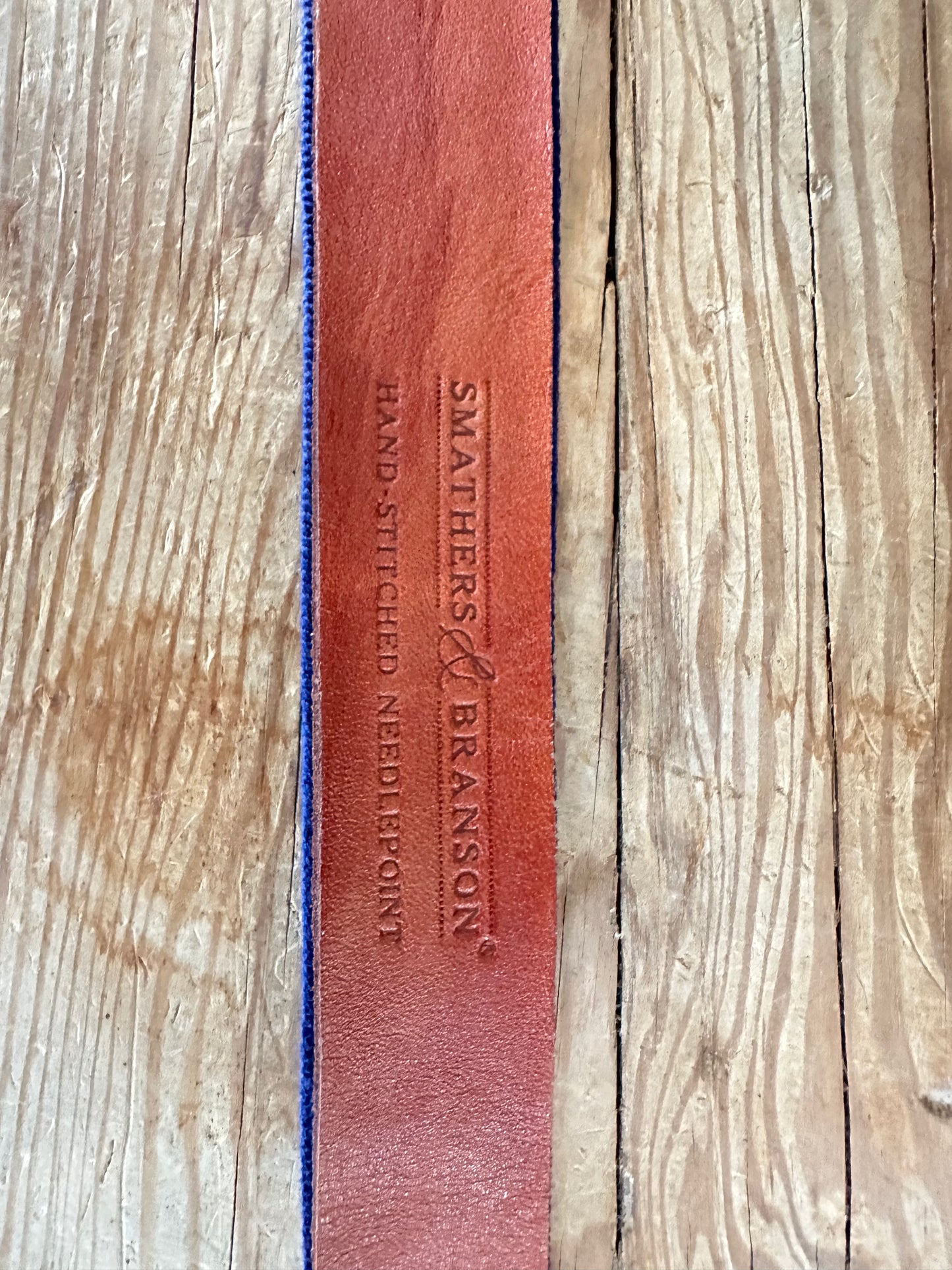 A hand-stitched navy needlepoint belt by Smathers & Branson, with a warm brown leather. The belt has a classic and preppy feel with the outdoorsy motifs.