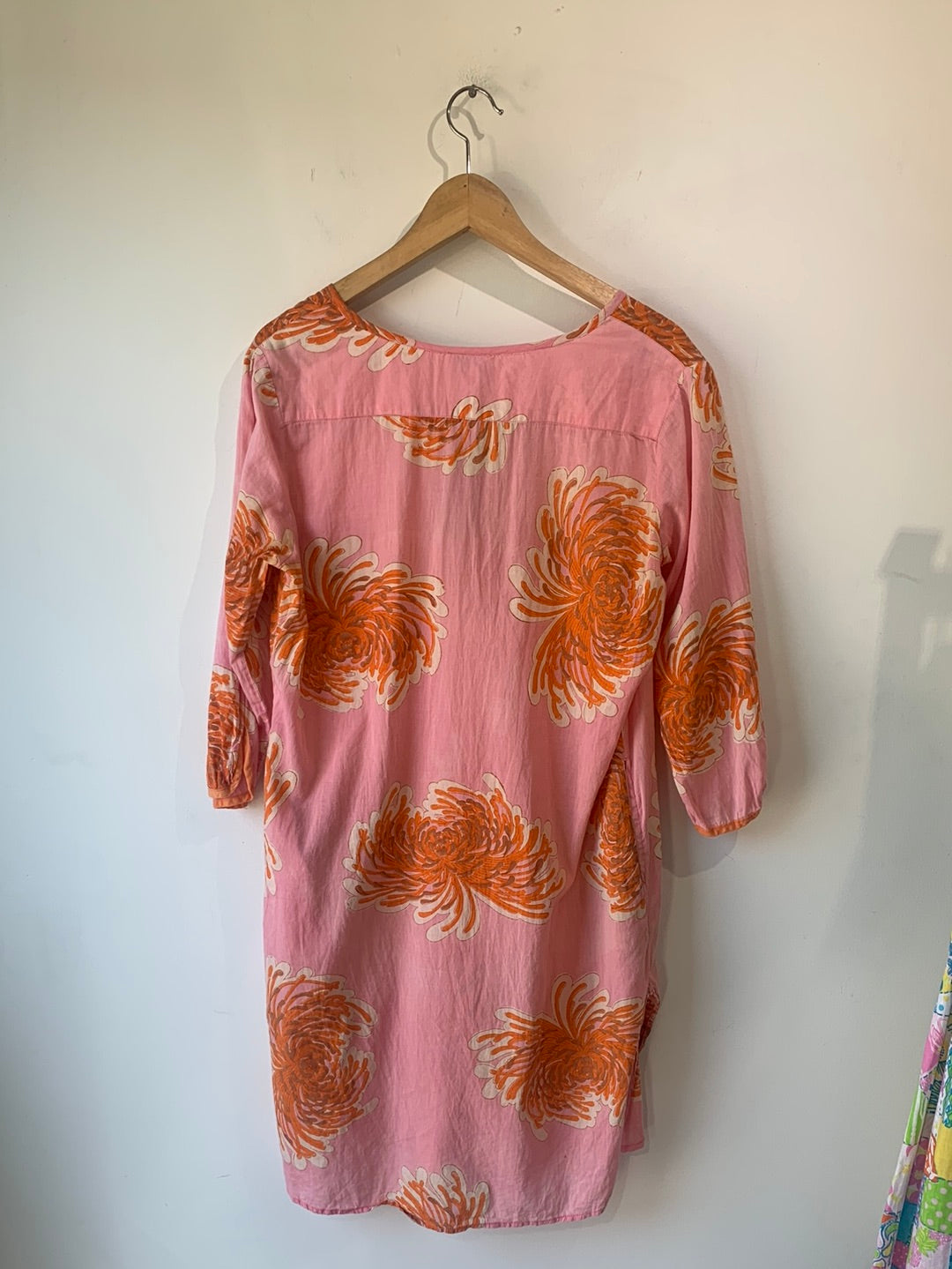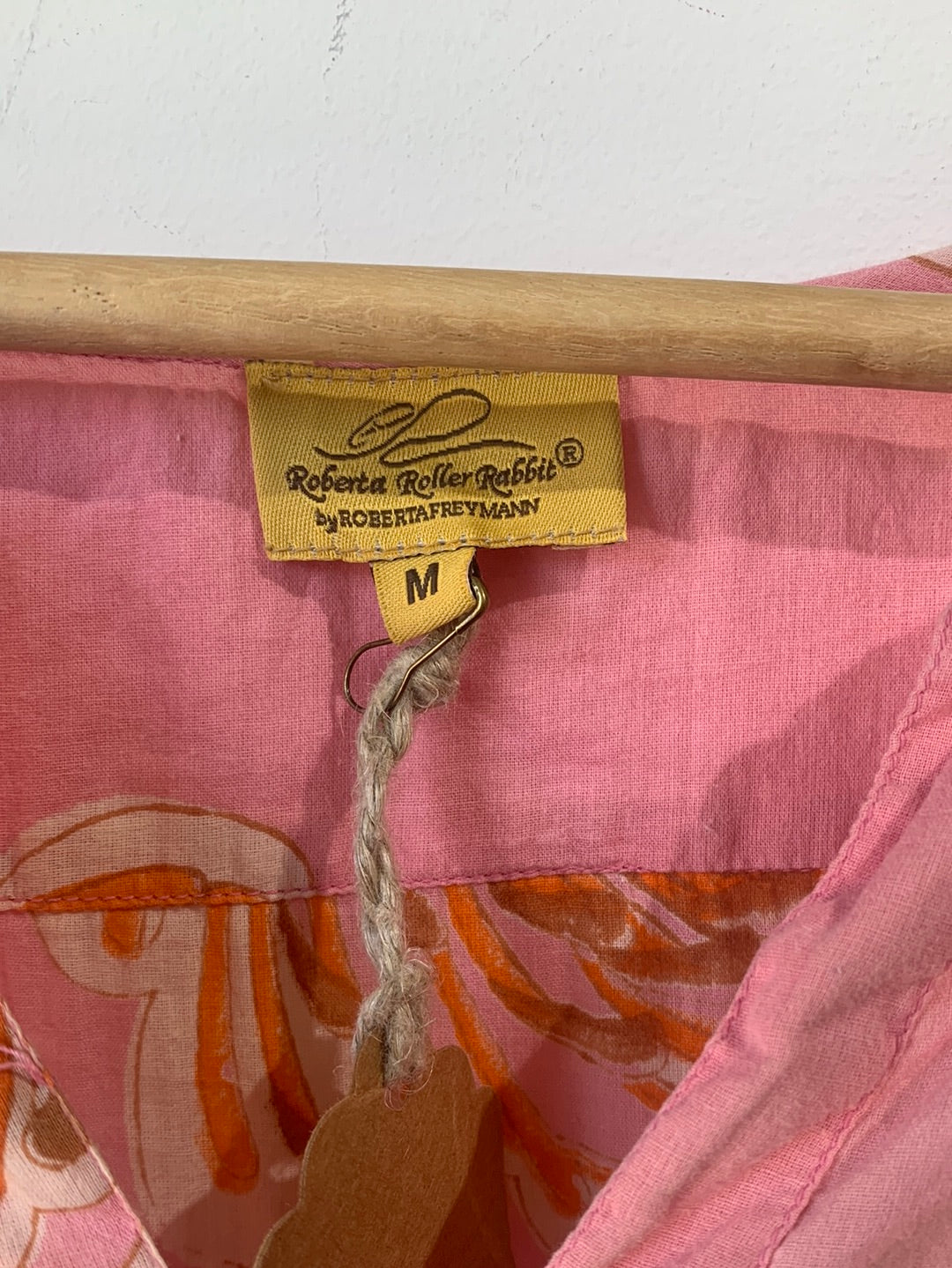 Roberta Roller Rabbit Pink Tunic With Orange Flowers. Light weight, 100% cotton. Three-quarter length sleeves. Flowy cut, slits going up either side. Has pockets. Would make a great beach cover up! Excellent vintage condition, marked size M.