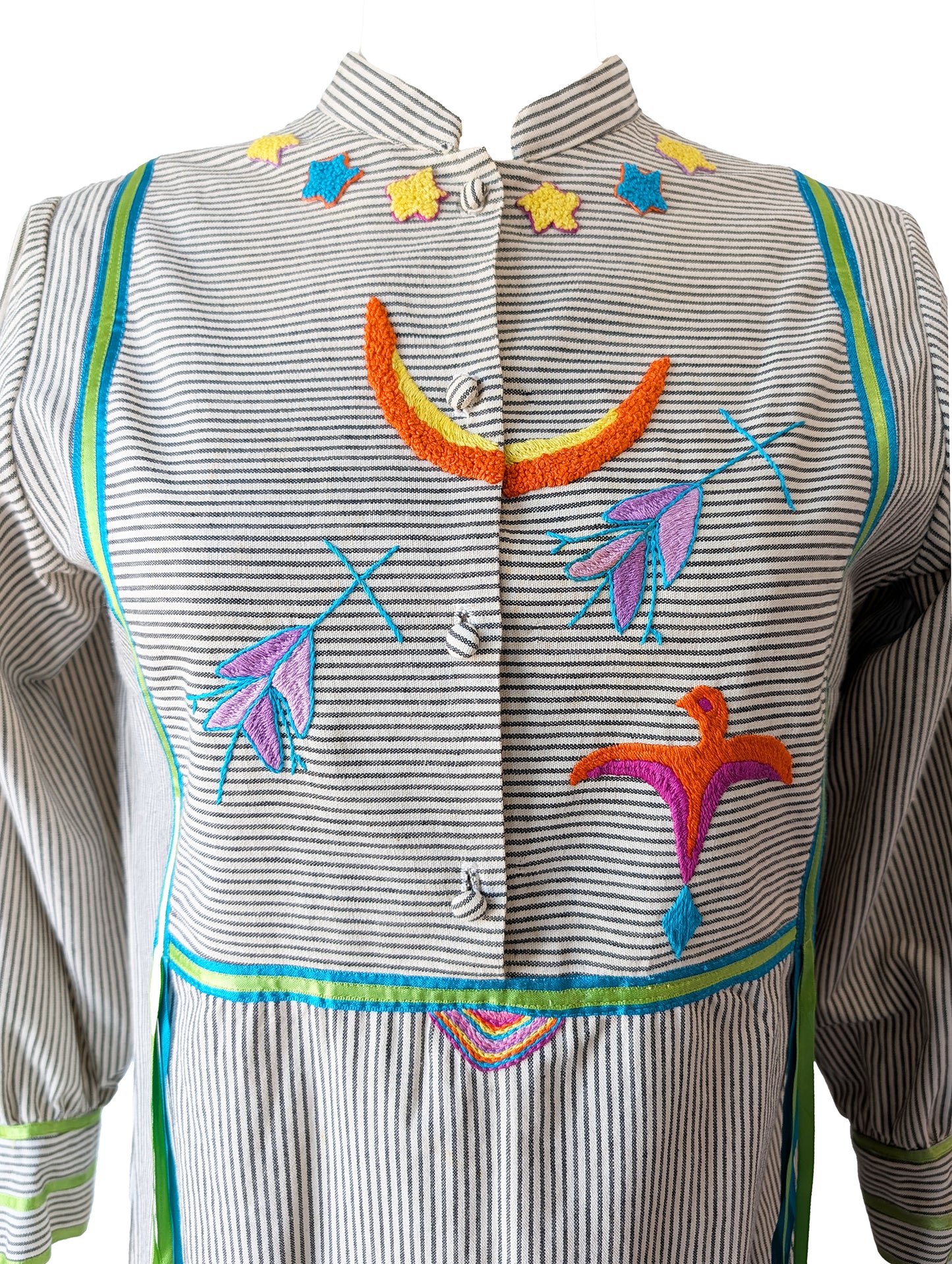 Classic stripes meet joyful motifs in this hand-embroidered Josefa dress. Brightly stitched moons, stars, and birds pop against soft, weighty black-and-white cotton, each shape unique in that unmistakably handmade way. Finished with fluttering contrast ribbon trim, fabric-covered buttons, and stripe-play cuffs, it’s a piece that celebrates the hand that made it and the personality that wears it. Dress is in excellent worn condition and is free of notable flaws.