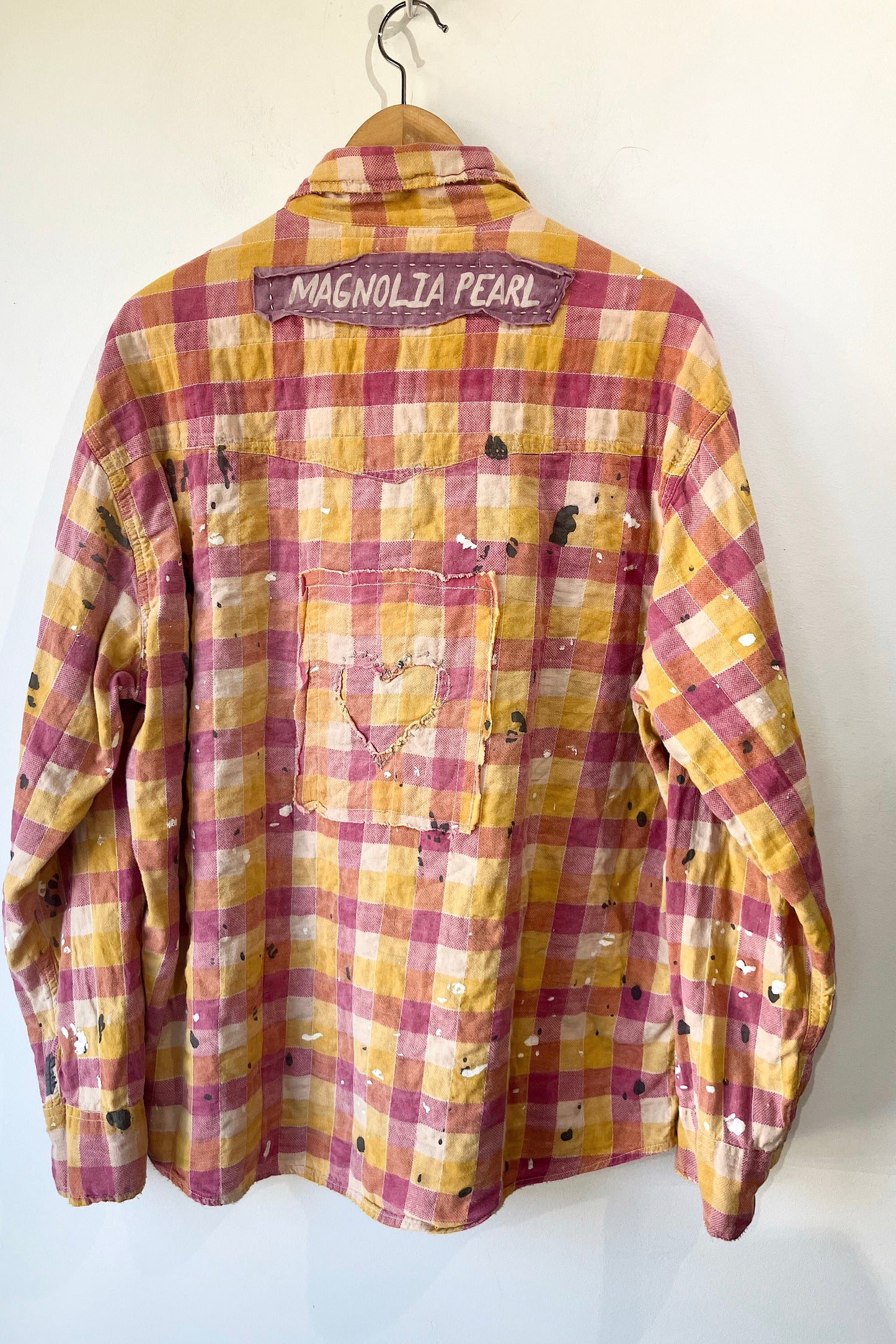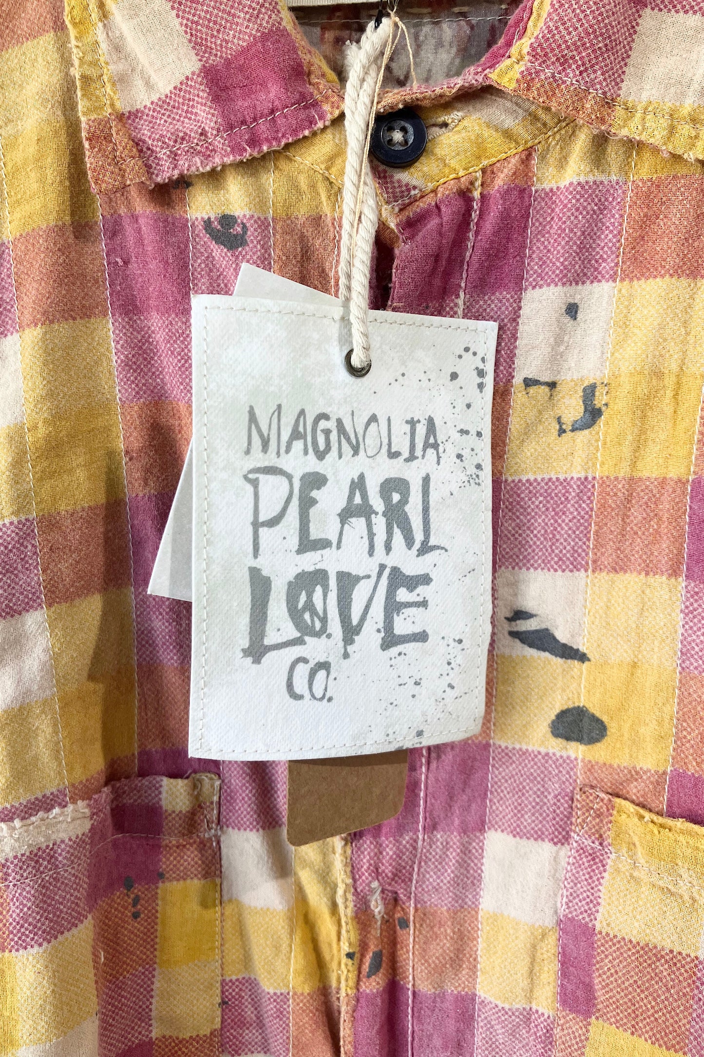 Magnolia Pearl Pink Plaid Shirt. Magnolia Pearl Pink Plaid Shirt. Lovely pink and orange check pattern for a cute and feminine look! This top has that cute bohemian look Magnolia Pearl is famous for but in an understated but never boring shirt! The paint splatters add charm to this precious piece, giving that worn in look to this brand new shirt! New with Tags. 100% cotton, machine wash with like colors. No marked size, fits S/M/L best. Made in India.