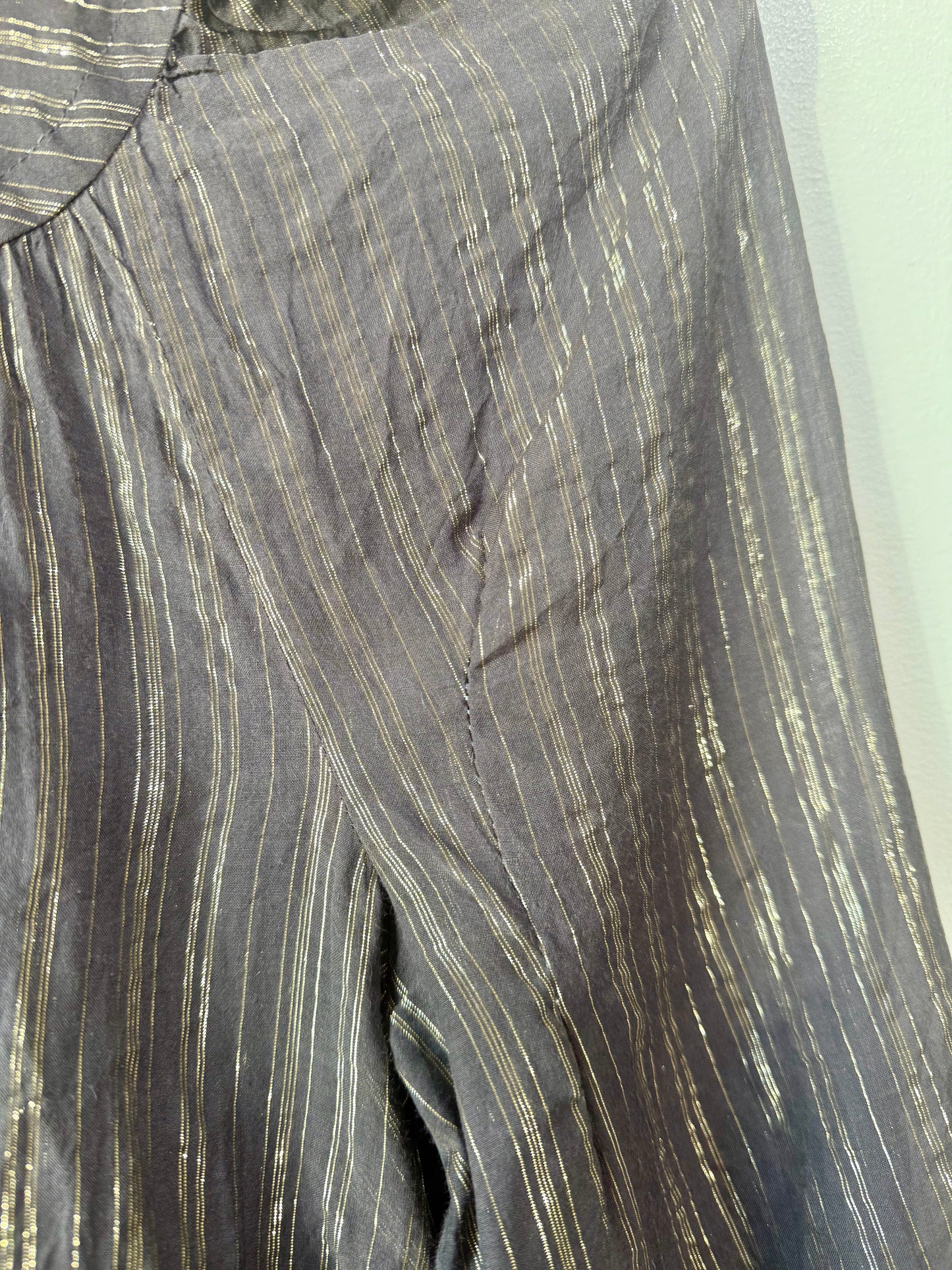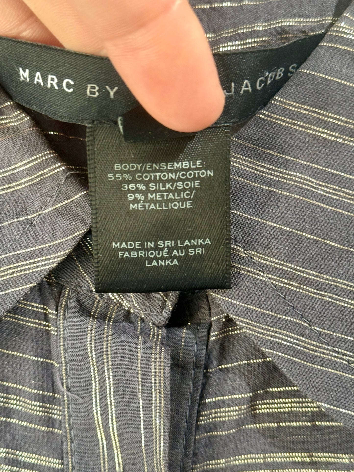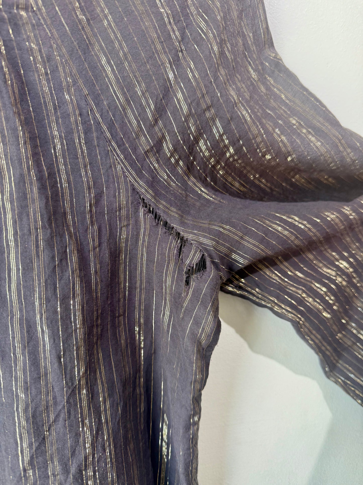 Vintage Marc Jacobs blouse in soft ash grey with shimmering metallic stripes. Features a charming peter pan collar and button-front closure with relaxed, semi-sheer fabric. Labeled size 6, fits XS-S. Note: includes a repair on the left shoulder and a small rip in the right underarm seam—perfect for vintage lovers who appreciate character and authenticity.