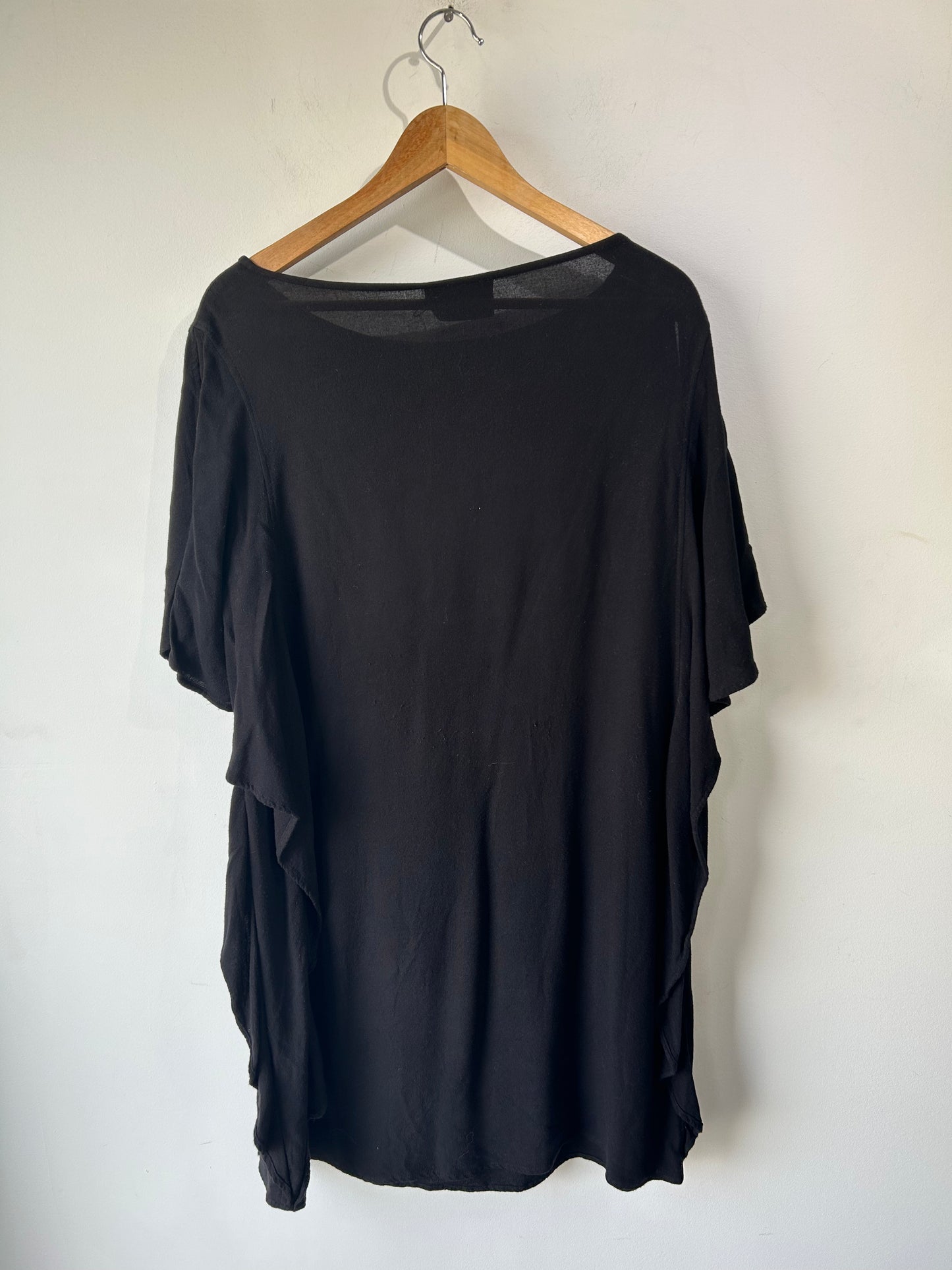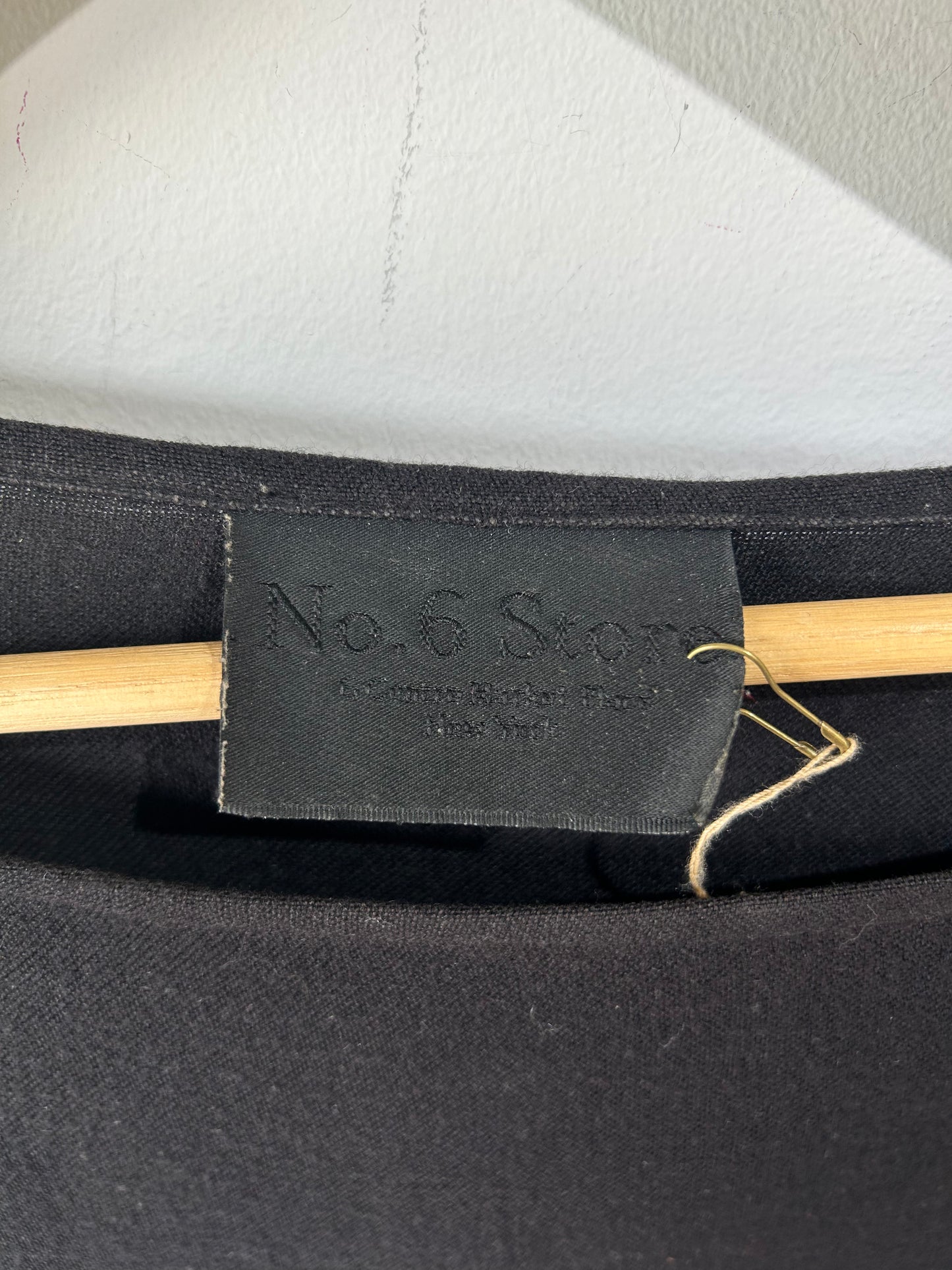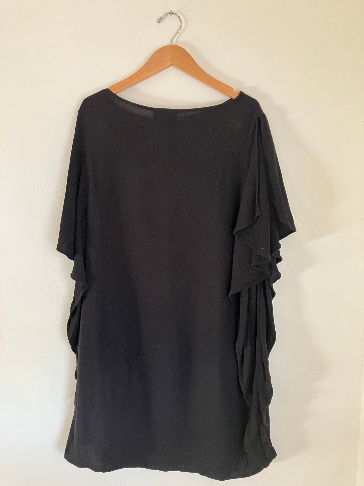 No. 6 Store Black Cotton Dress With Ruffled Sides. Flowy, loose fit, sleeveless with ruffles going up both sides for shape and movement. Has pockets. Midi length. Unmarked size, fits anywhere from Medium to Large due to style. Good used condition, incredibly slight discoloration under the arm. not noticeable when worn--sold as is.