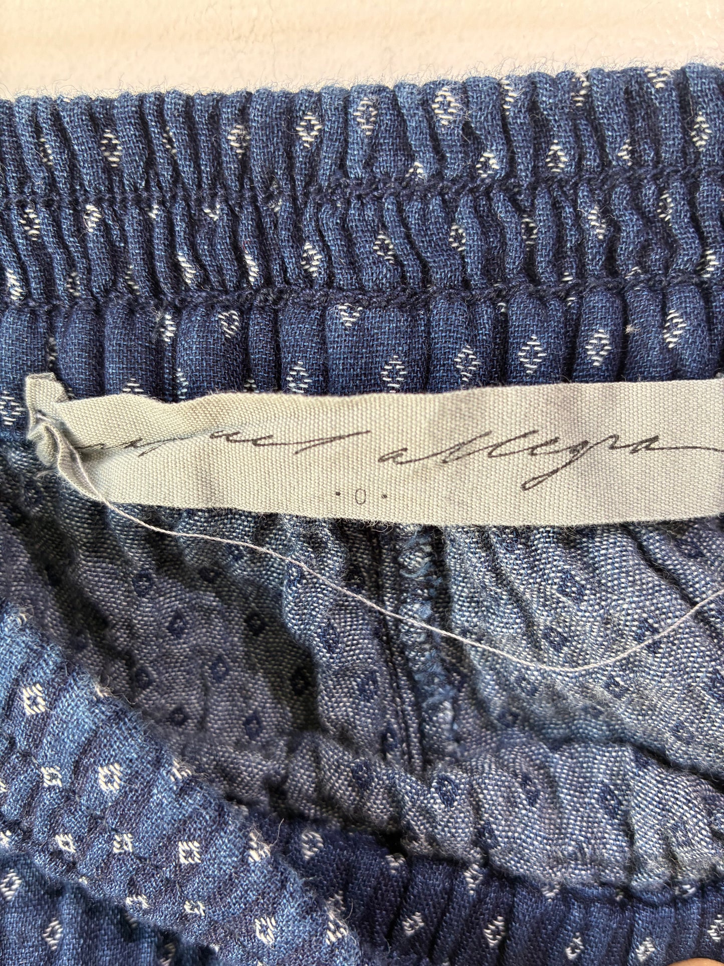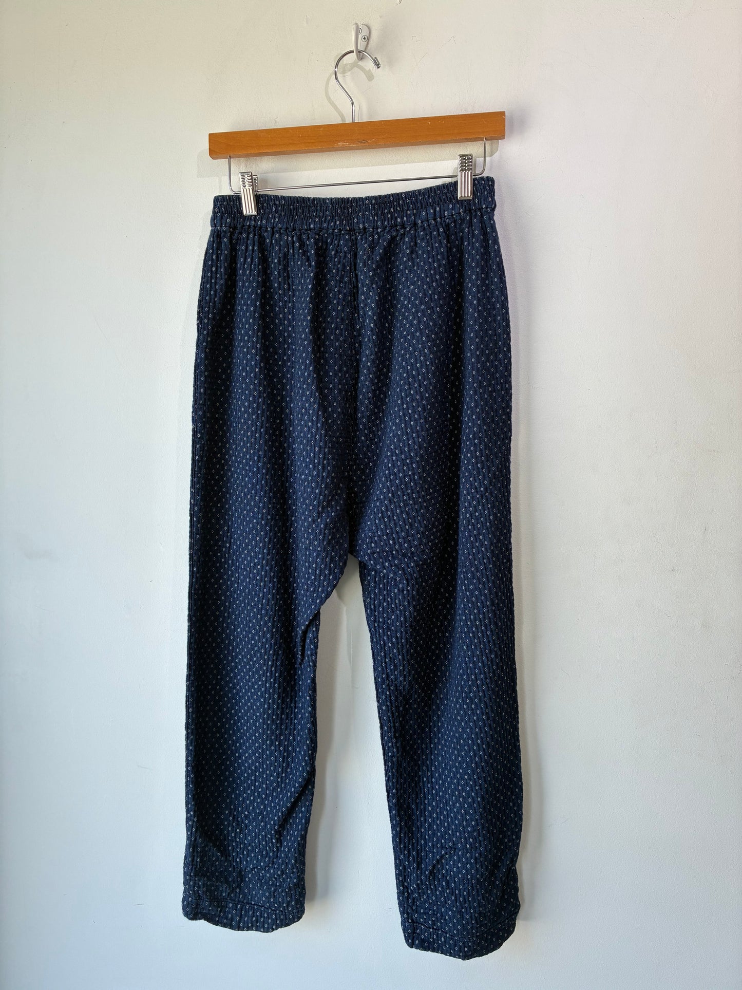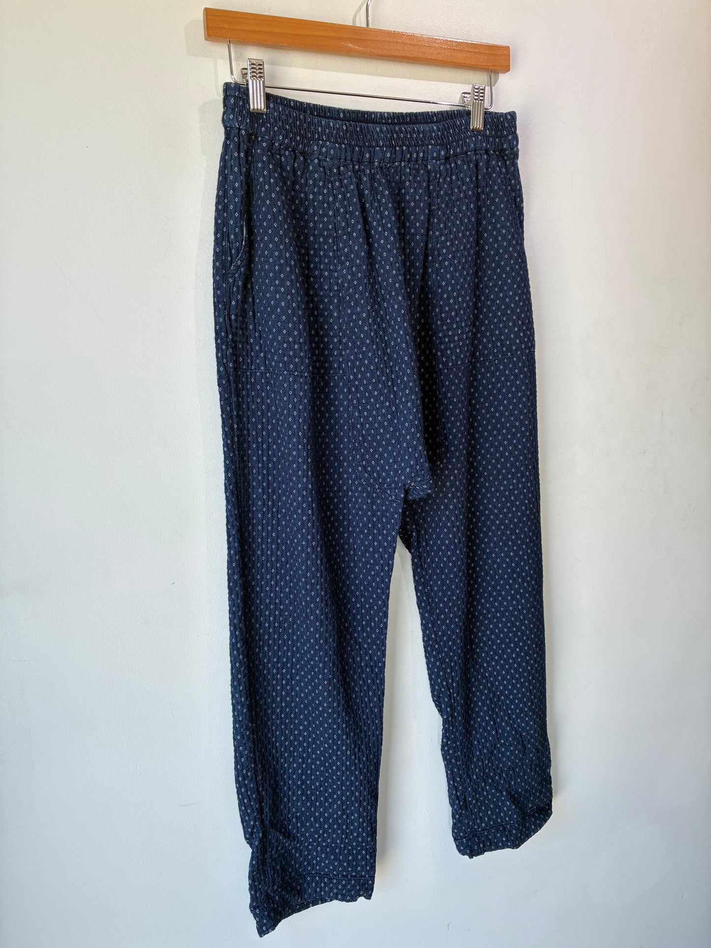 Raquel Allegra Indigo Blue Pants with White Dot. Indigo blue in a textured cotton with a tiny white diamond shaped dot, these darling pants are the versatile basic you didn't know you need! Featuring an easy breezy elastic waistband, a slightly dropped crotch and side waist pockets. Pair with a tee or something a little frilly or an oversized button-up, these pants will take you anywhere, day or night. Pants are in excellent condition and are free of stains, tears and defects.
