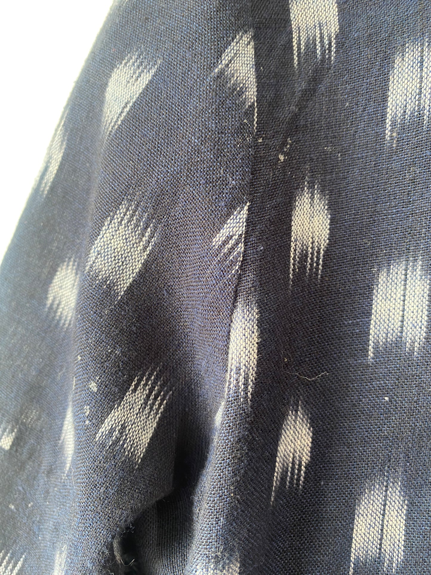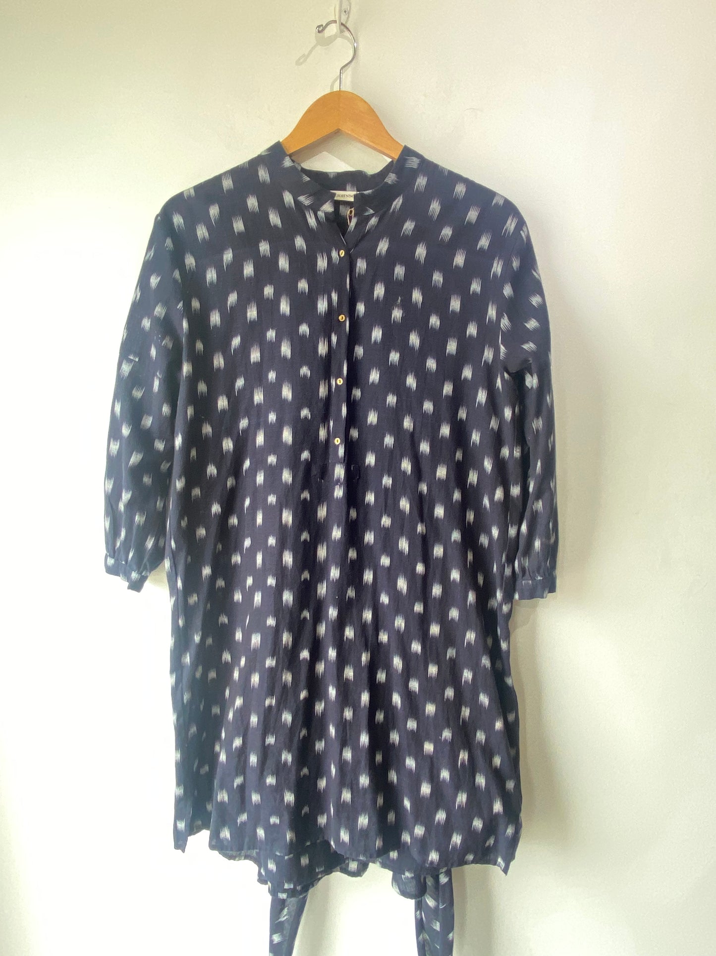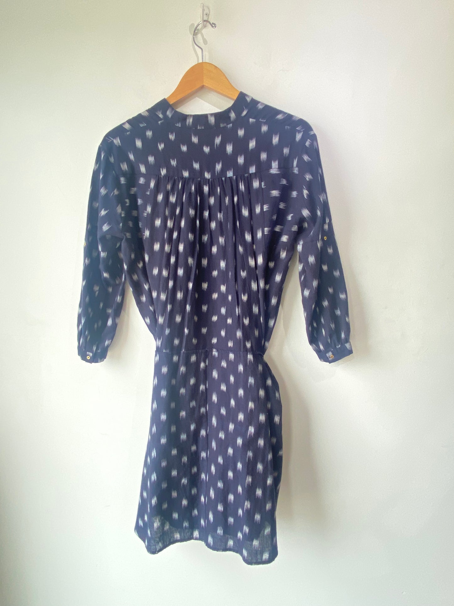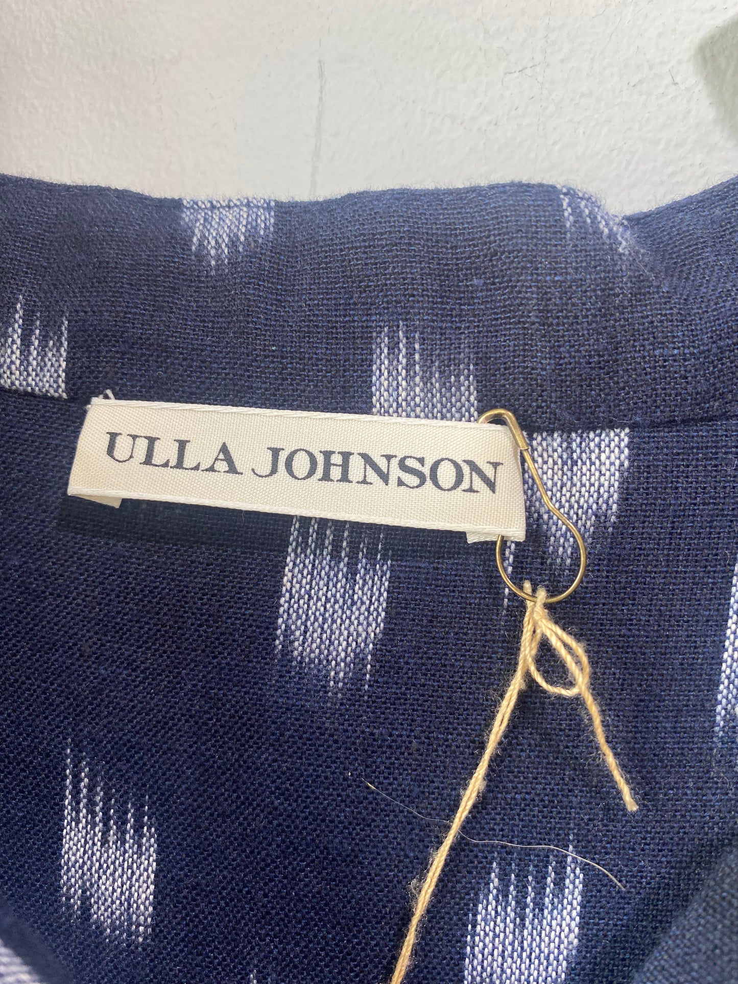Ulla Johnson Navy Batik Print Tie Dress! 100% cotton with long-sleeves, a crewneck collar, and buttons on the chest. Unlined. Made in India. Marked a size 2, fits a S/M. In overall excellent condition with minor marks on the front.