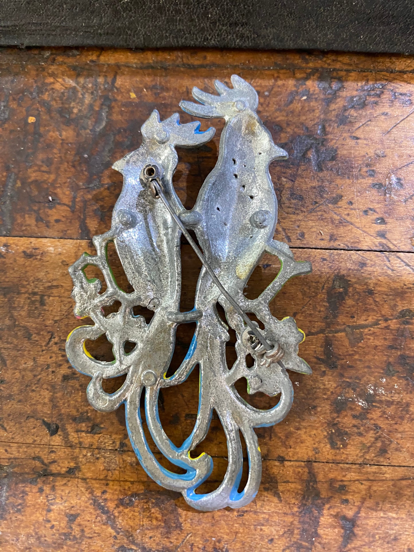1941 Gene Verrecchio Coro Calopsitta Cockatoo Brooch! This gorgeous piece is in fair vintage condition and priced accordingly. A tiny bit of enamel loss is noted. The stones are sparkly but a few, including both birds' eyes, missing. I don't see a stamp on the back, but this is a well documented piece. Measures approx. 3~5/8" long x 2" across.