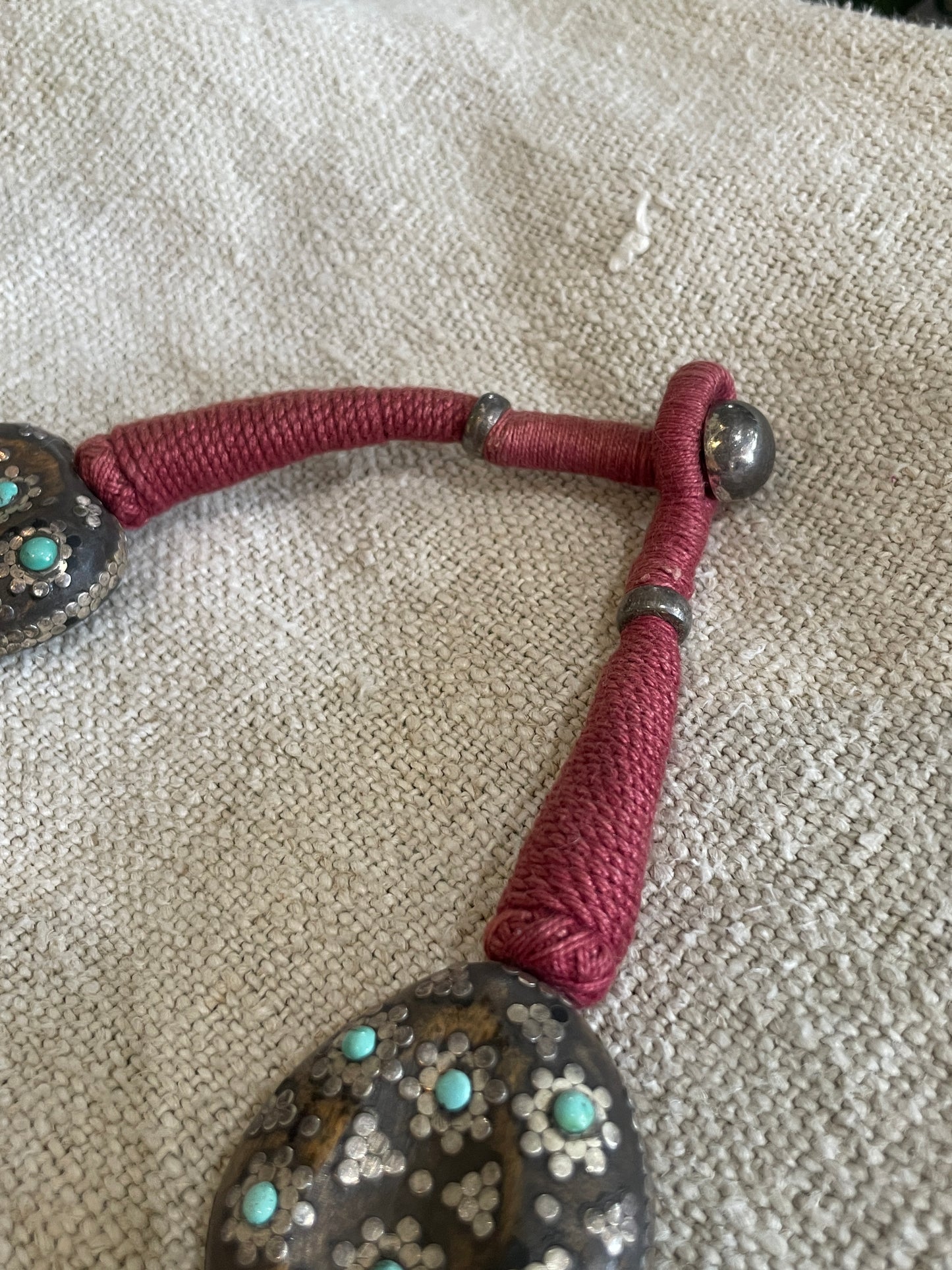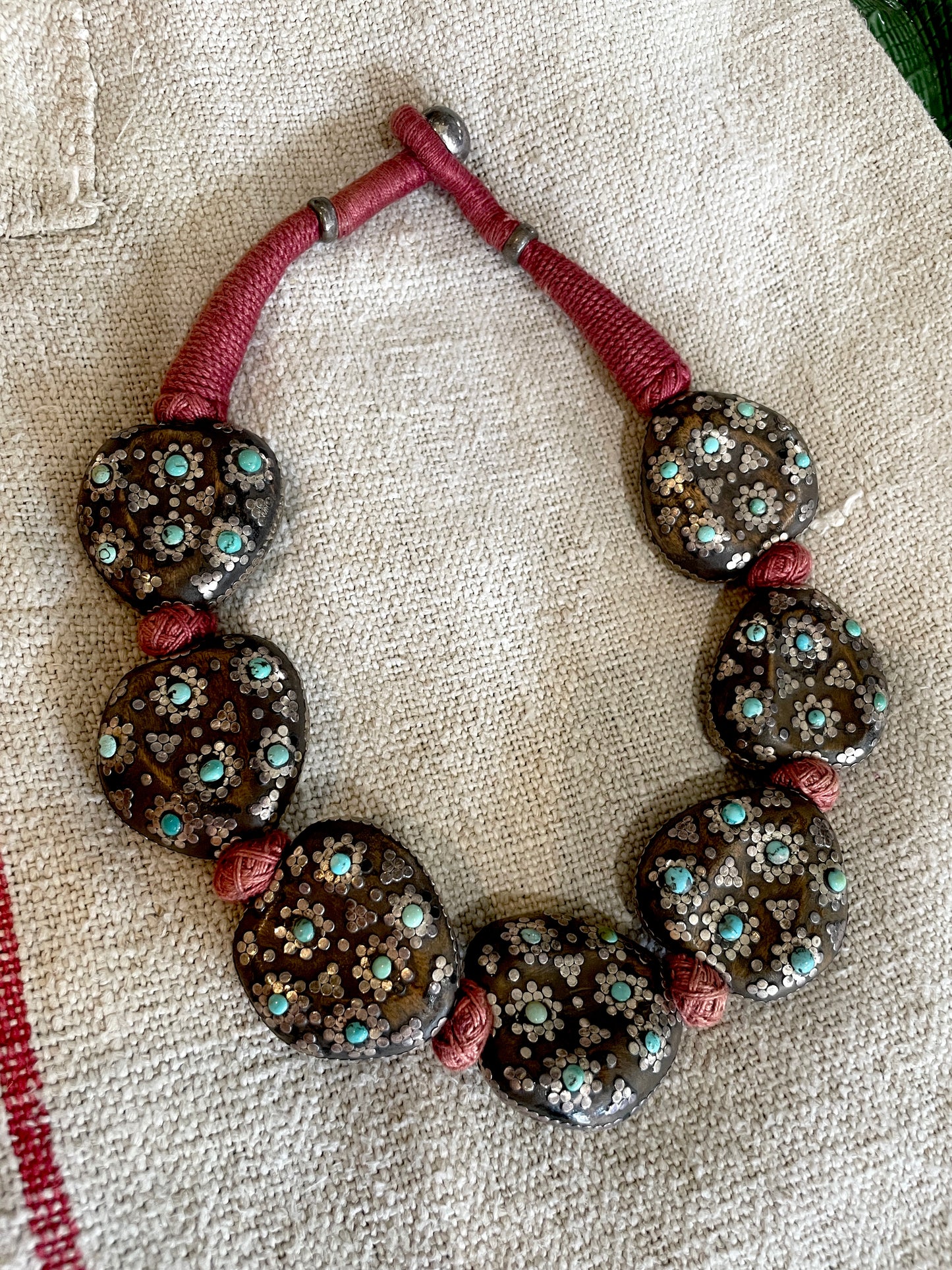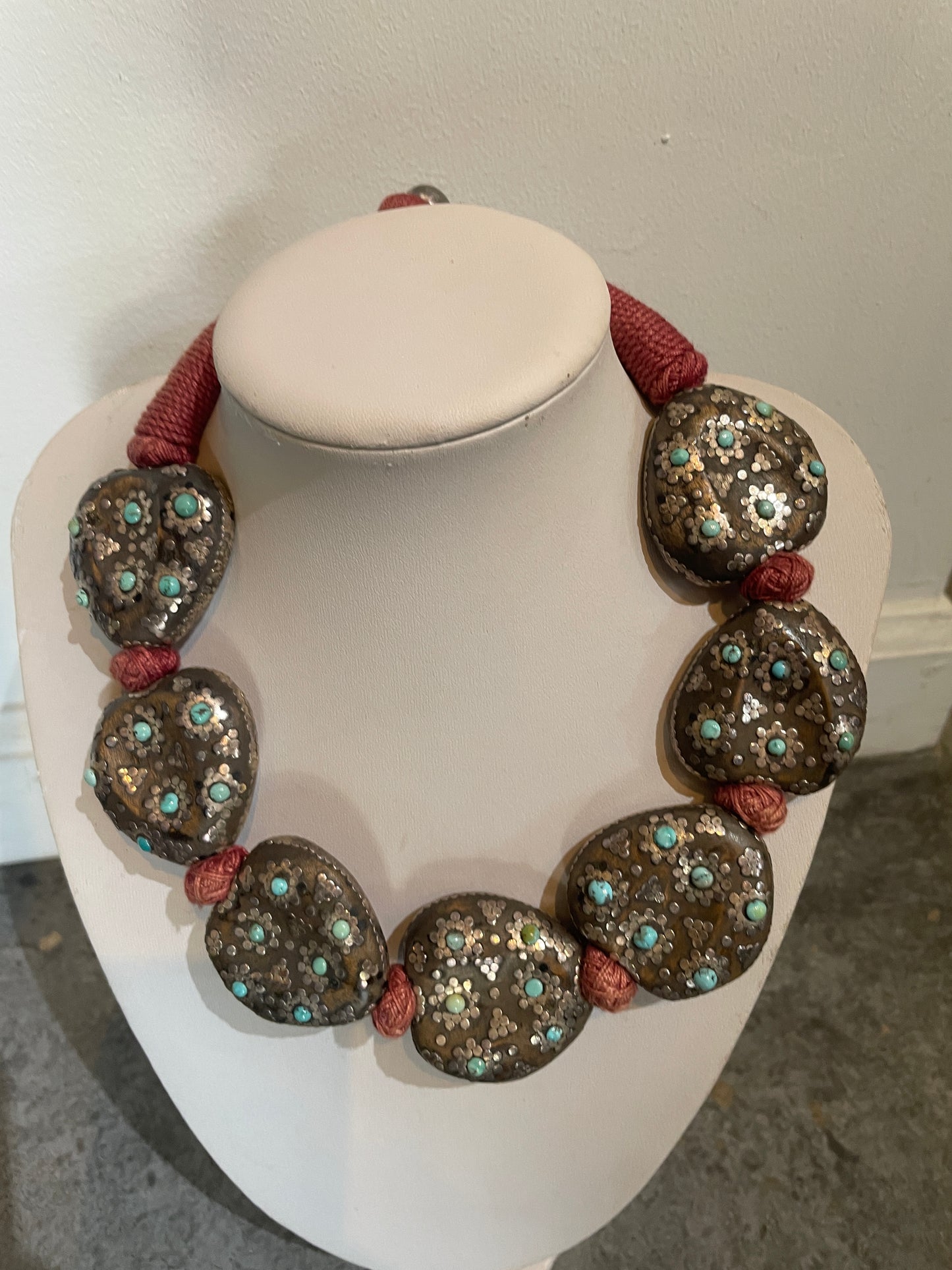 Silver and Turquoise Himalayan Woven Necklace. A beautifully chunky inlaid silver and turquoise necklace. Features woven red tie and large stone-like beads. Short length, choker type necklace. 21" around.