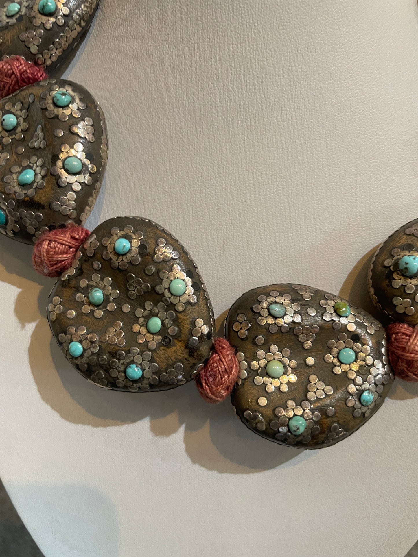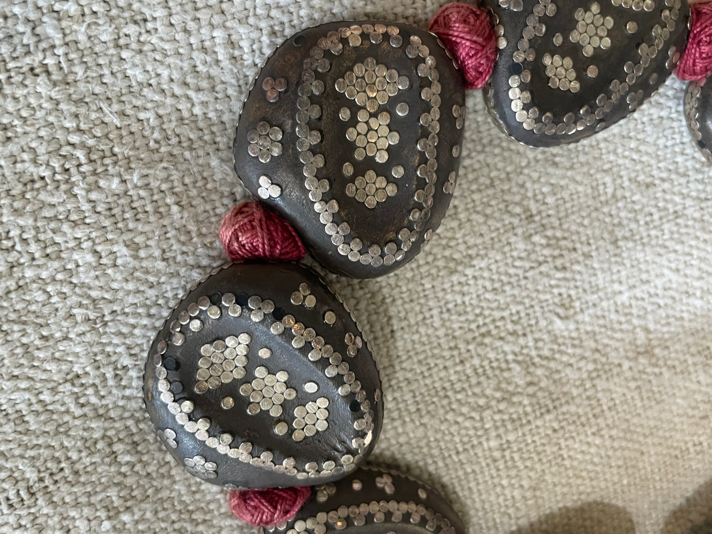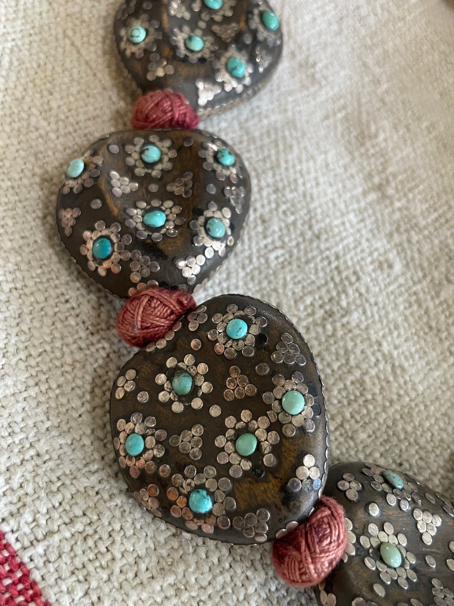 Silver and Turquoise Himalayan Woven Necklace. A beautifully chunky inlaid silver and turquoise necklace. Features woven red tie and large stone-like beads. Short length, choker type necklace. 21" around.