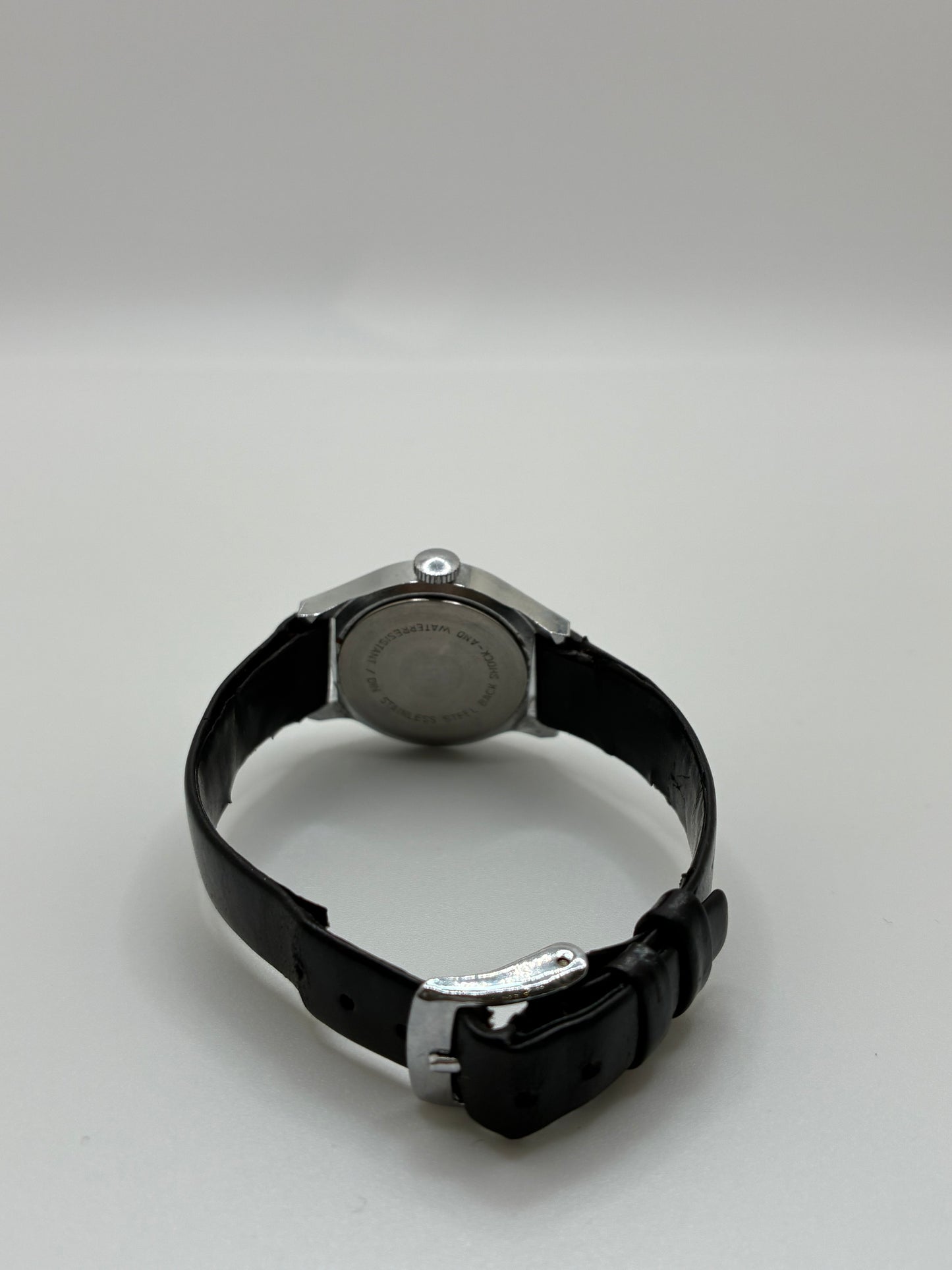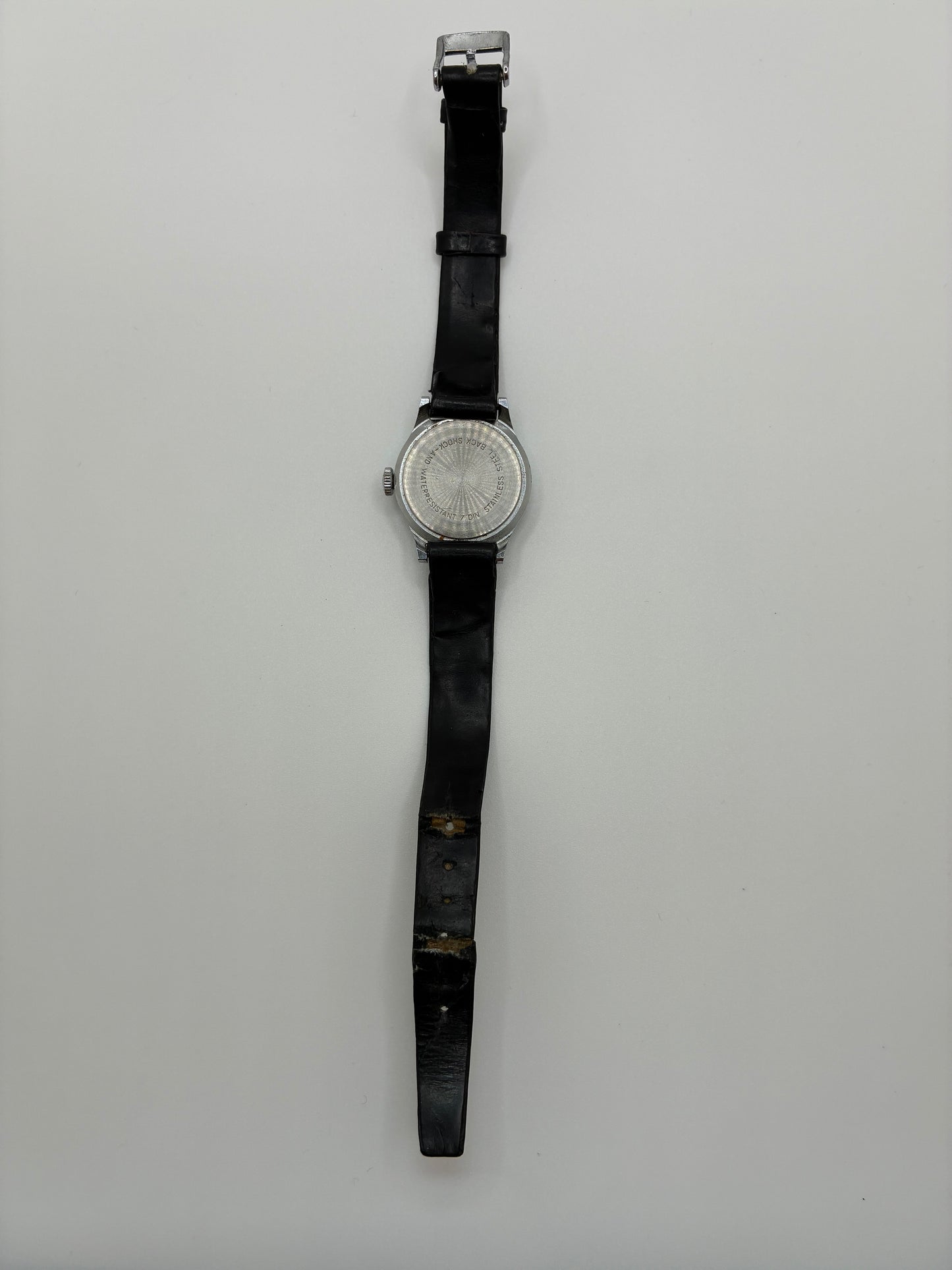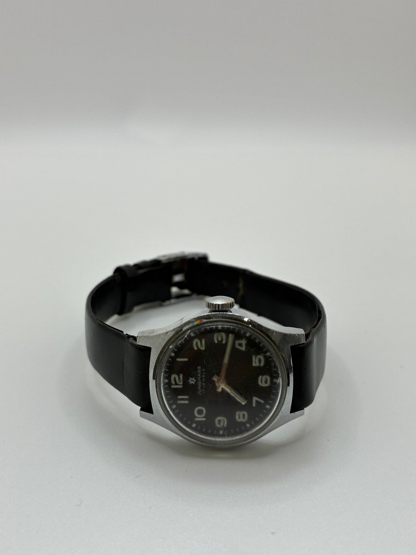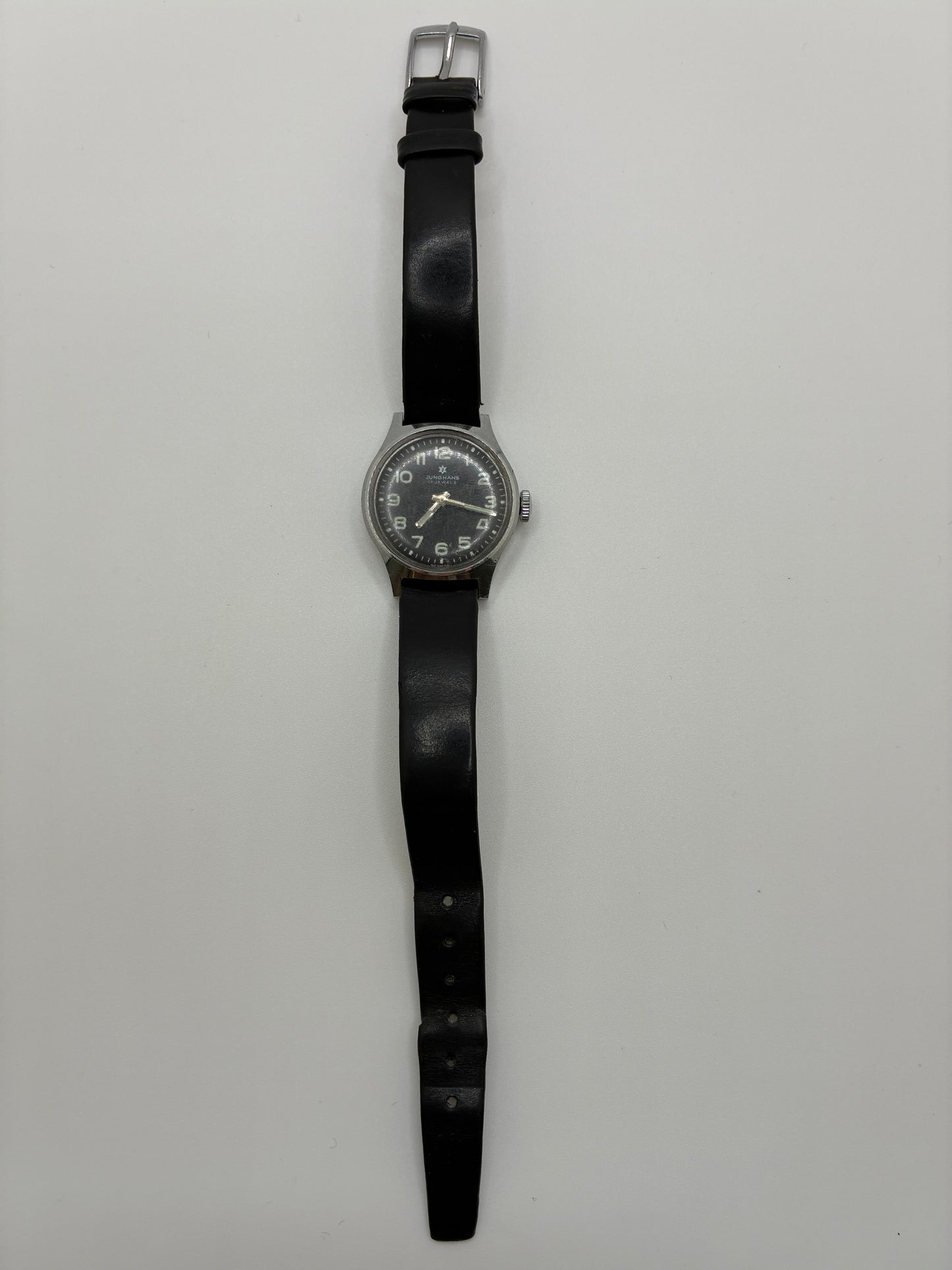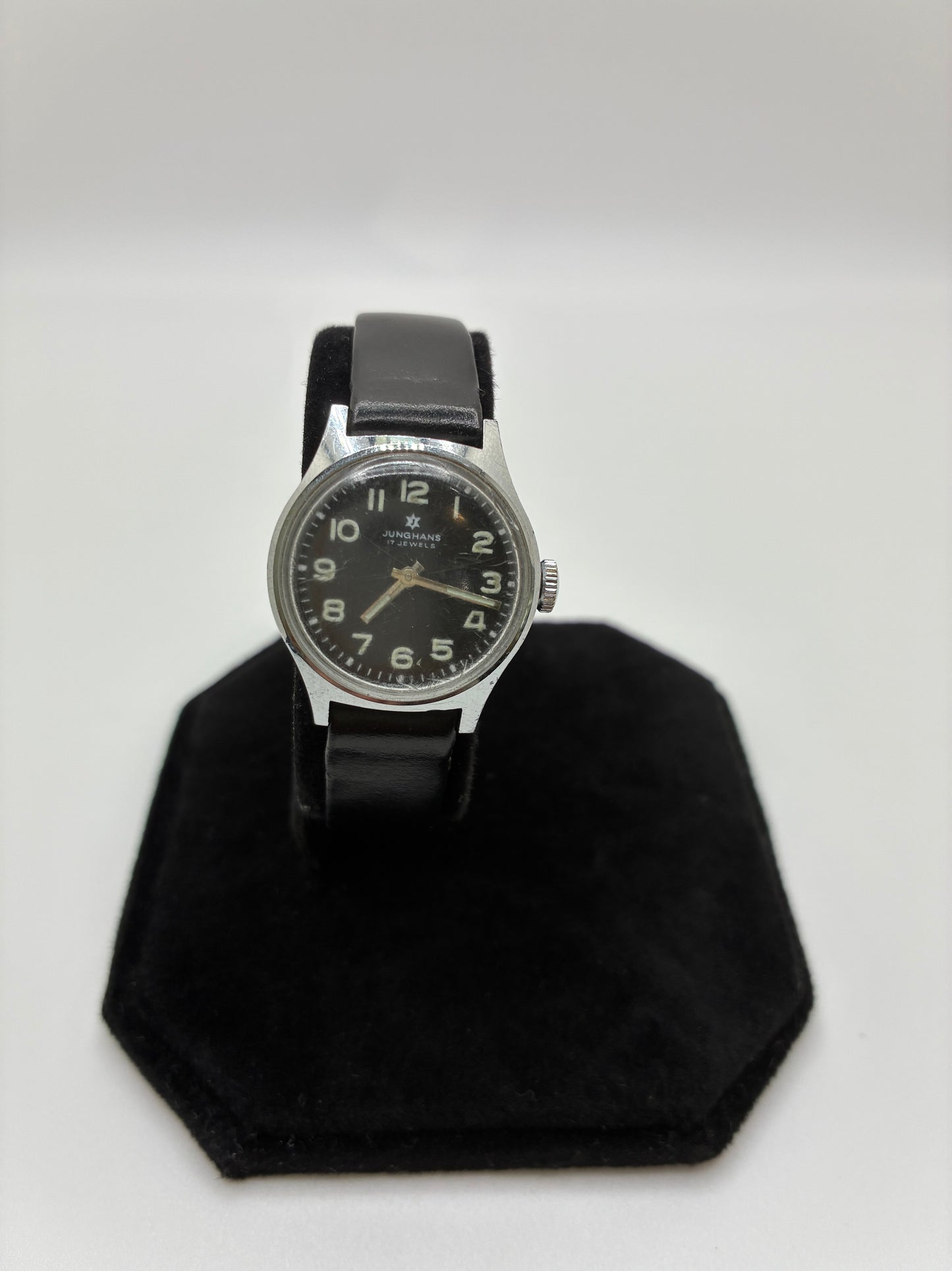 Junghans Small Black Watch. Classic and timeless, this watch features a narrow black leather band, a black face with luminescent numbers and hands and silver hardware. Priced as-is, watch shows some signs of age and wear. The backside of the band is cracked in two places and face has minor scuffing.