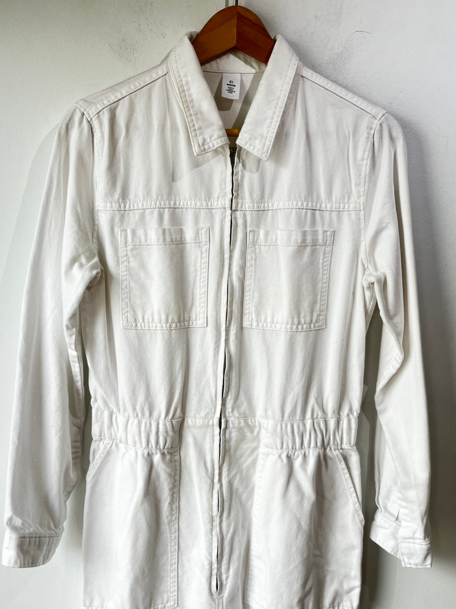 &Denim White Denim Coveralls. The perfect long sleeved, workwear coverall in a crisp white denim makes for easy, one-step dressing! Zip front, chest pockets, waist pockets, seat pockets and a flattering, ruched elastic waistband will have you looking fashionably casual and ready for anything! Garment is in excellent condition and is free of tears, stains and defects.
