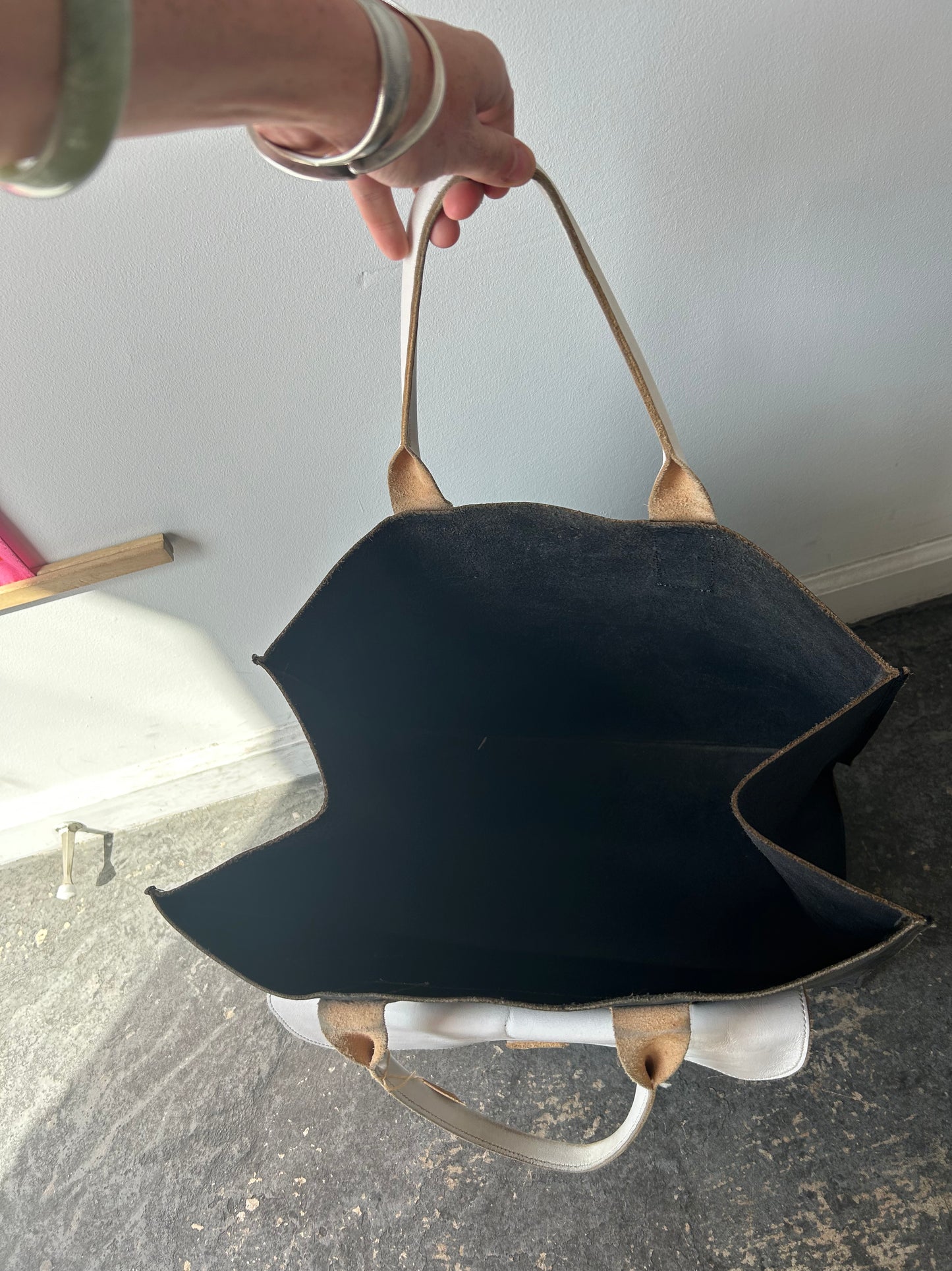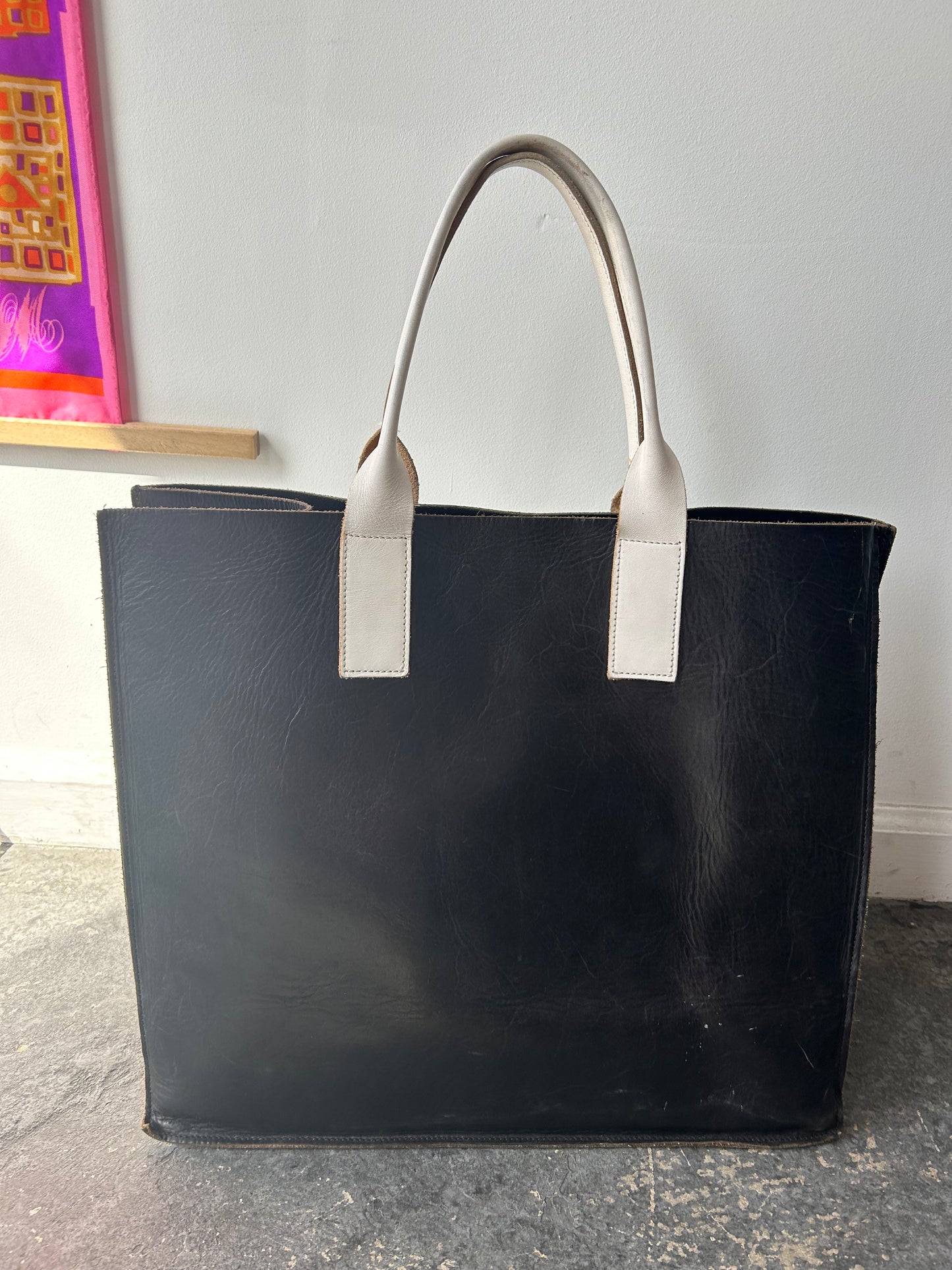 Agnes Baddoo Black and White Large Leather Bag. The perfect oversized bag for anything you could possible need throughout your day! Boxy and well structured so it conveniently stands up on its own. Body of bag is thick black leather with a large white pocket on the outside that fastens shut with a leather buckle. Short handles are also white leather. Has slight signs of wear throughout the leather but merely indicative of a pre-loved life. If anything the leather is simply worn-in nicely!