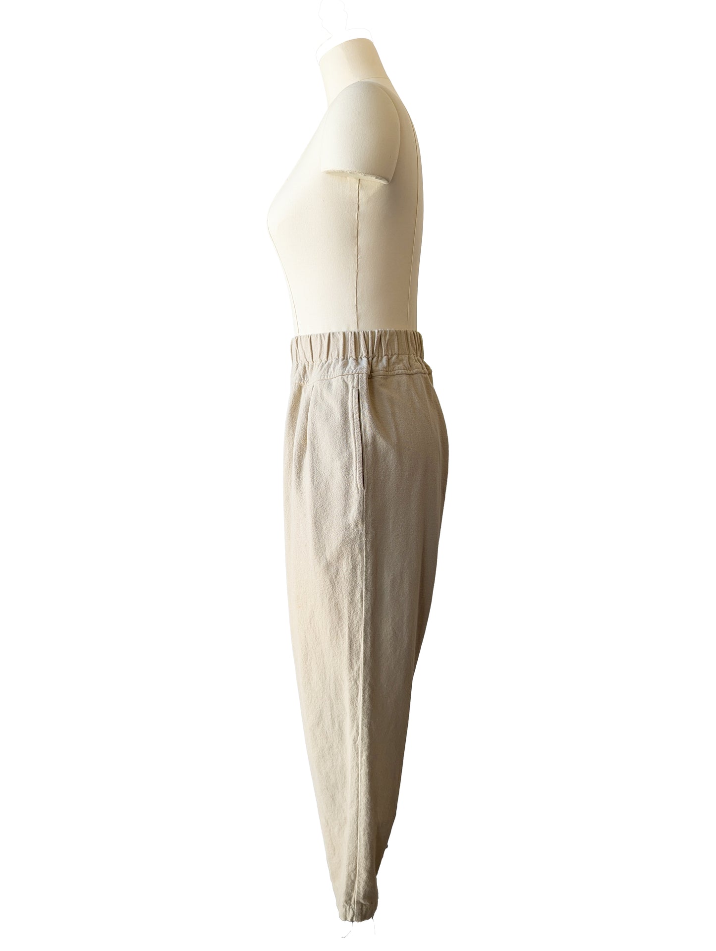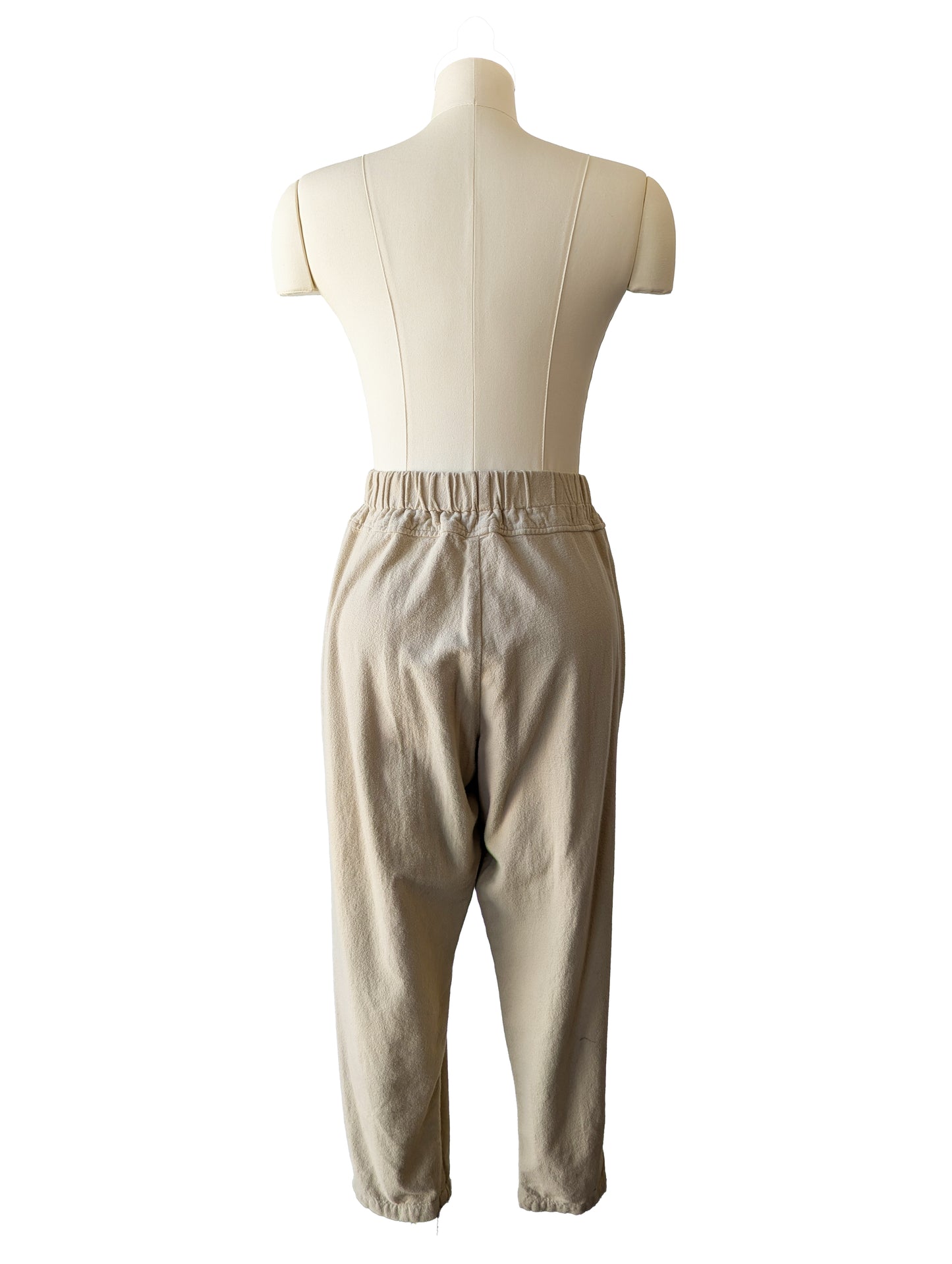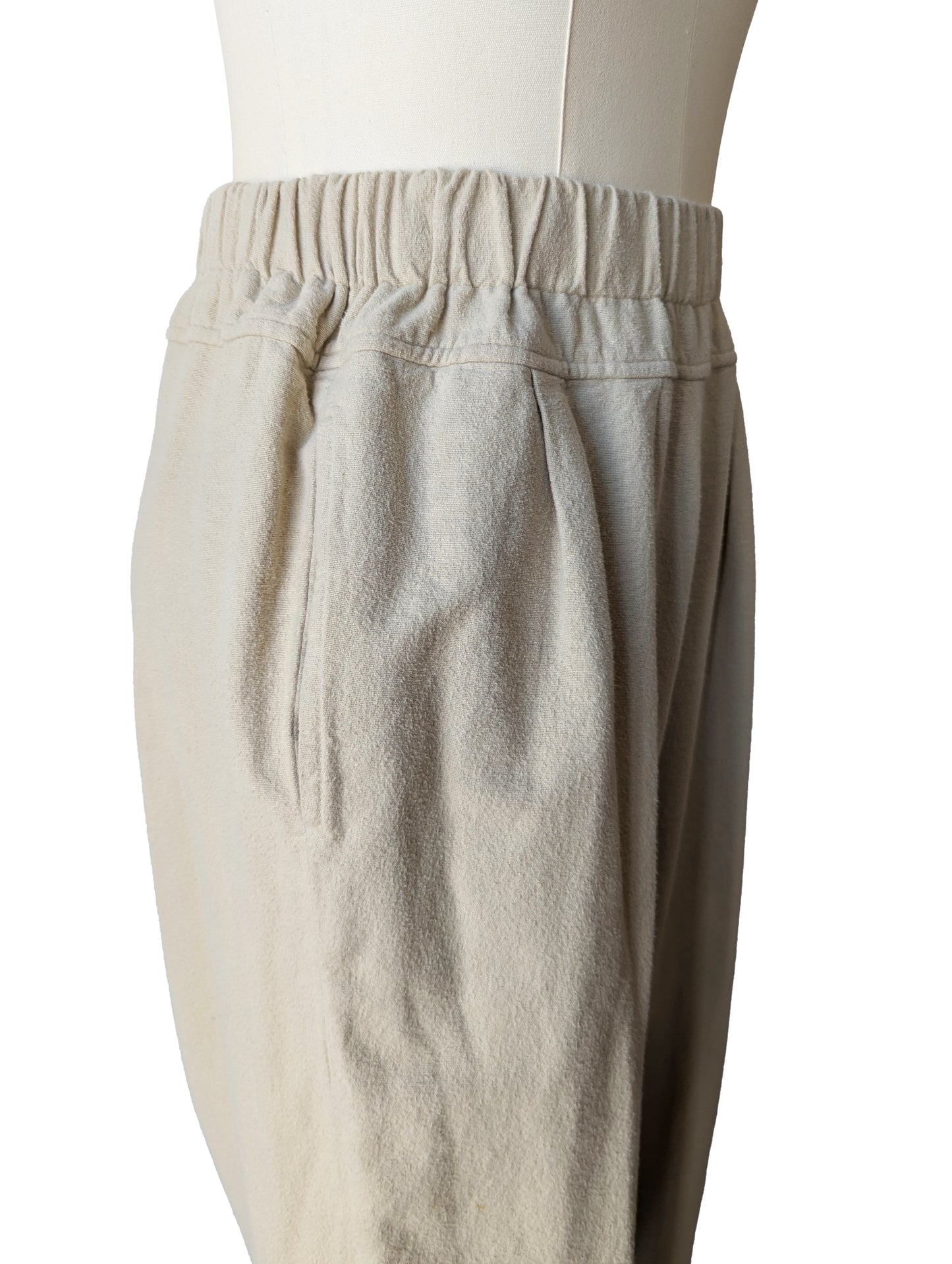 Cream flannel pants that prove comfort and polish can actually get along. Cut in a relaxed tapered shape with an elastic waist and side pockets, they bring all the ease of loungewear but refuse to read as sloppy. The brushed flannel is soft enough to live in, yet the clean lines and thoughtful tailoring make them city-ready. Pants are in excellent condition and free of notable flaws.