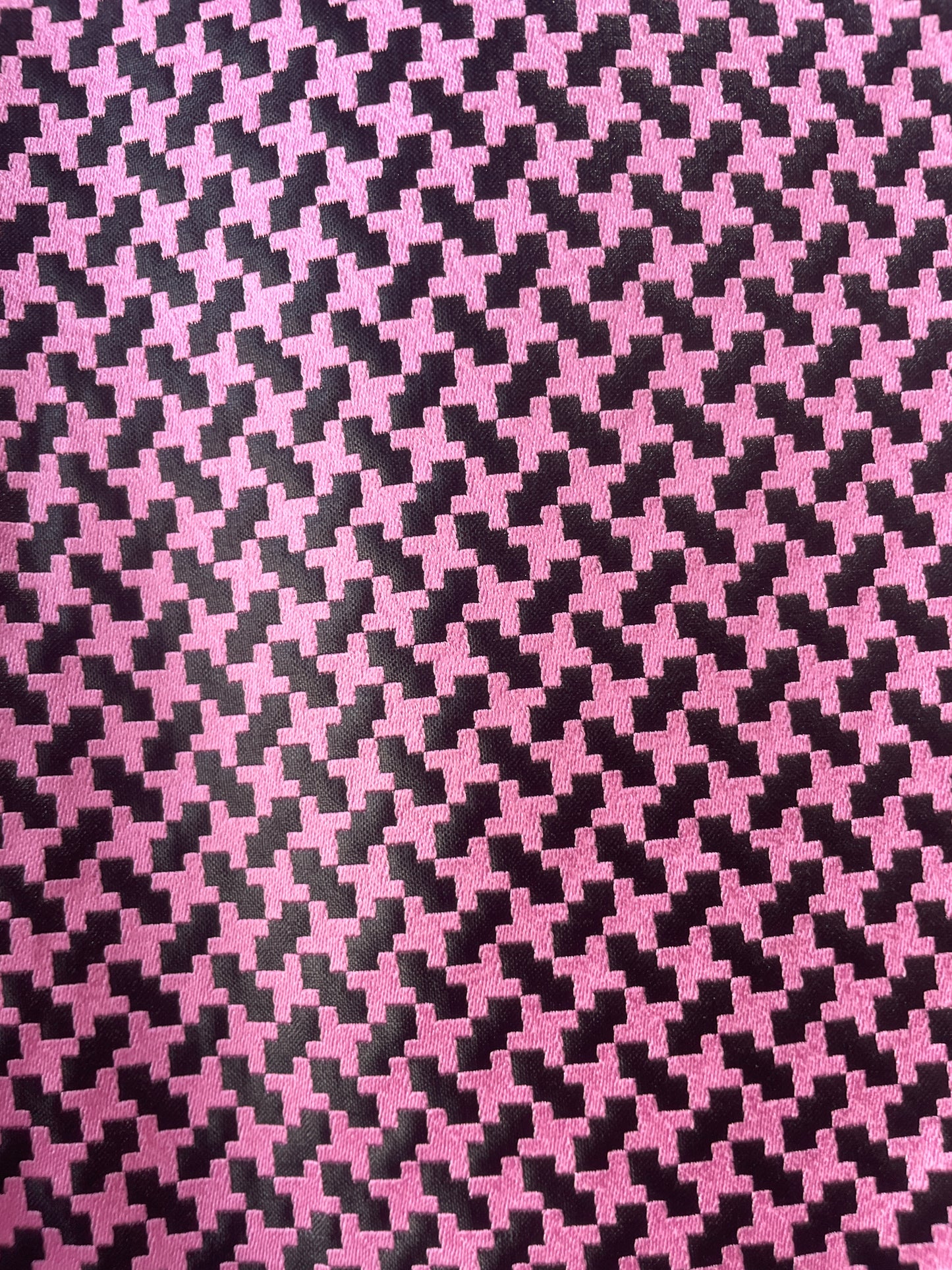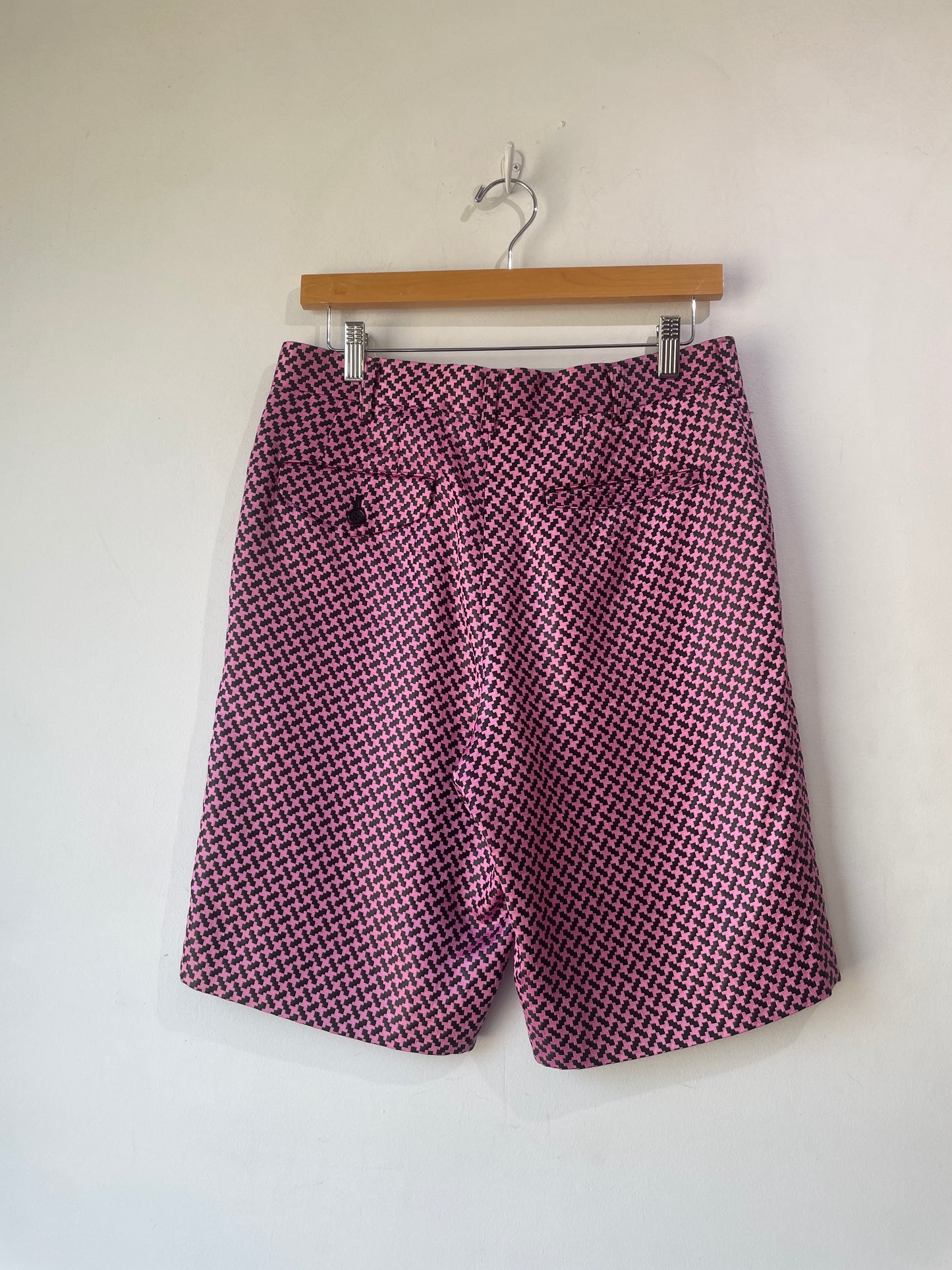 Comme des Garcons Pink and Black Jacquard Shorts. From their Homme Plus Line. A pair of knee length shorts in a striking geometric woven pattern. Wonderfully sewn in a high quality shiny weave. 75% acetate 25% polyester 100% cupra lining. Size S. Made in Japan.