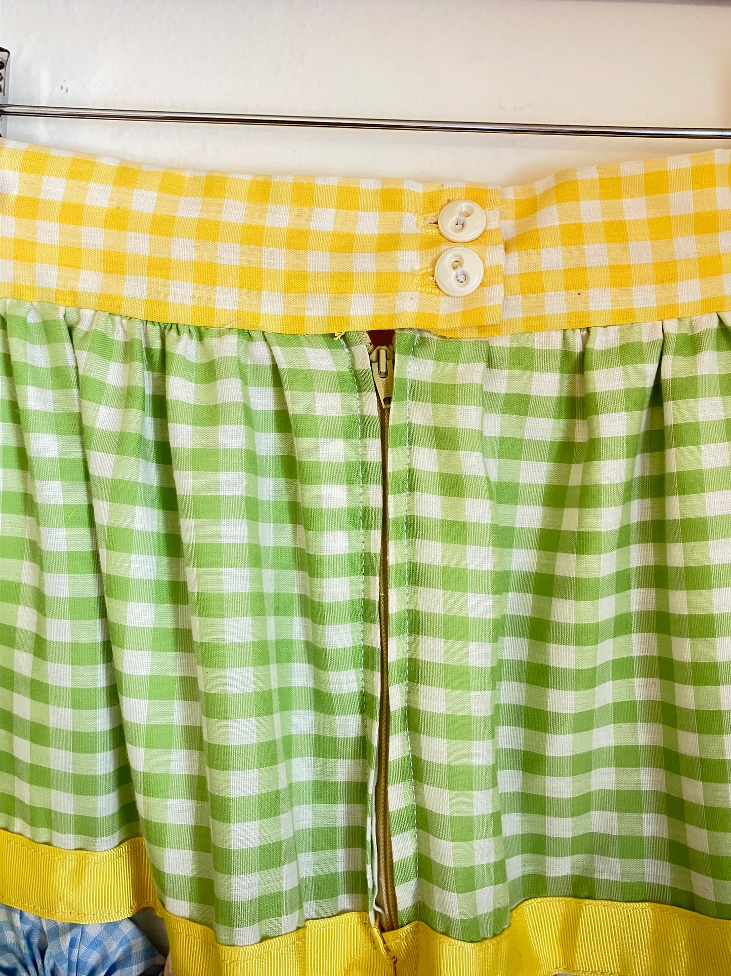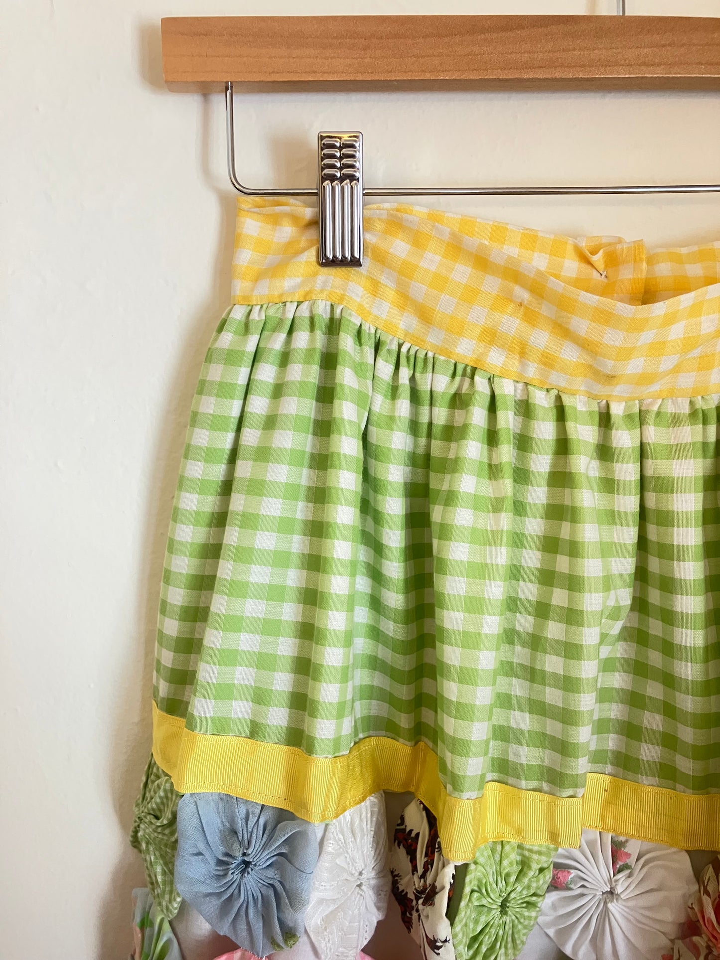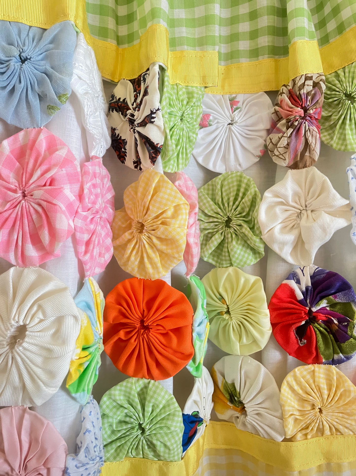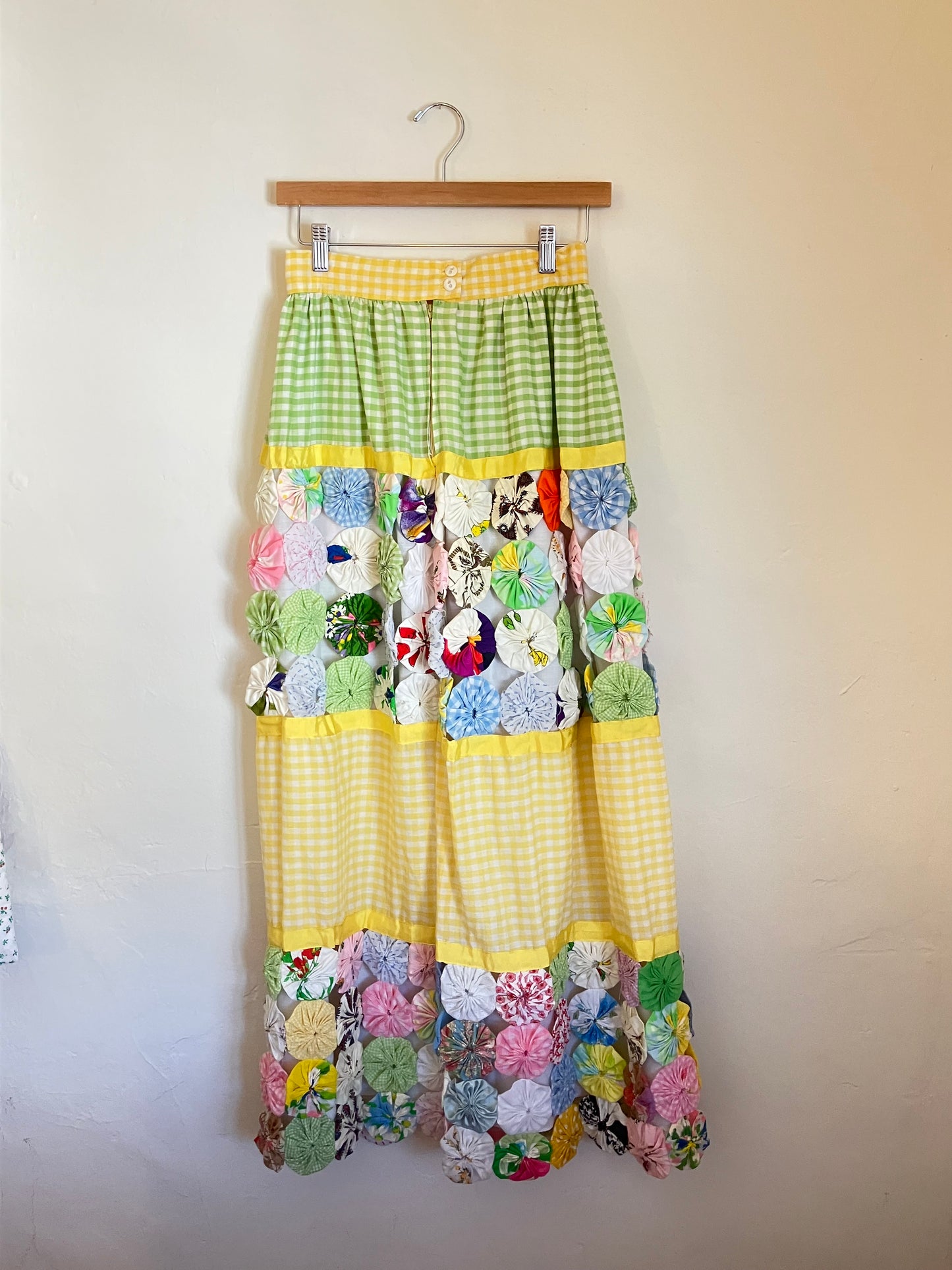 Vintage Yo-Yo Quilt Skirt. Fabulous pastel statement skirt. Maxi length, fixed waist with zipper and buttons in the back to secure. Excellent vintage condition. A special, unique garment. Unmarked size, best fits a M. Cotton-avril blend, dry clean only.