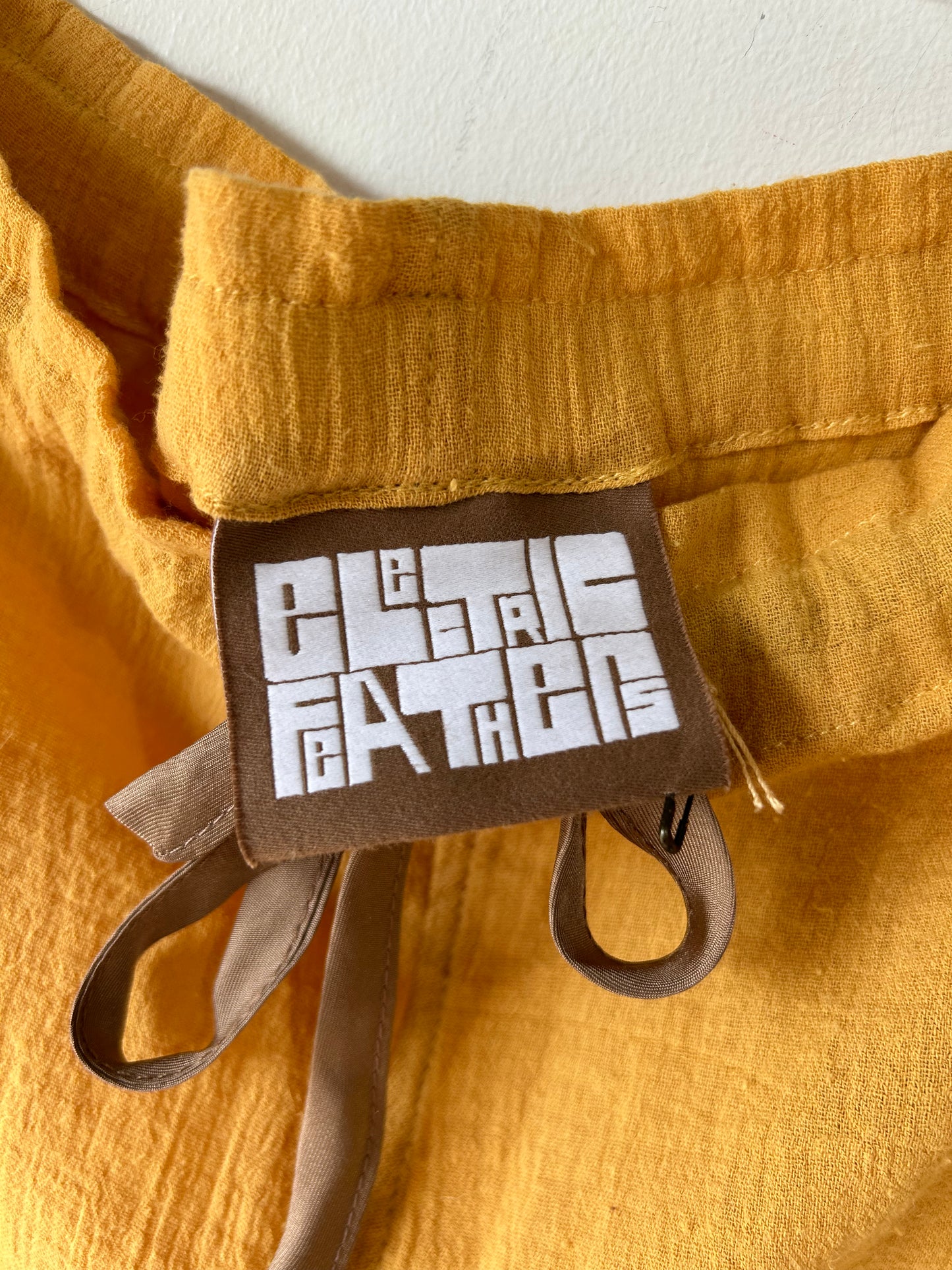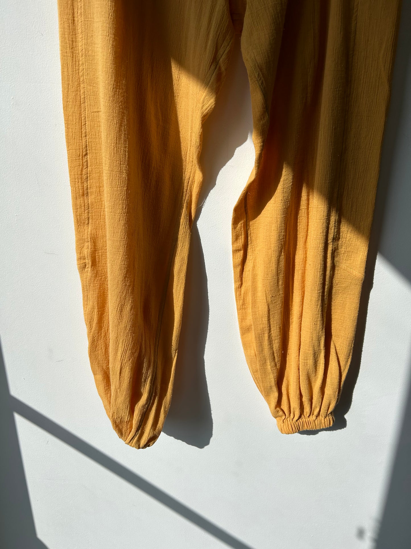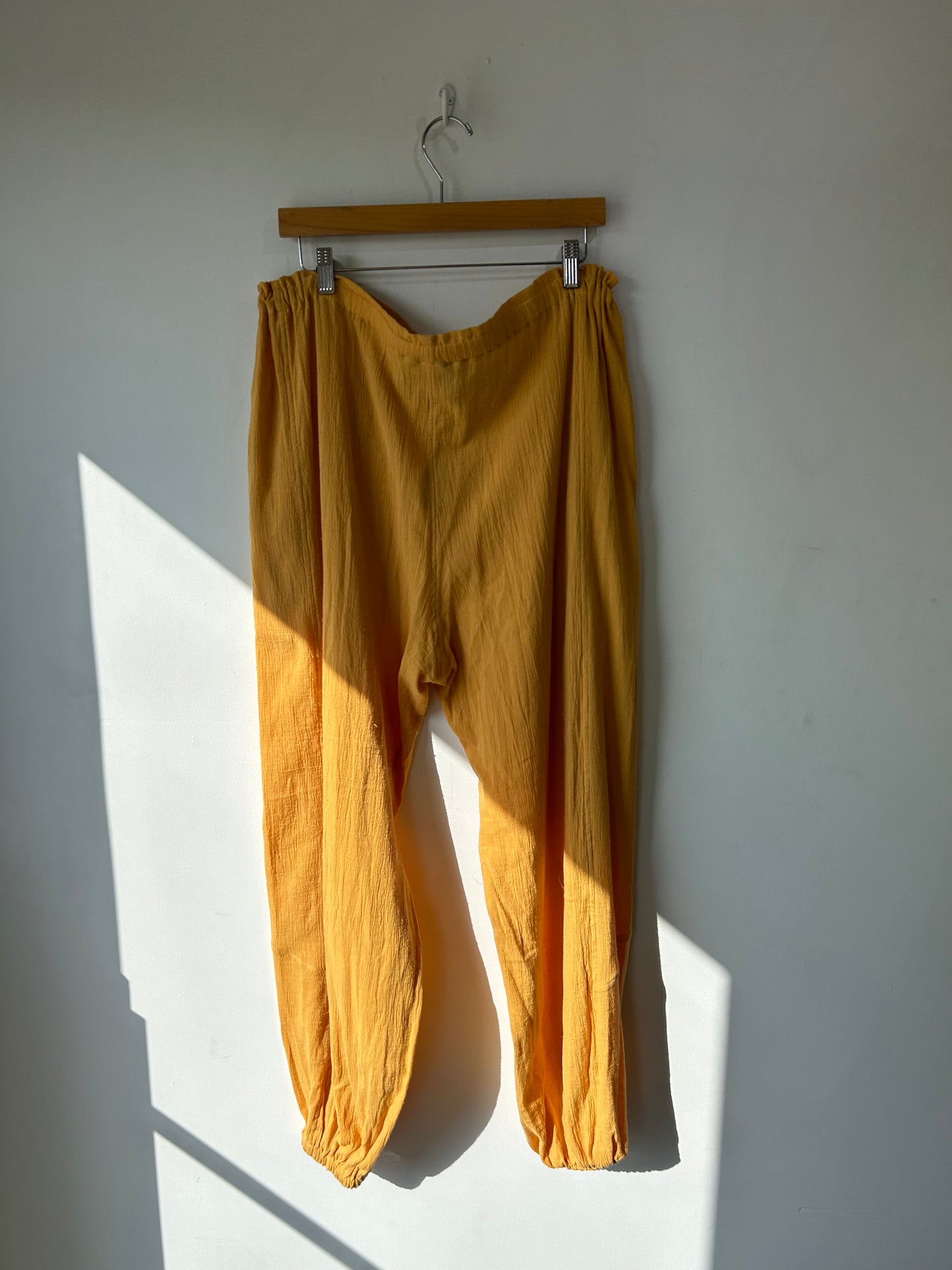 Electric Feathers Mustard Yellow Pants. Made from a lightweight, super comfy cotton with a adjustable drawstring waist. Has two front pockets and pant legs gather at the ankles for a fun, parachute pants type silhouette. In excellent used condition. Marked size M/L, but fits many due to drawstring waist and loose fit.