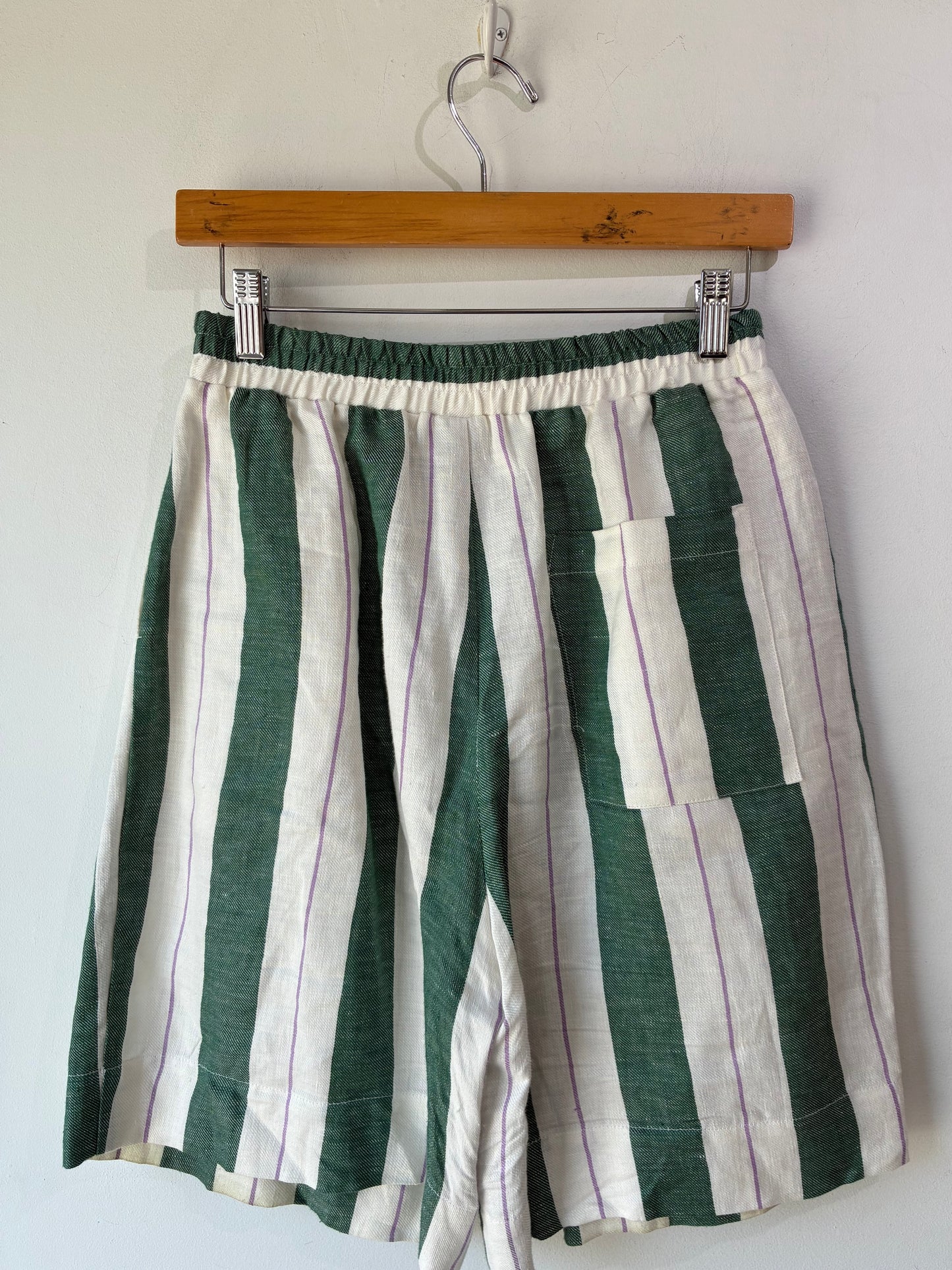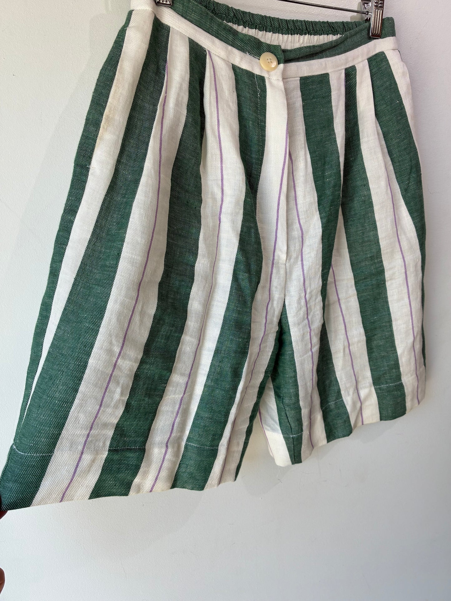 Ilana Kohn Green Stripe Linen Shorts. Light and airy, these cute shorts make comfort stylish! Featuring bold green and white stripes with a lavender pinstripe, a single pleat waist and a rear patch pocket. The pocketless waist keeps the lines cleans and flattering! In excellent condition, shorts are free of stains, tears and defects.