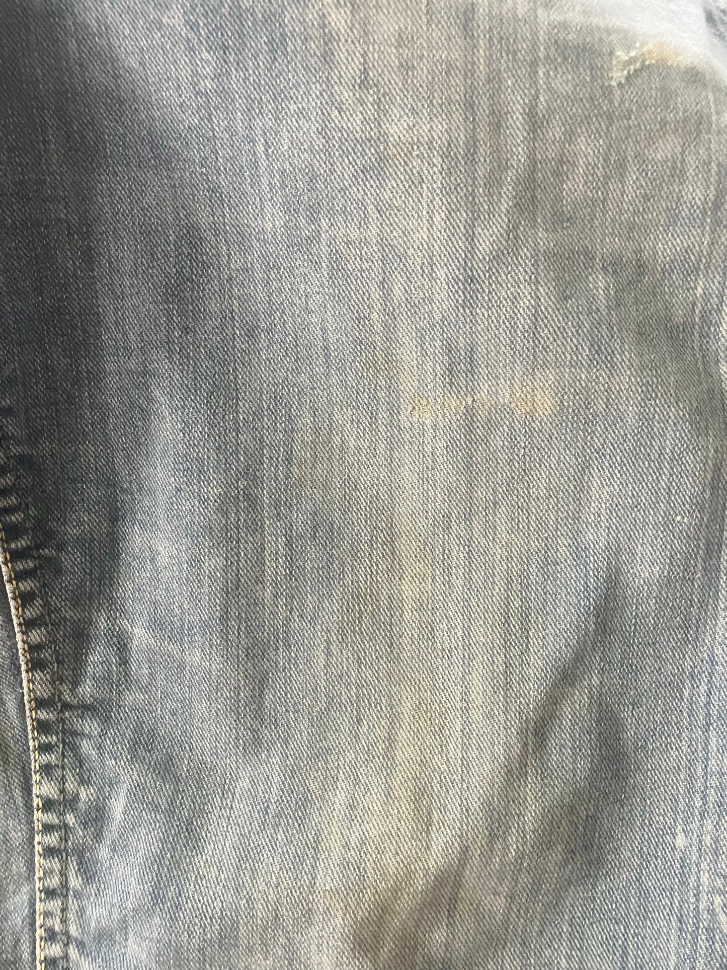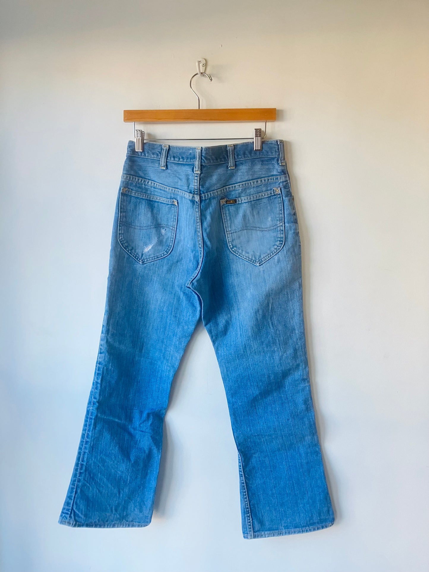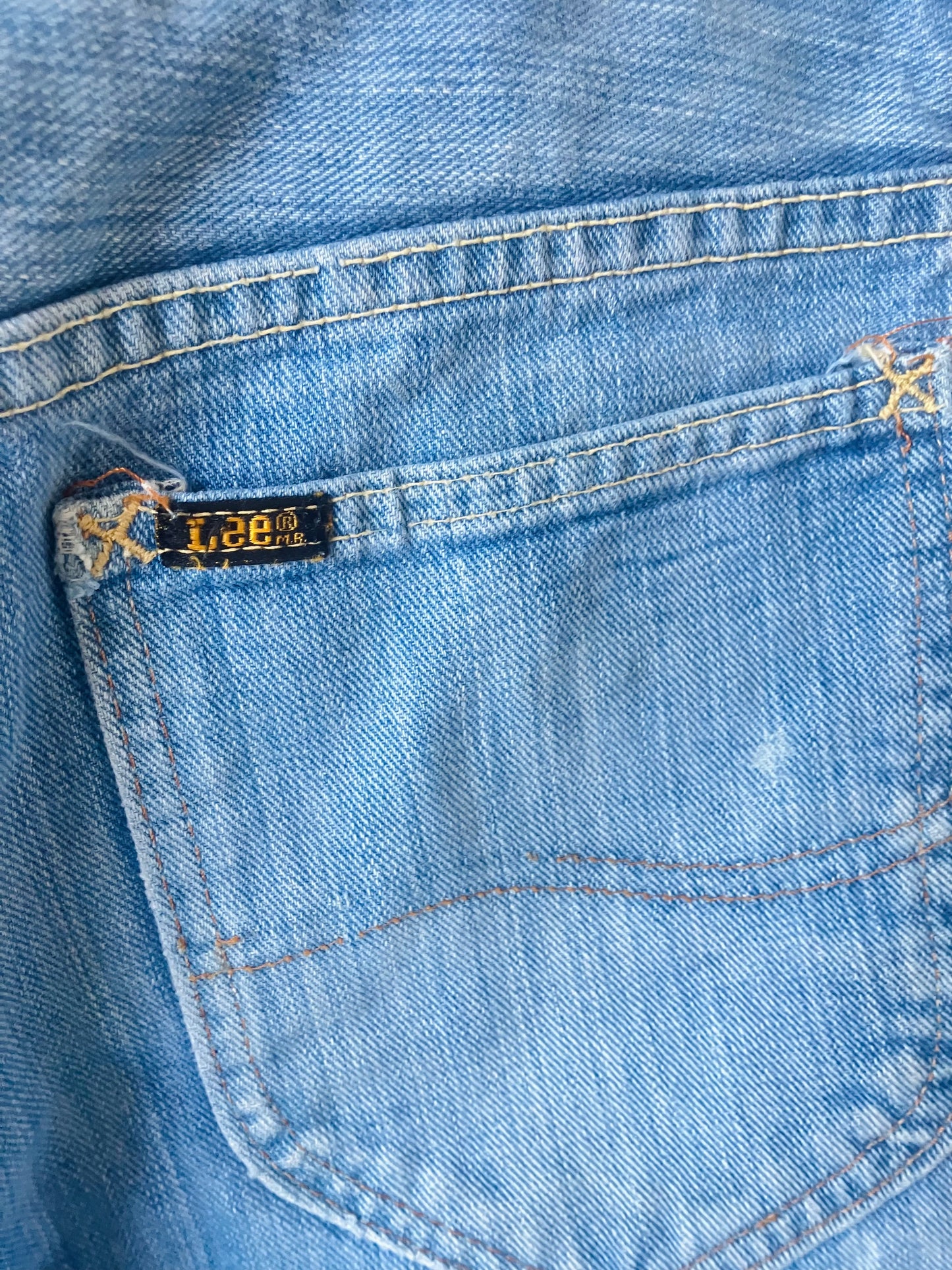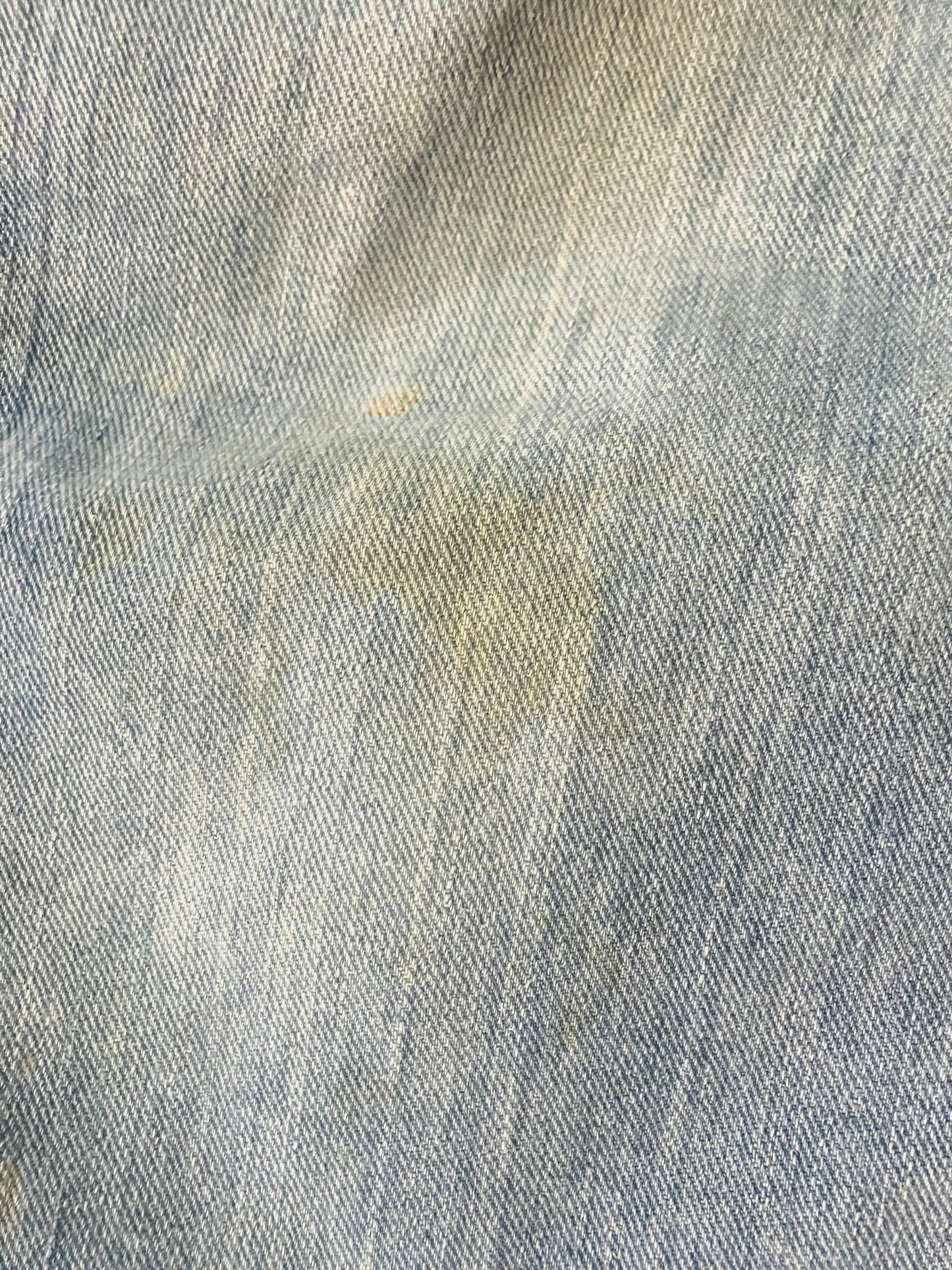 Lee Riders Light Blue Jeans in great condition with signs of wear throughout. Light brown discolorations throughout. Repaired black stitching in crotch area. Great construction and fit.