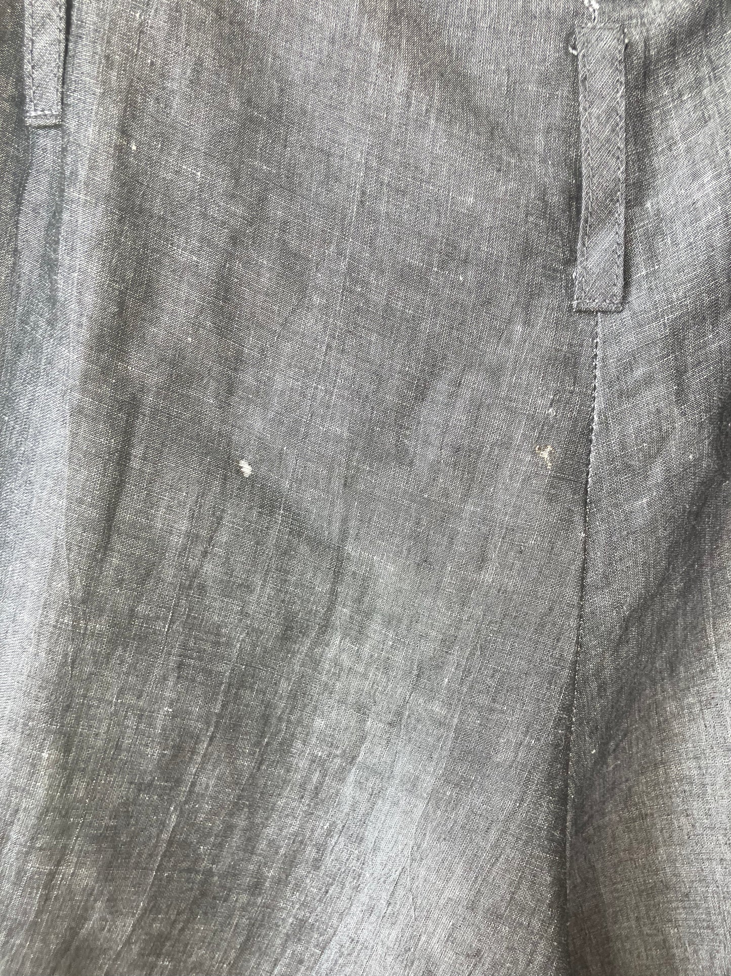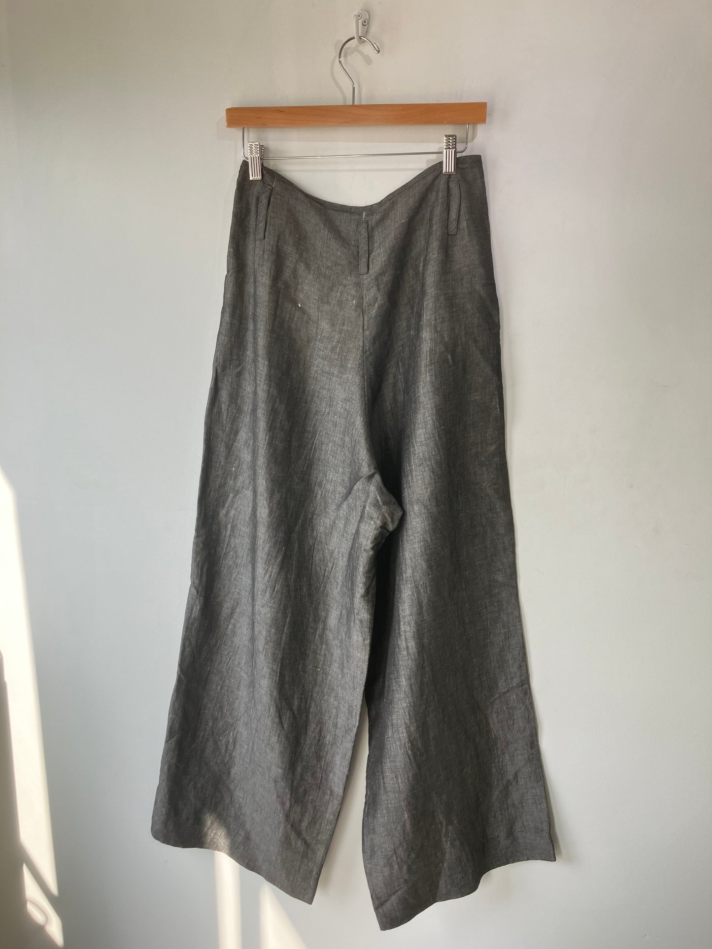 OR Grey Wide Leg Pleated Pants in great condition. Marked size L. Greyish blue with a drop crotch, button up fly, and wide flared legs. Side pockets too. These are a great shape and work for any season! Dry clean only. Made in the USA. Rayon and linen blend.