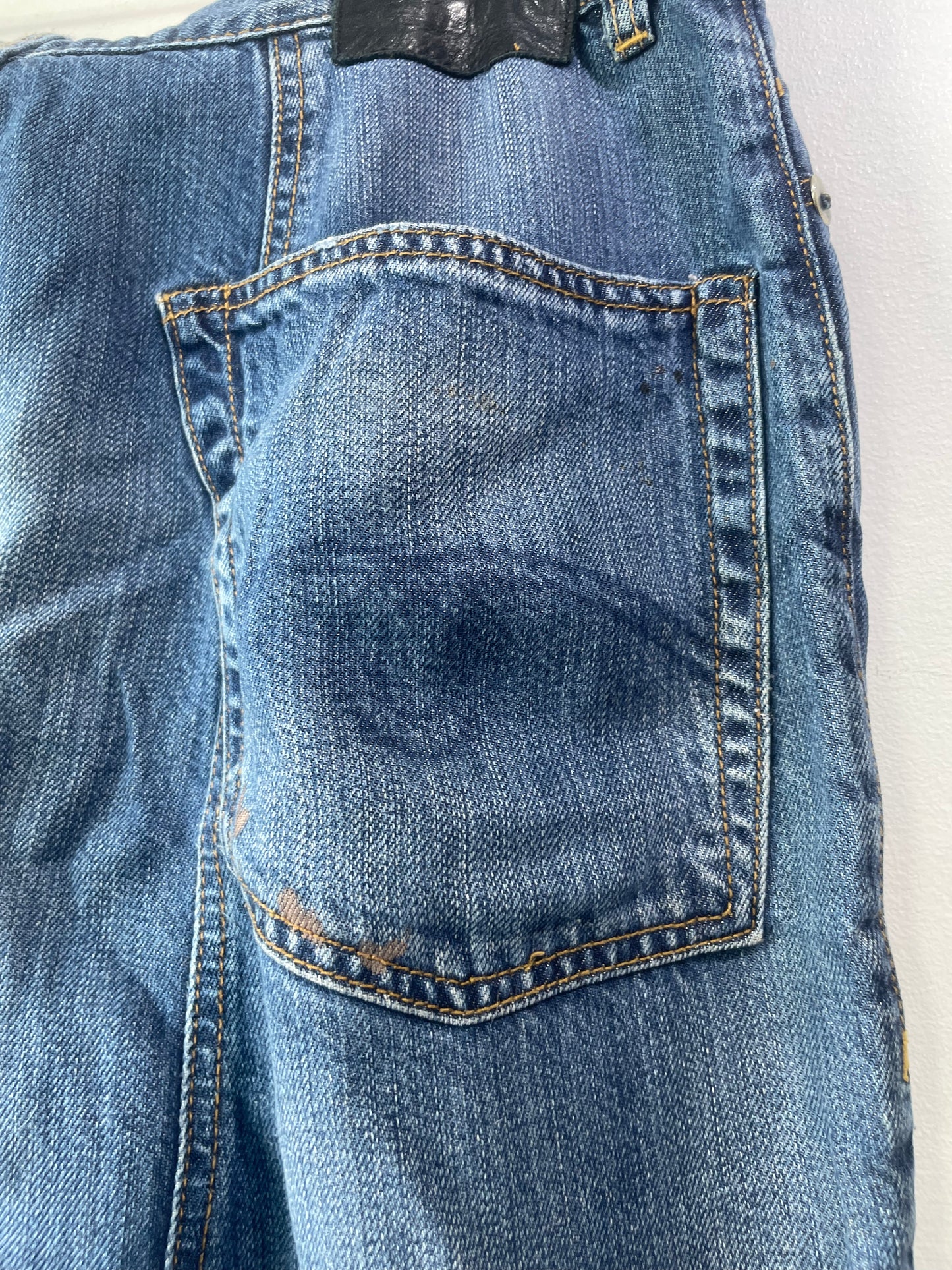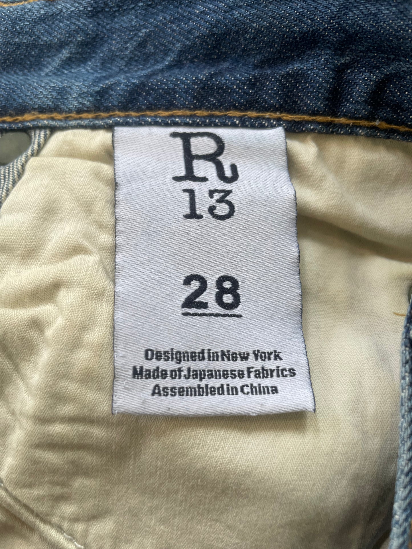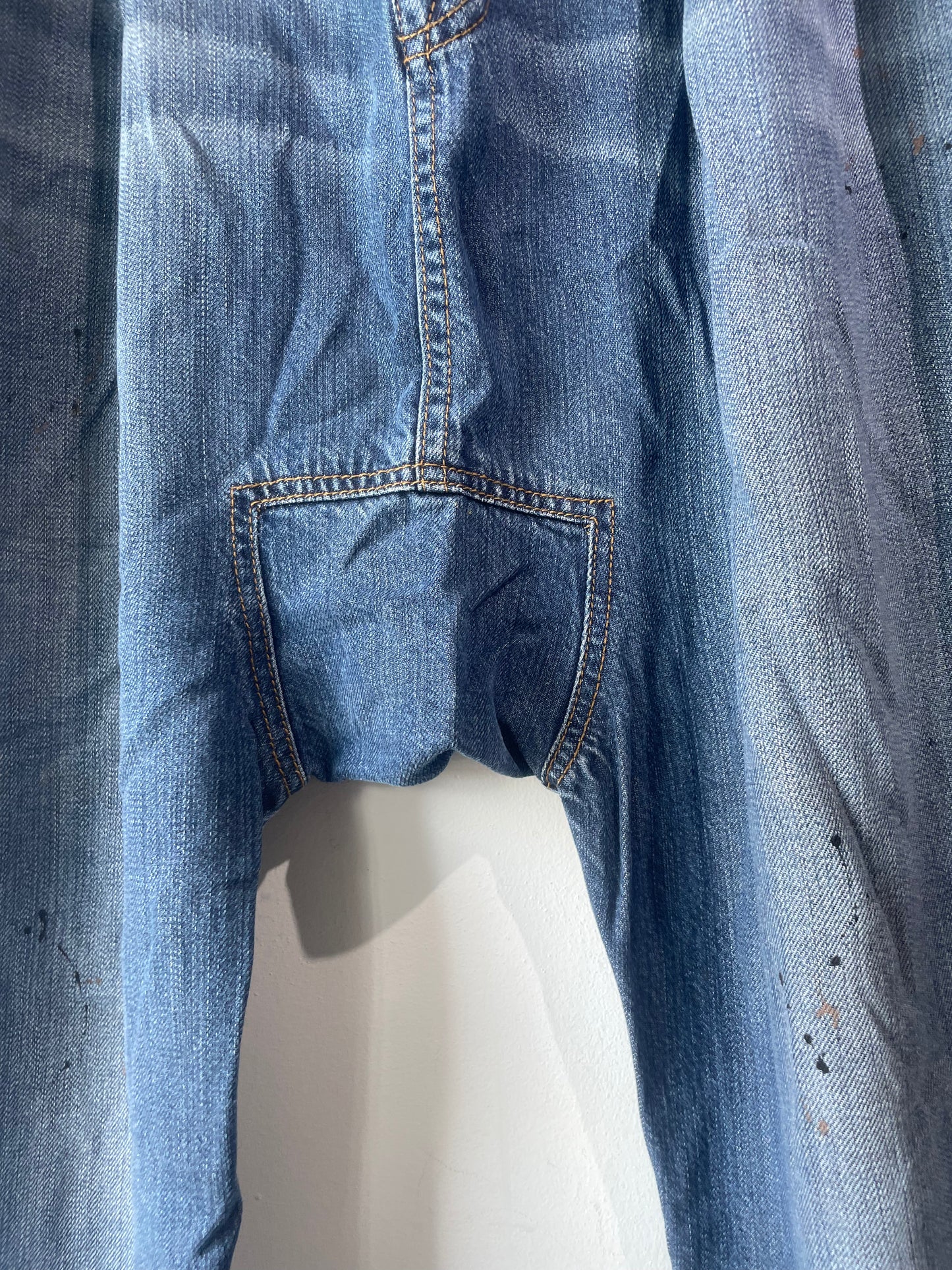 R13 Paint Splatter Drop Crotch Blue Jeans. A fun pair of jeans with a unique dropped crotch design. These also feature small paint splatter detailing on front and the classic five-pocket design. Soft and comfortable denim, designed in NY using Japanese fabrics. In very good condition. No marked material, likely cotton Marked size 28, please refer to measurements.