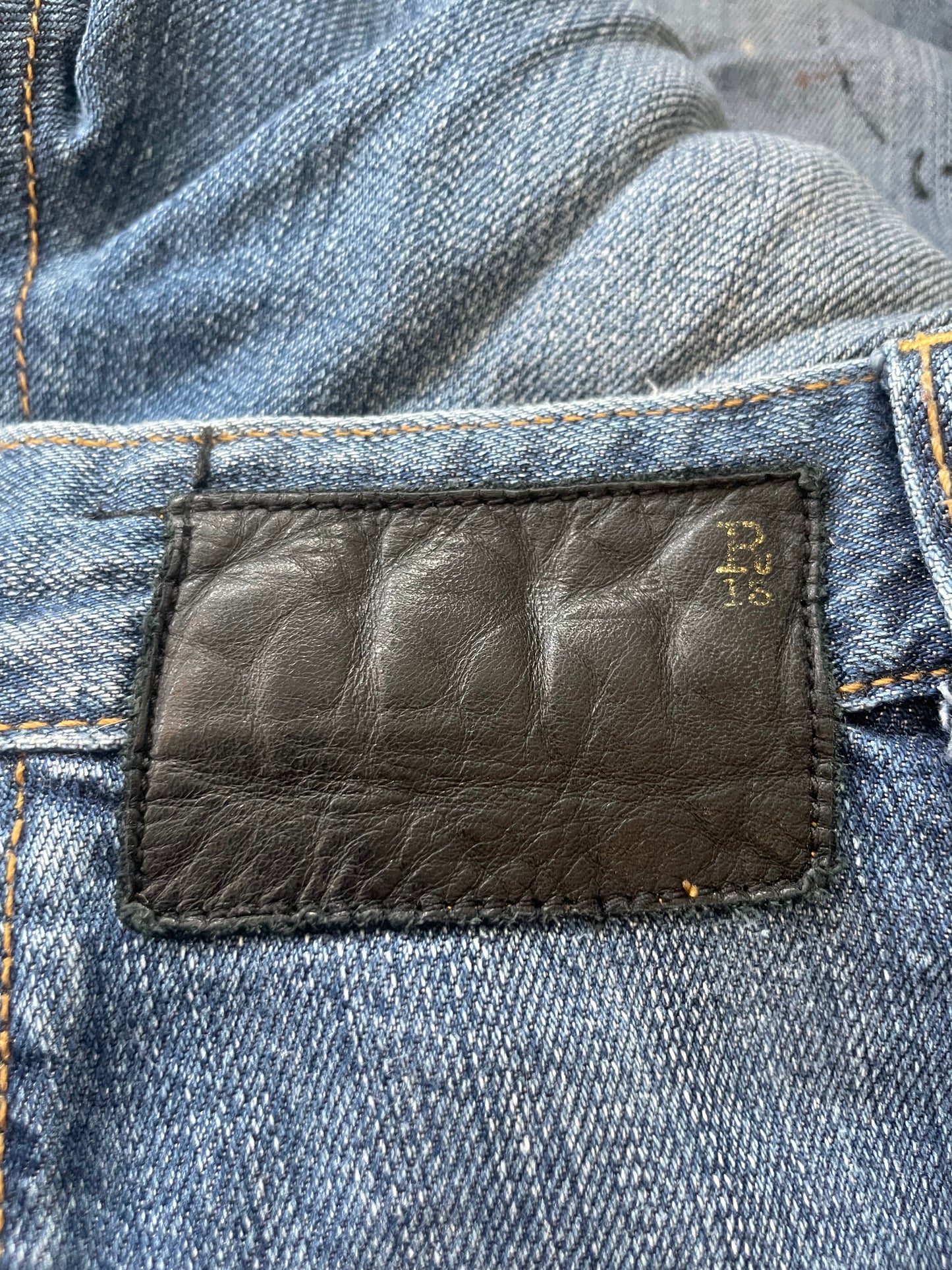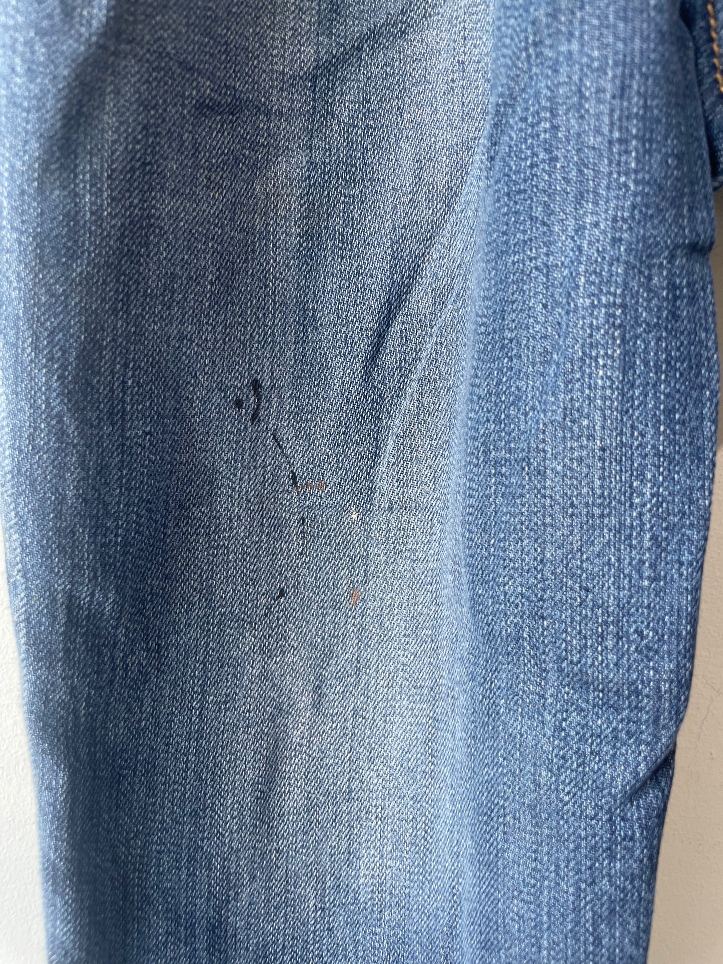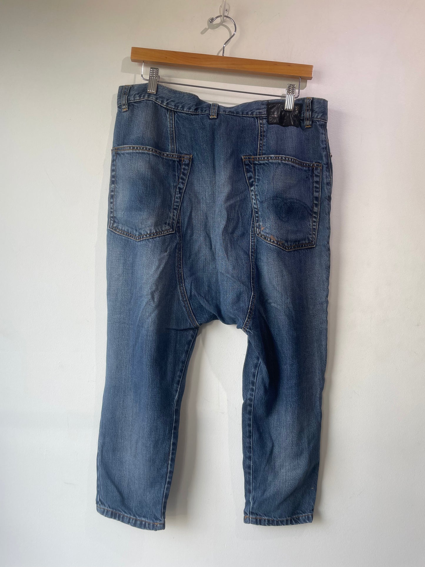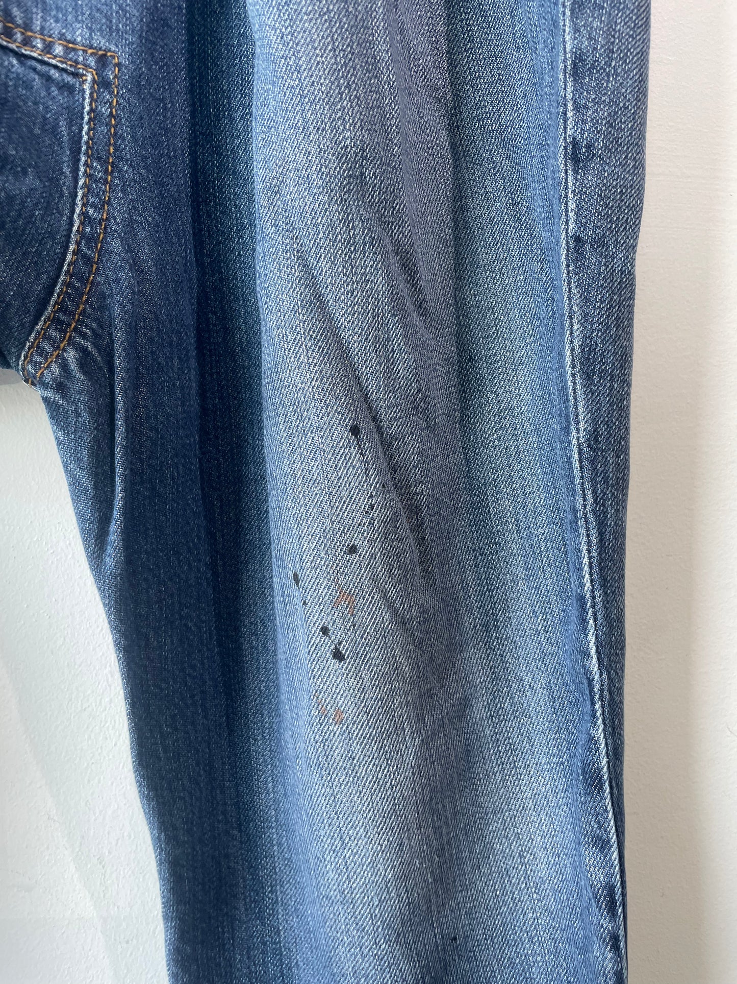 R13 Paint Splatter Drop Crotch Blue Jeans. A fun pair of jeans with a unique dropped crotch design. These also feature small paint splatter detailing on front and the classic five-pocket design. Soft and comfortable denim, designed in NY using Japanese fabrics. In very good condition. No marked material, likely cotton Marked size 28, please refer to measurements.