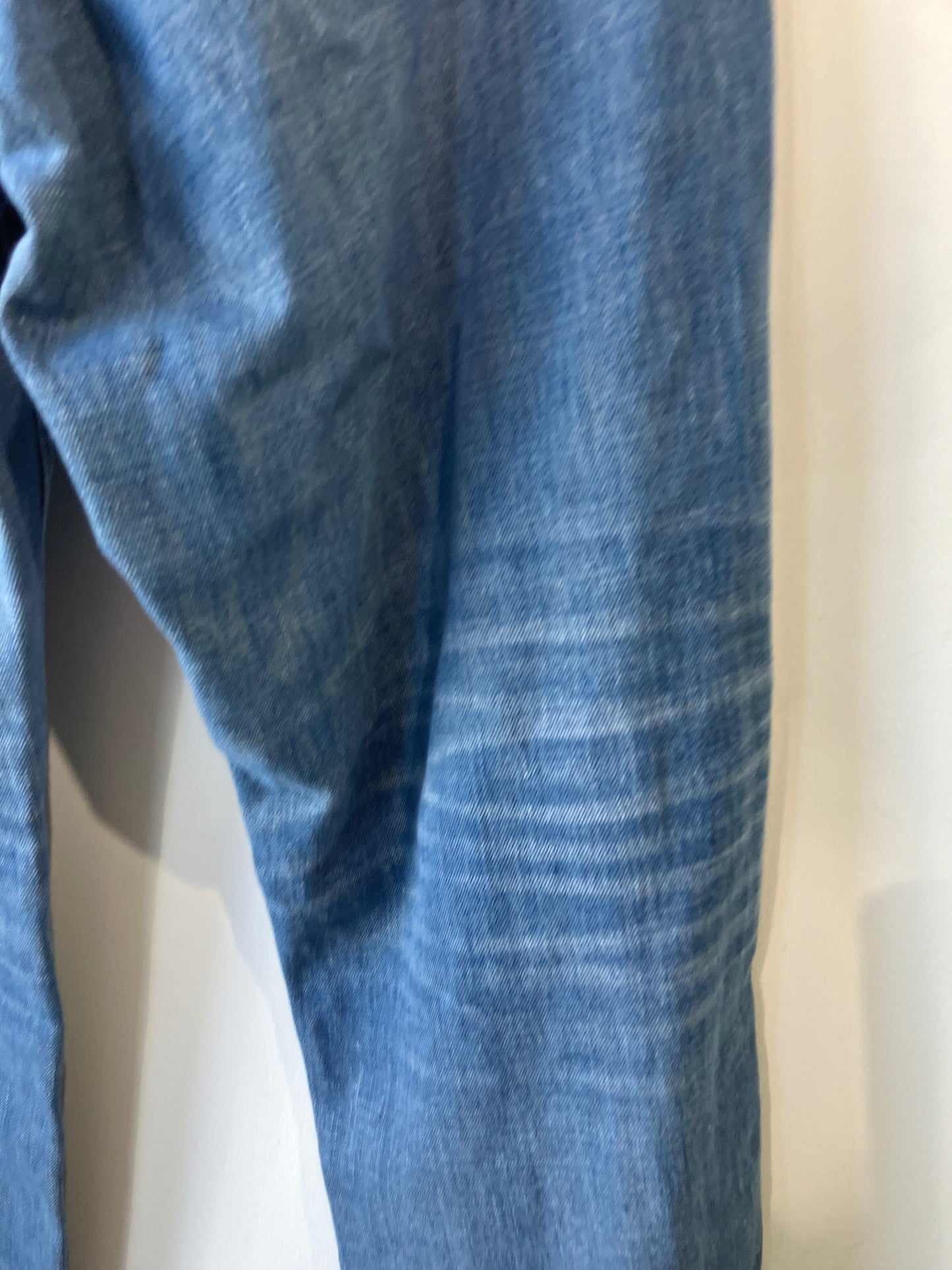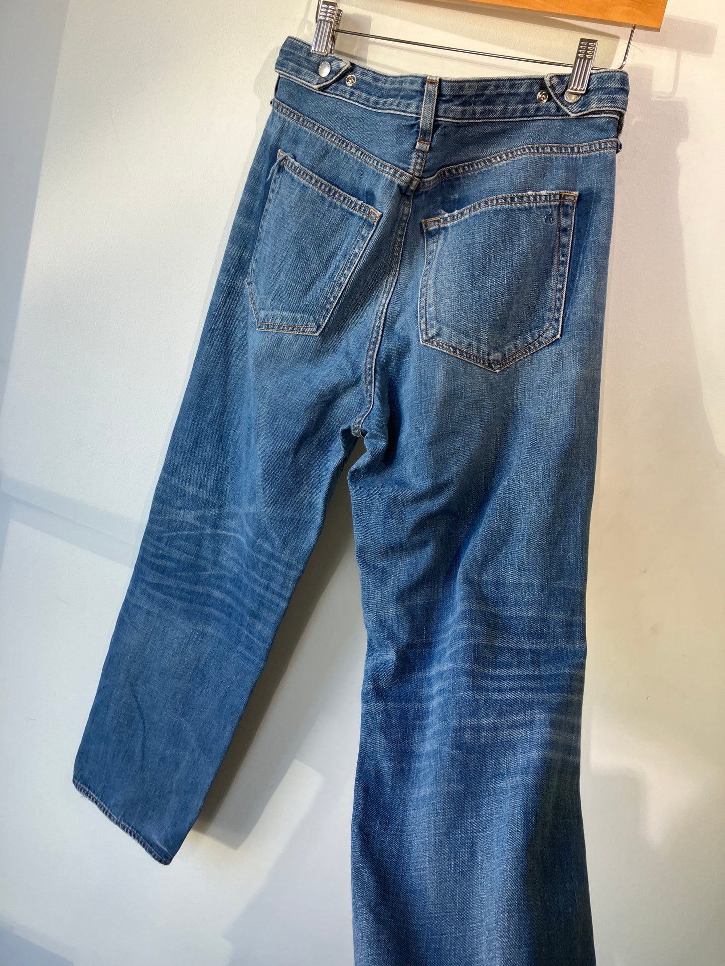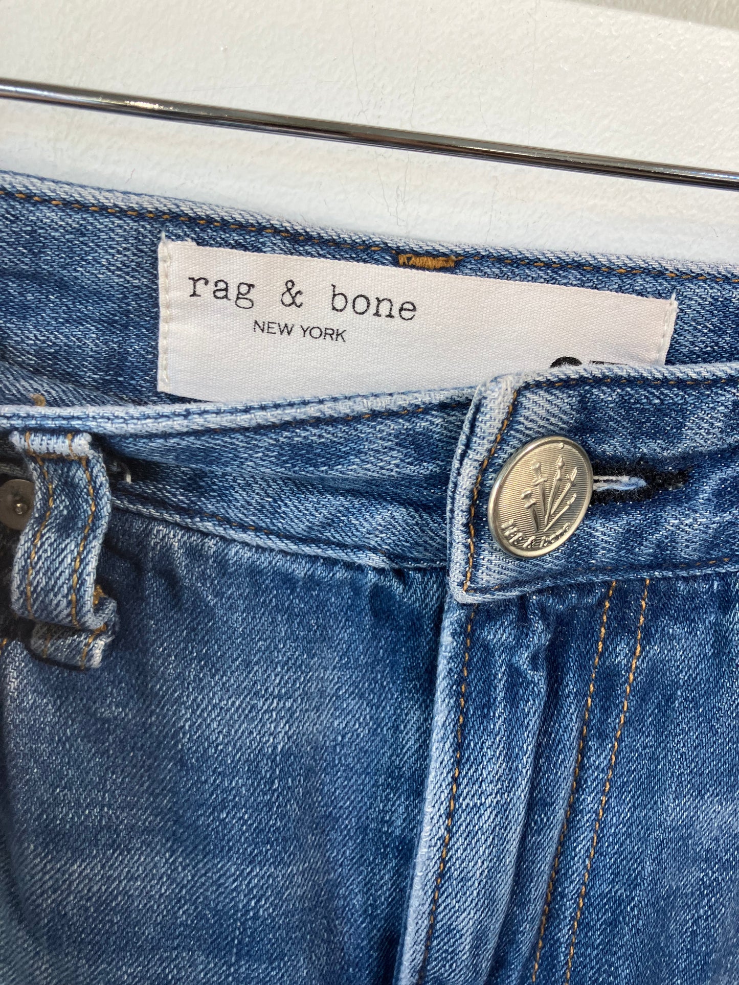 Rag & Bone Blue Distressed Denim Jeans in excellent condition. Nice wide leg and comfortable fit. Marked size 27 US. Made in USA with imported material. Machine wash cold. 100% cotton. The perfect pair you'll always want to wear. Button cinching on belt loop for loosening or tightening.