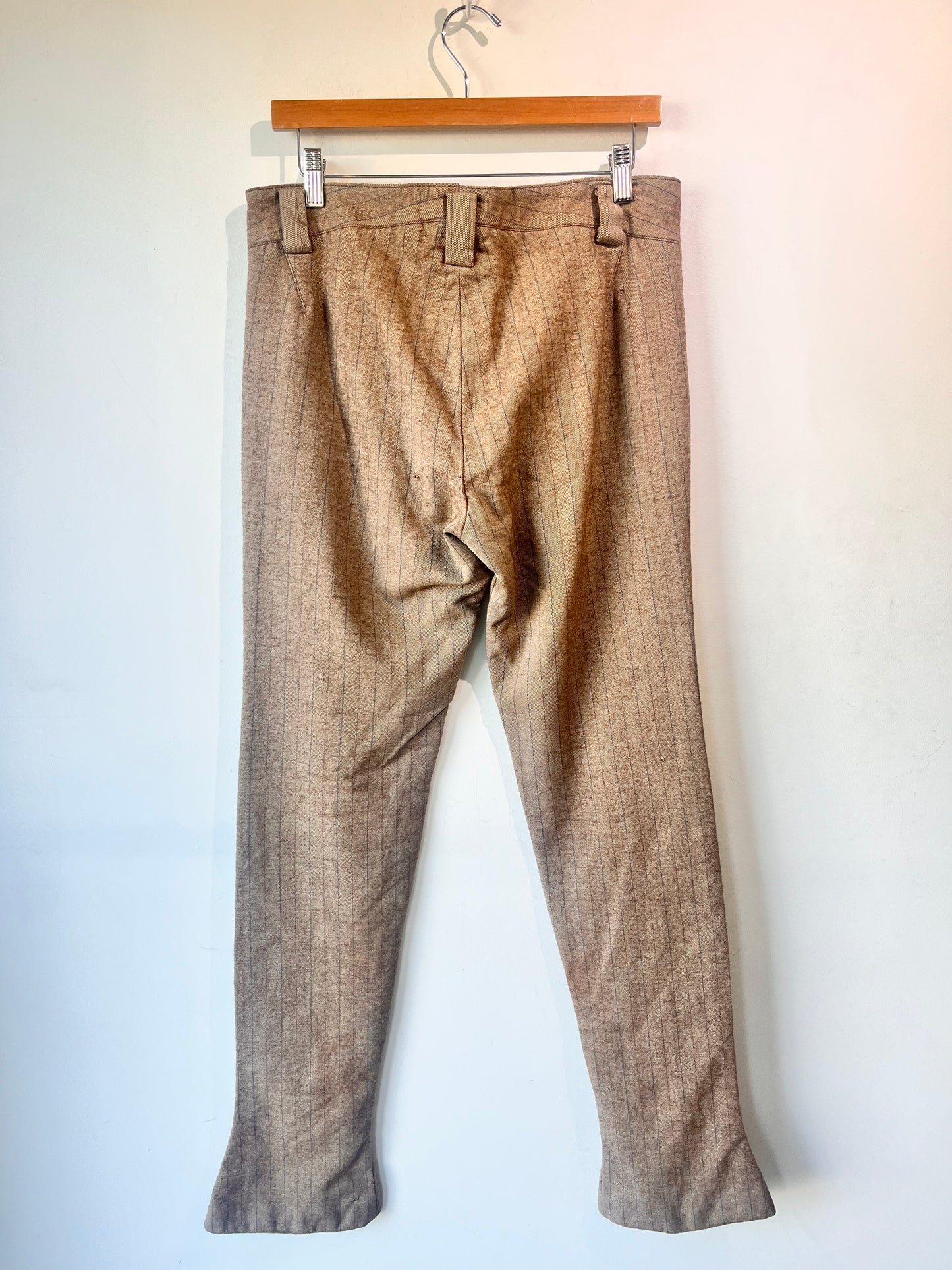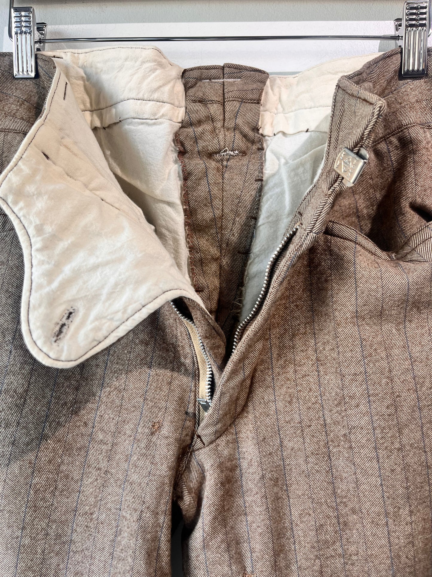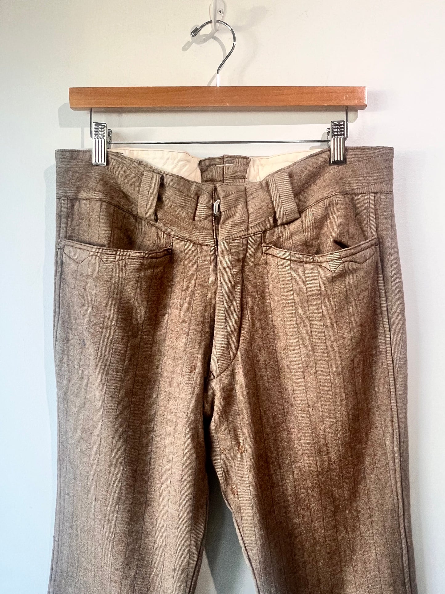 Vintage 1940s Brown Herringbone Western Pants. These fabulous trousers would have Katherine Hepburn swooning. Featuring a soft brown herringbone wool with a faint blue pinstripe and western style topstitching at the front pockets. The high waist is just begging for you to tuck (and maybe add a set of clip on suspenders to complete the look). The flared bootcut hem finishes the look with sass and style. Pants show light signs of age and a few repairs add to the charm. No Label. Fully lined in cotton muslin.