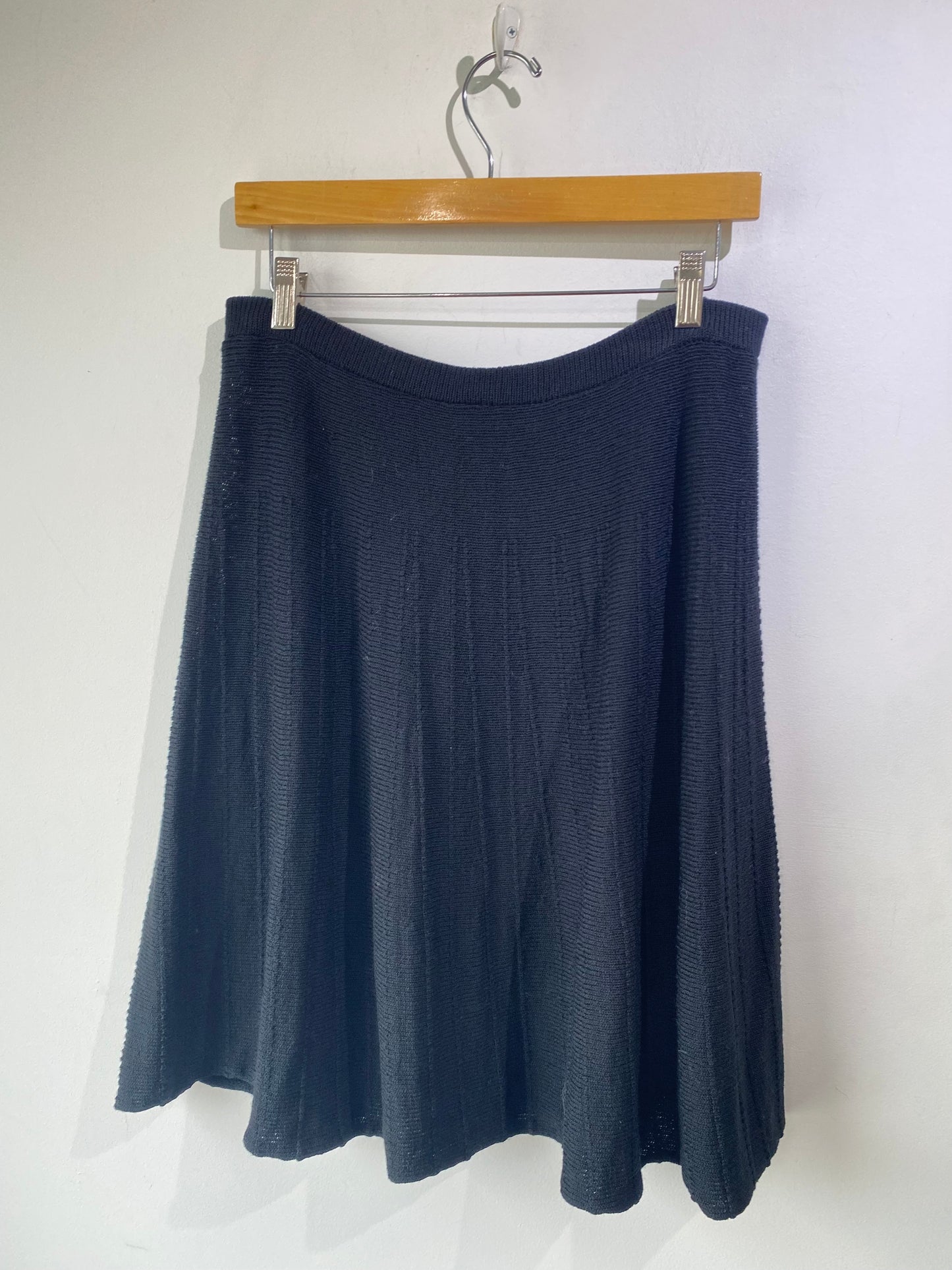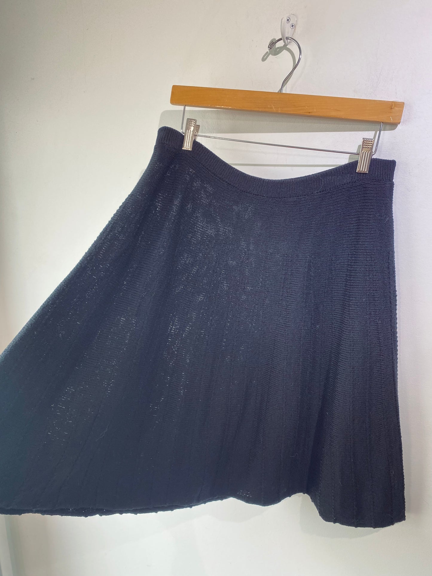 Vintage Black Knit Skirt in great condition. Stretchy and heavy knit feel with a great bounce to it. Would look cute with pumps or sneakers! A tad sheer when fabric is against light. Missing material tag, feels like cotton synthetic blend. Fits L/XL best. Hand wash cold.