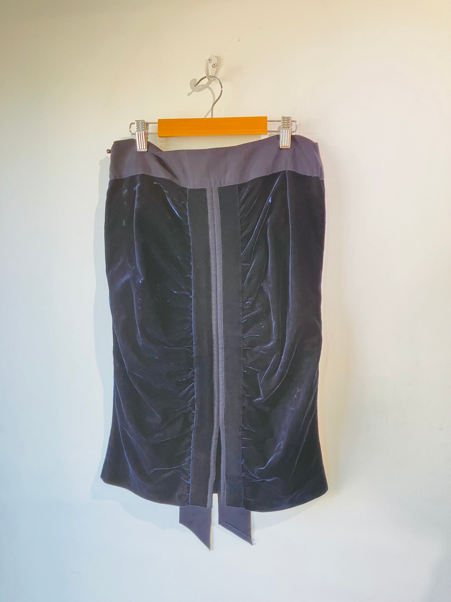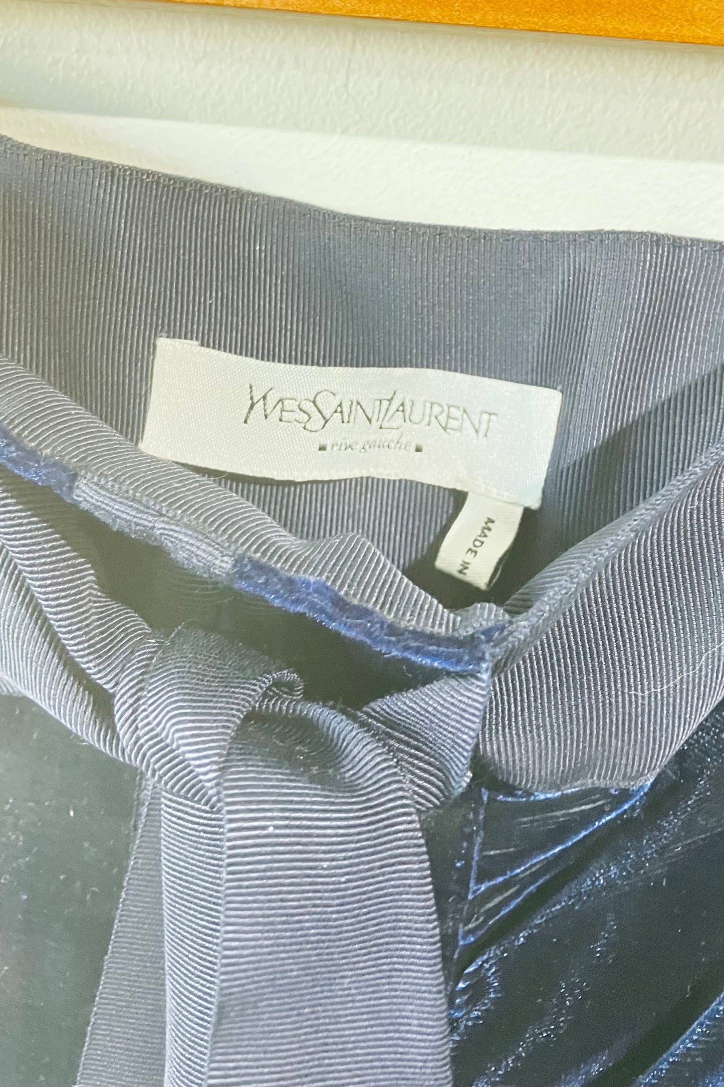 Vintage Yves Saint Laurent Rive Gauche Navy Blue Velvet Skirt. Incredibly fun and gorgeously made. Fully Lined. Richly colored and extremely soft! Oversized ribbon bow front and center ruching. Flirty center slit up the back. Really unique and glamourous. Zipper up the side. Made in France. Best fits M. 73% Acetate, 19% cotton, 8% silk.