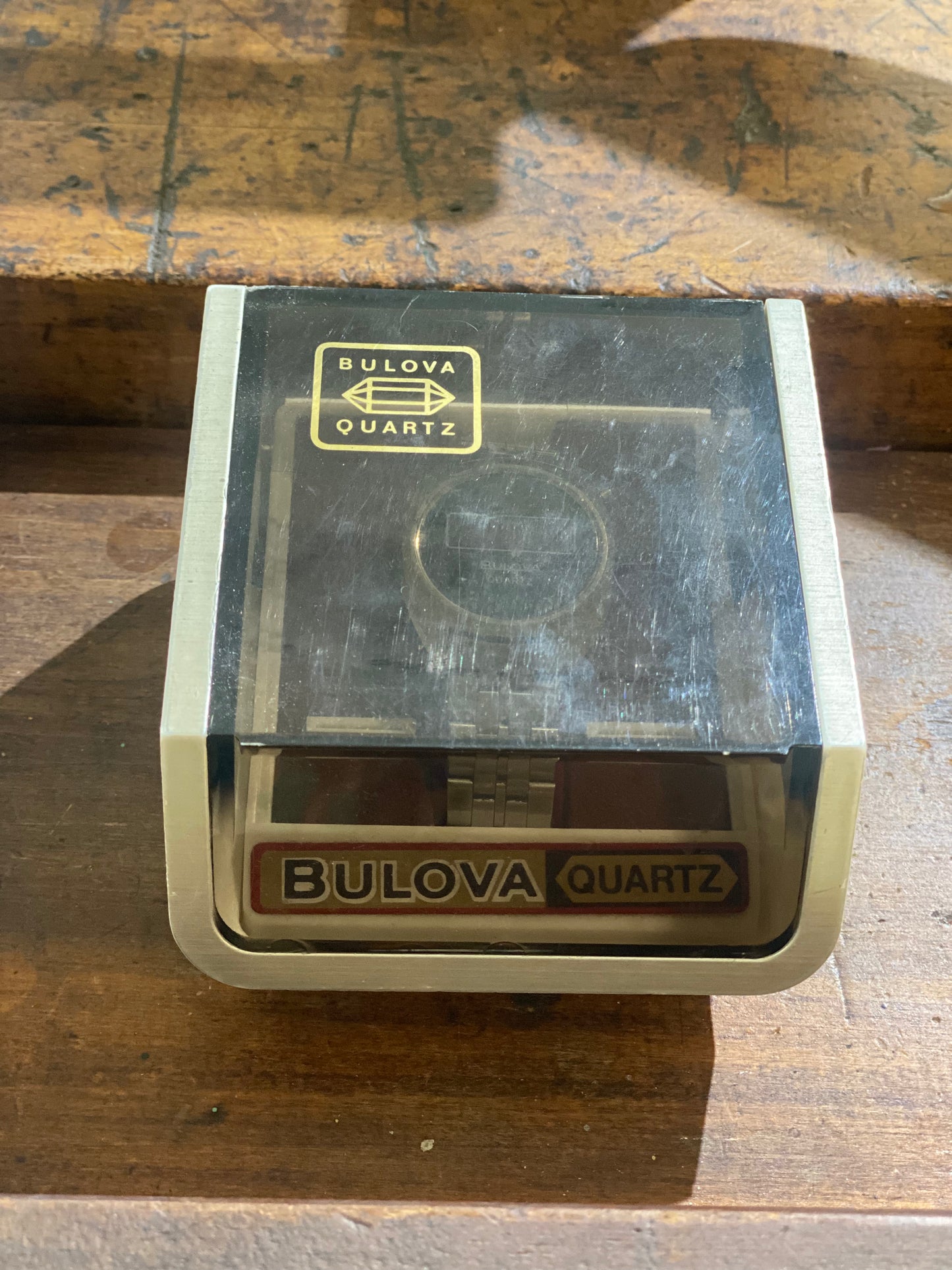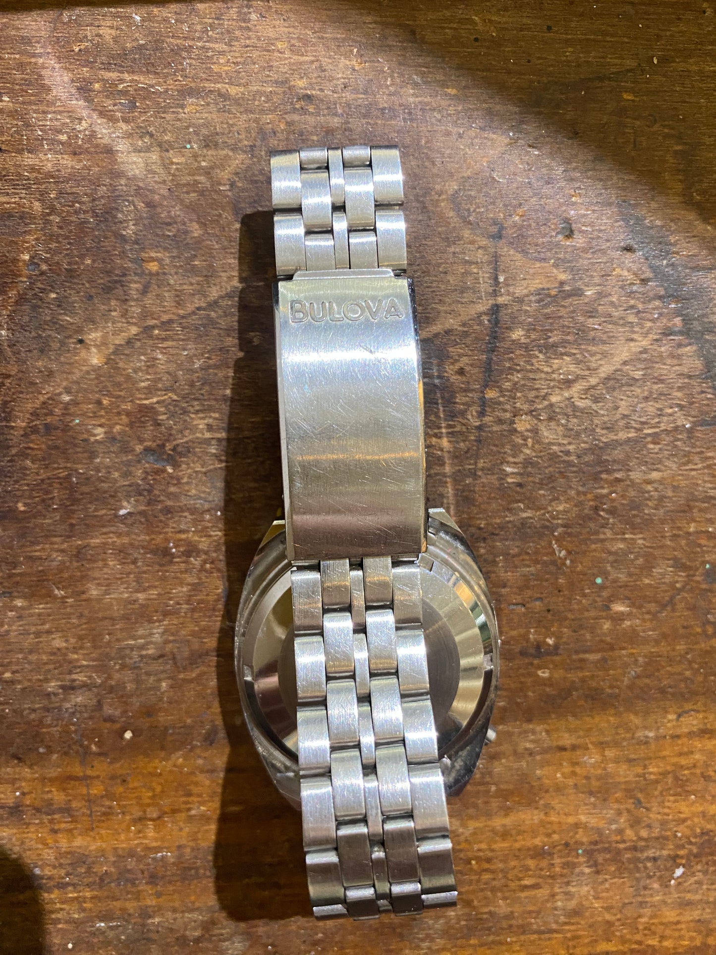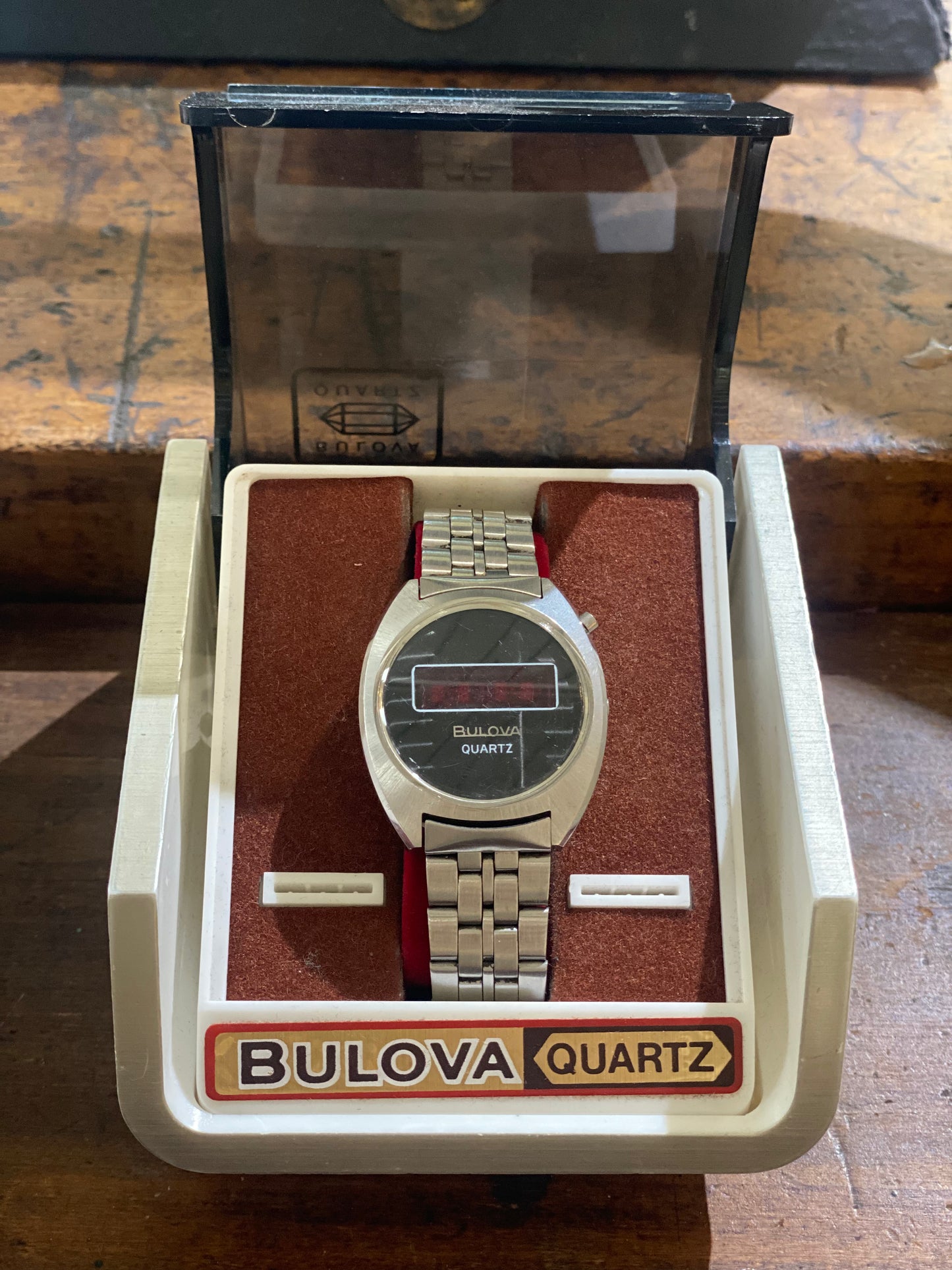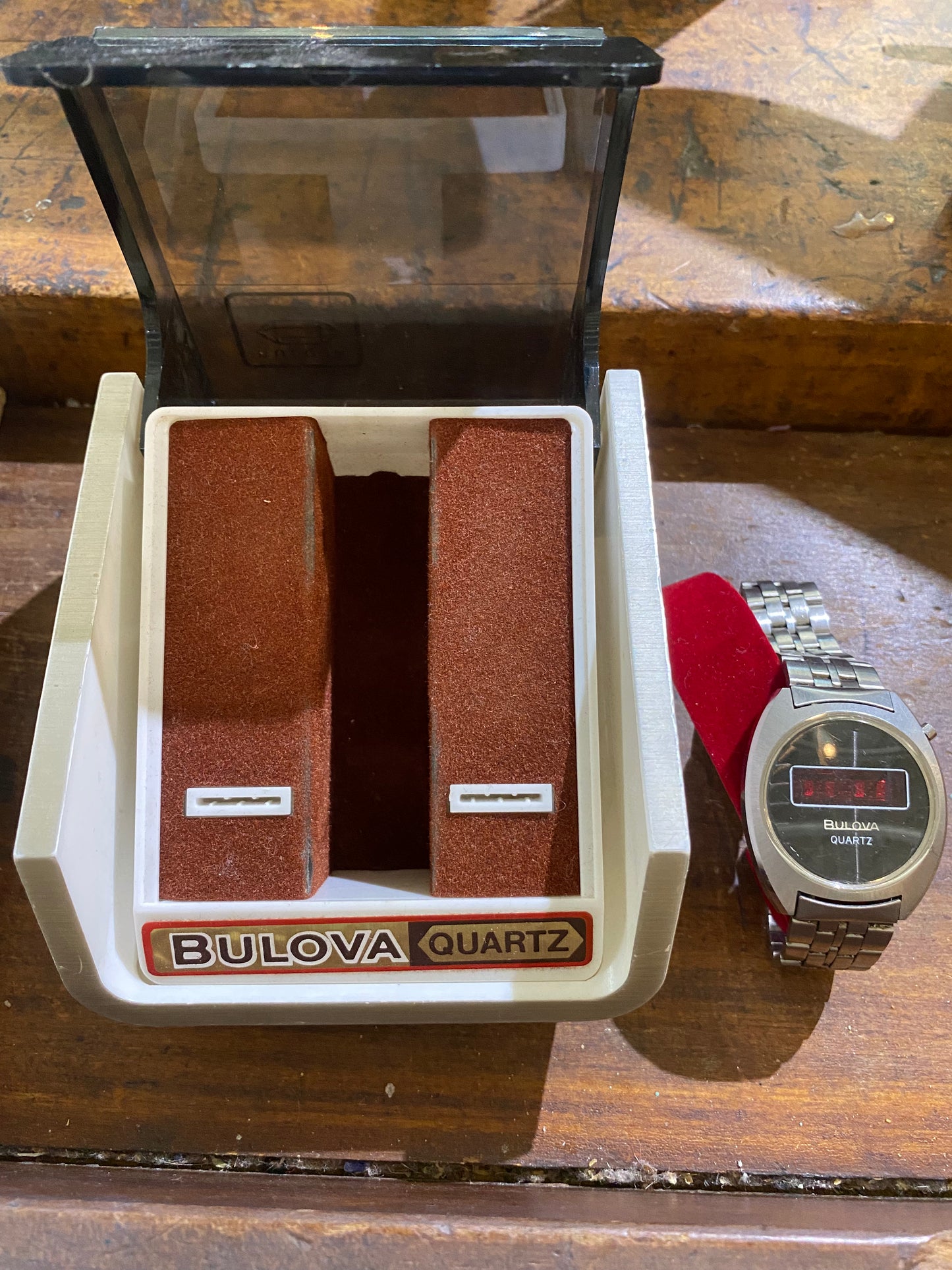 Vintage Bulova Quartz Watch in great condition - Freshly Serviced! Includes storage/display case. Digital display - numbers light up in red when side button is pressed. Fits gentlemen nicely or can be worn bracelet-like on a smaller wrist, OR you can easily have some links removed. (Our watch guy can likely help with this!)