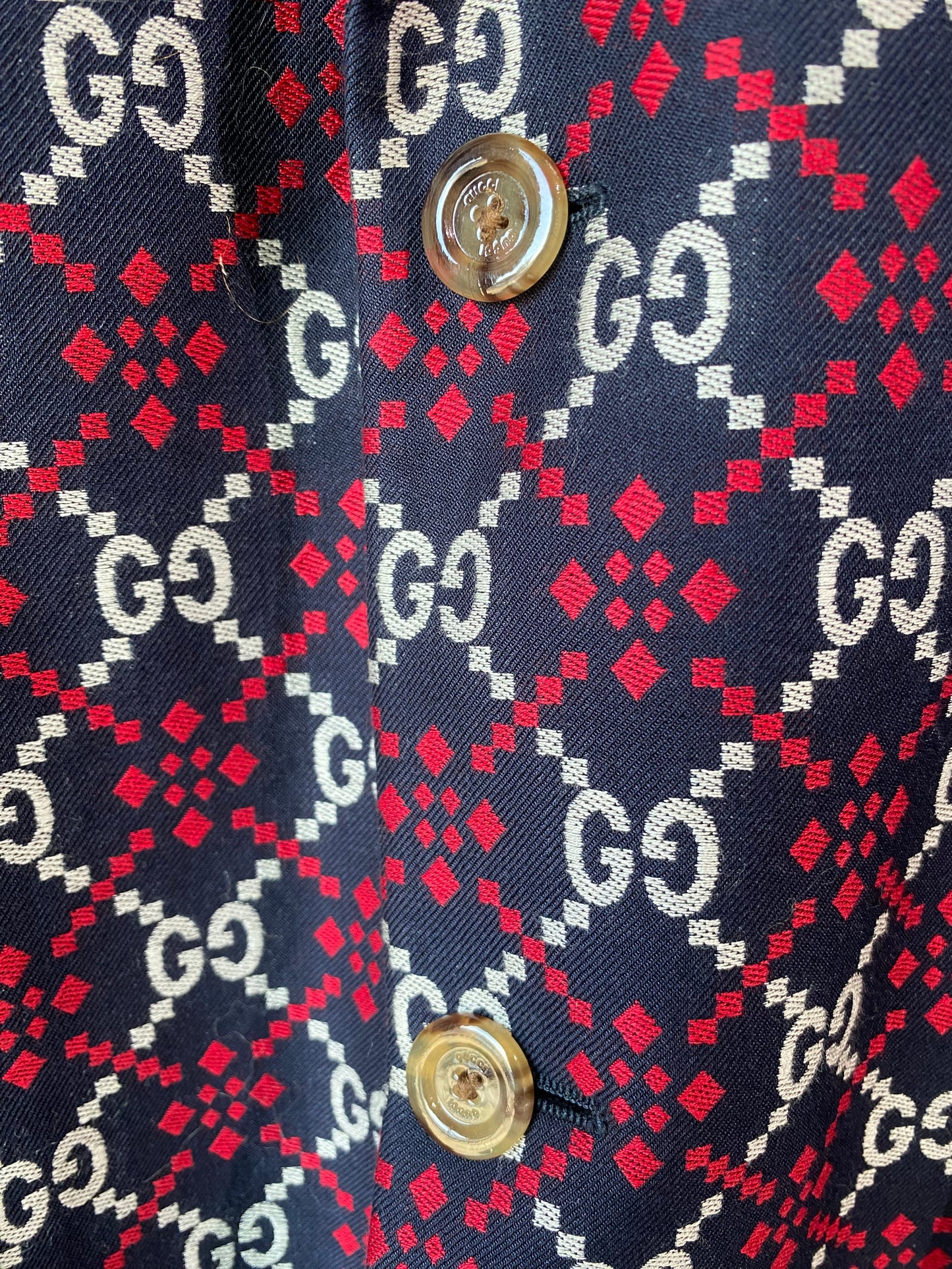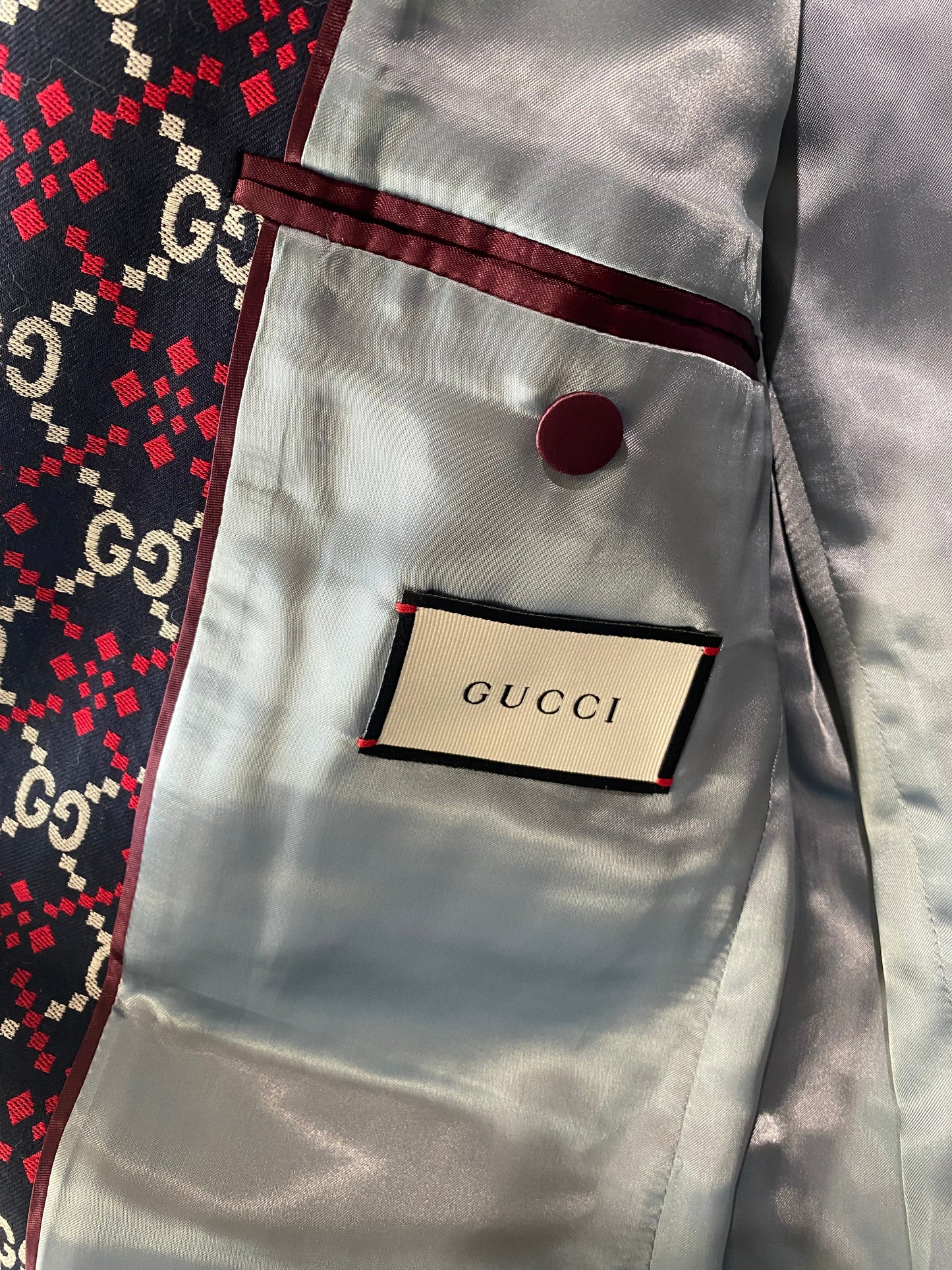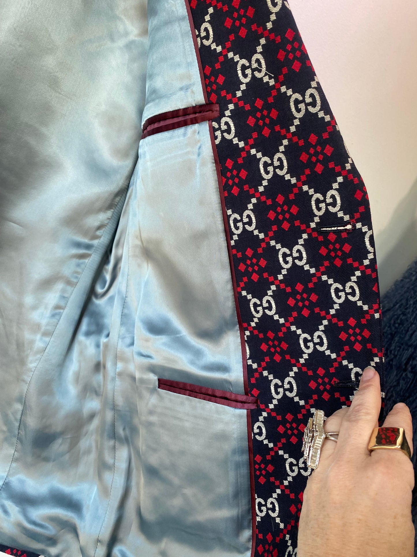 Authentic Gucci Navy, Red, and White GG Monogram Blazer. A classic Gucci monogram printed blazer is as good as it gets! Three front pockets with a fourth breast pocket. Three interior pockets, one buttons shut with a purple silk button. Bodice of the jacket is fully lined in silver silk, sleeves are lined in a white striped silk that can be exposed by rolling the sleeves up. Tortoise shell buttons going up the front and on the sleeves. In excellent, like new condition. Made in Italy. Unmarked size, best fits Small (oversized), Medium or Large women's and Small to Medium men's.