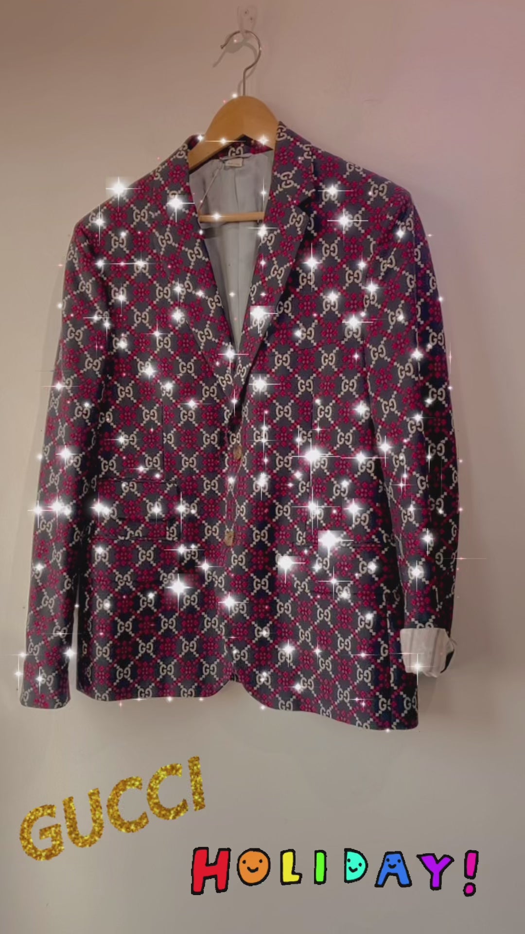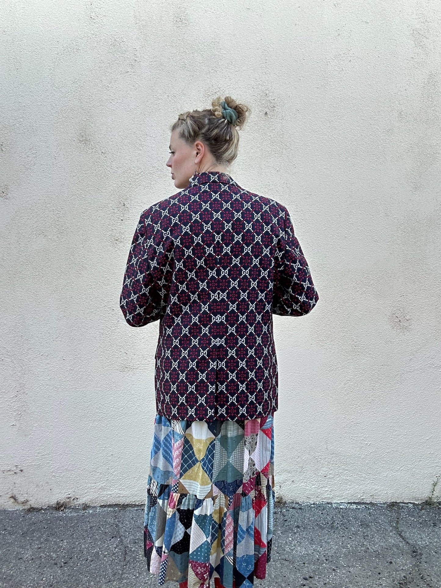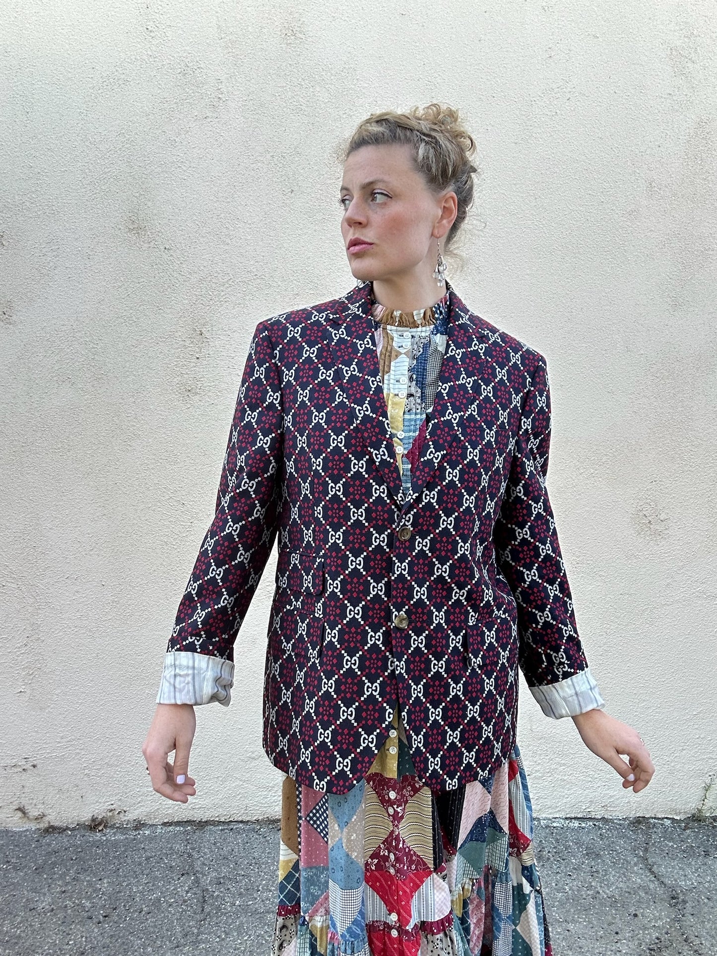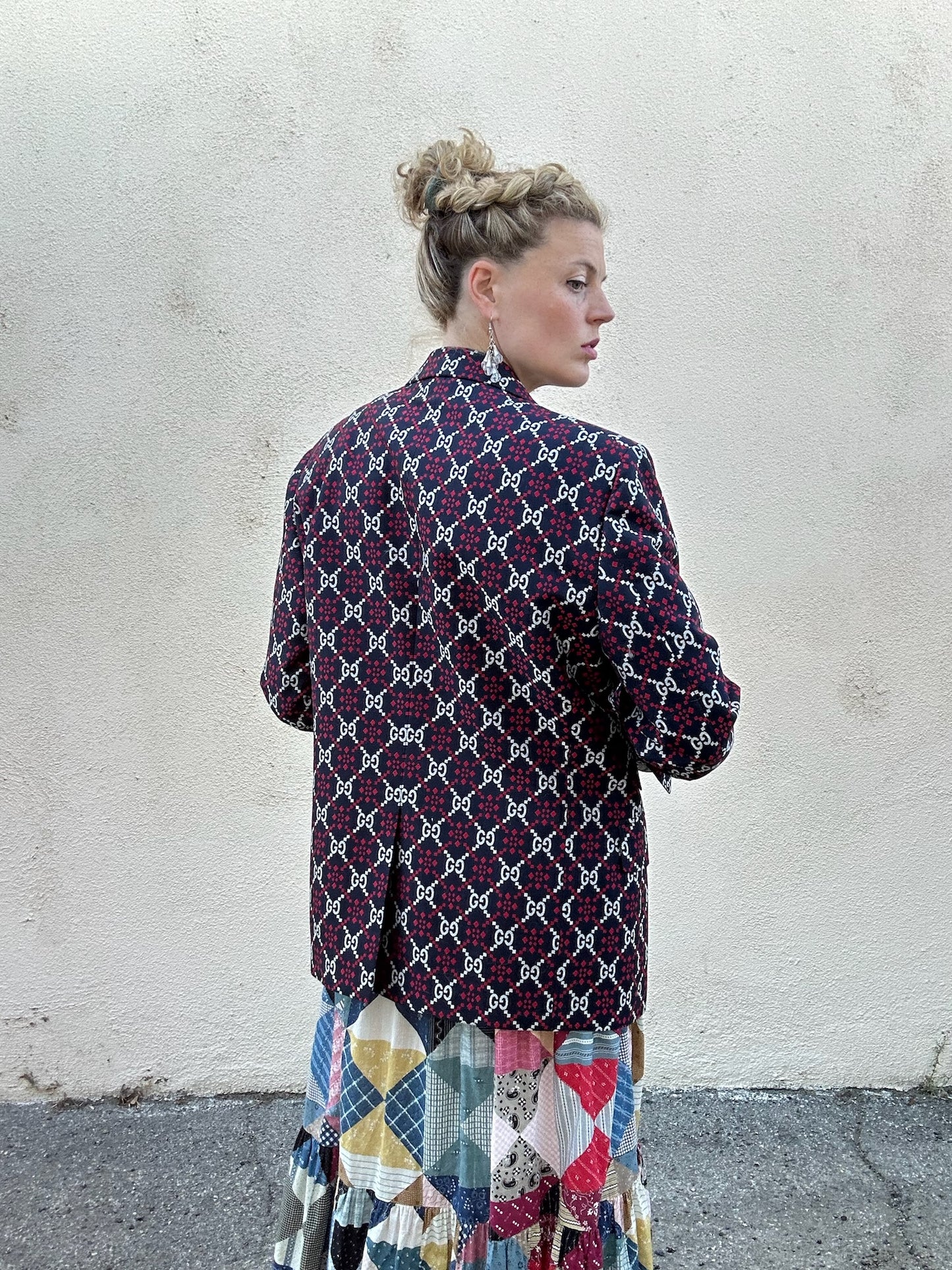 Authentic Gucci Navy, Red, and White GG Monogram Blazer. A classic Gucci monogram printed blazer is as good as it gets! Three front pockets with a fourth breast pocket. Three interior pockets, one buttons shut with a purple silk button. Bodice of the jacket is fully lined in silver silk, sleeves are lined in a white striped silk that can be exposed by rolling the sleeves up. Tortoise shell buttons going up the front and on the sleeves. In excellent, like new condition. Made in Italy. Unmarked size, best fits Small (oversized), Medium or Large women's and Small to Medium men's.