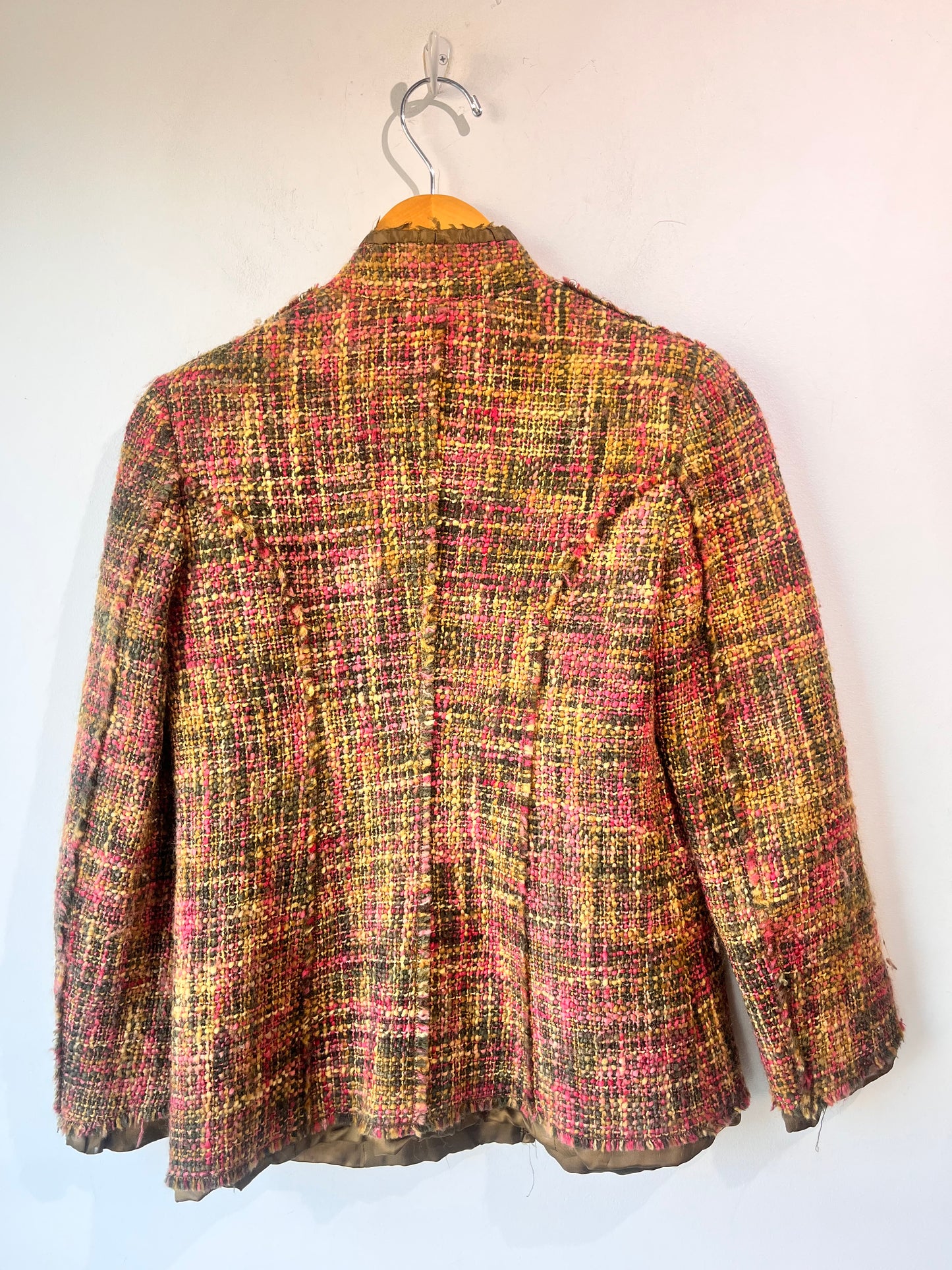 Philosophy Pink and Green Tweed Jacket with Detachable Leopard Collar. This lady like tweed jacket takes a walk on the wild side with an optional large leopard collar with shawl lapel. Remove the collar and you have yourself a classically chic tweed jacket with hidden snap front closure, stand collar and two waist pockets with flaps. The olive acetate lining extends beyond the edging to create a gathered ruffle trim. Any way you wear it, this beautiful jacket will surely make an impression.