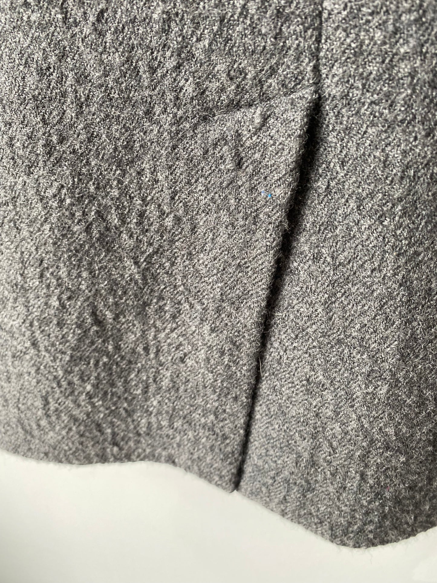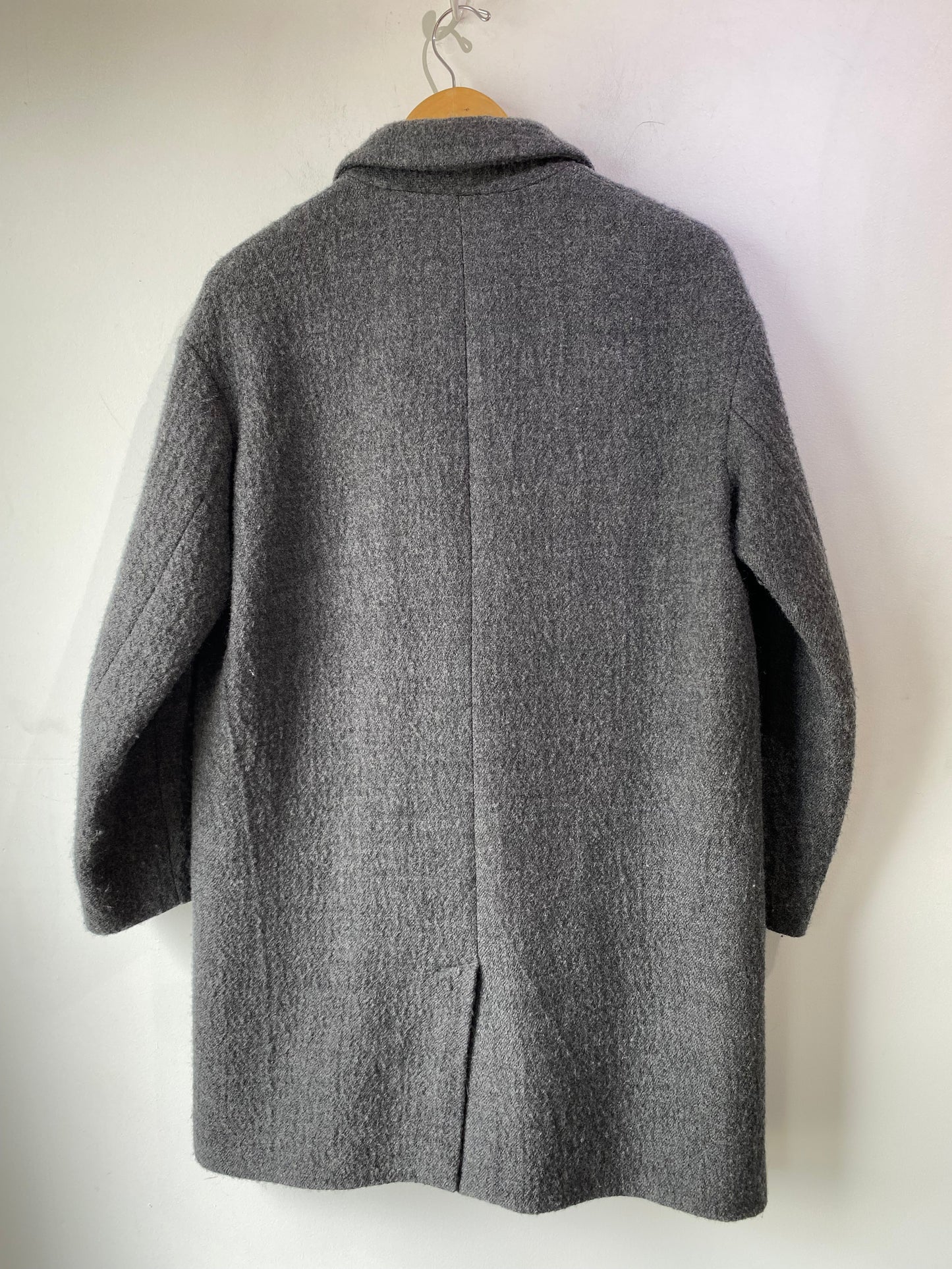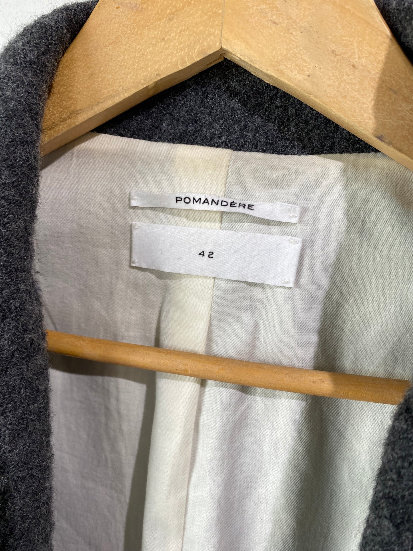 Pomandere Grey Wool Coat in great condition. Linen lined pockets and back, sleeves are lined with a smooth satin. Great fit, modern and warm. Single large button closure at waist. 51% Laine wool, 49% cotton. Marked size 42 EU, size 8 US. Lining is 100% viscose. Dry clean. Made in Italy. Displaying minor piling throughout. Sold as is.