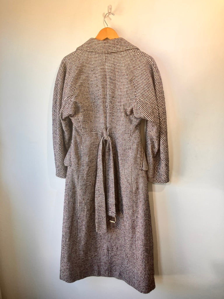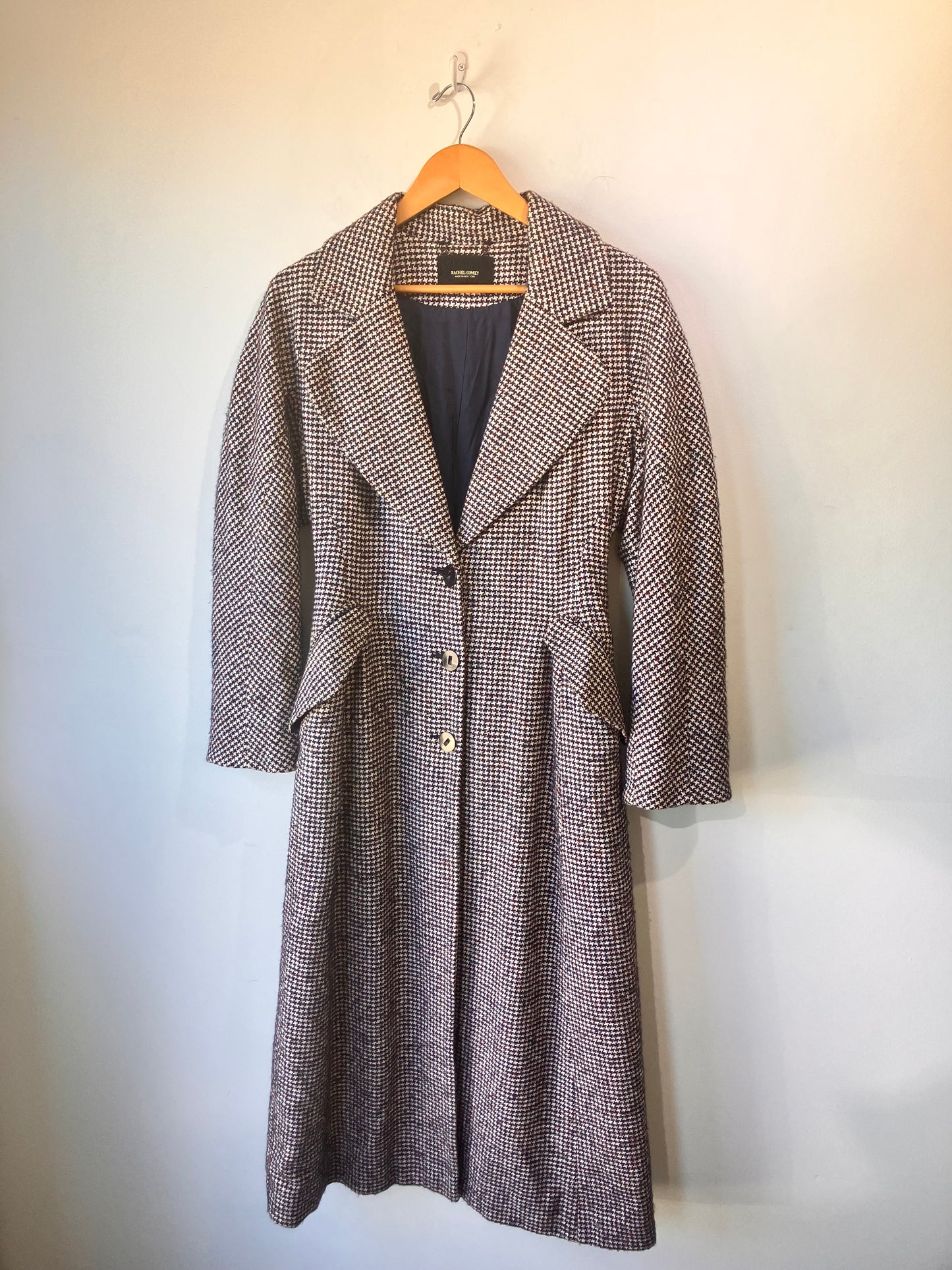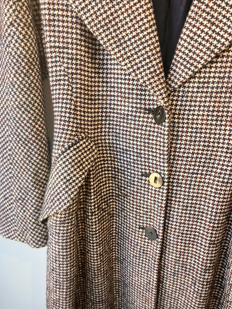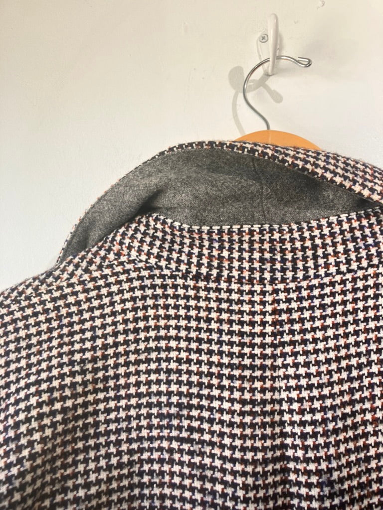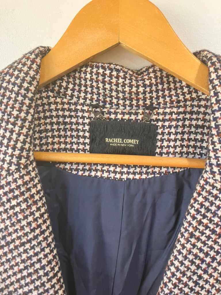 Rachel Comey Houndstooth Wool Coat in excellent condition. Just absolutely darling collar and body combo. A cozy sleek vintage vibe. Unmarked size, fits like a Small/Medium. Lined with satin inside. Has hidden side pockets and two front closure clasps. Looks cute worn open as well. Marked size 2. Fits XS/S. Dry clean only. Do not wash. 49% cotton, 34% wool, 17% polyester. 100% rayon lining.