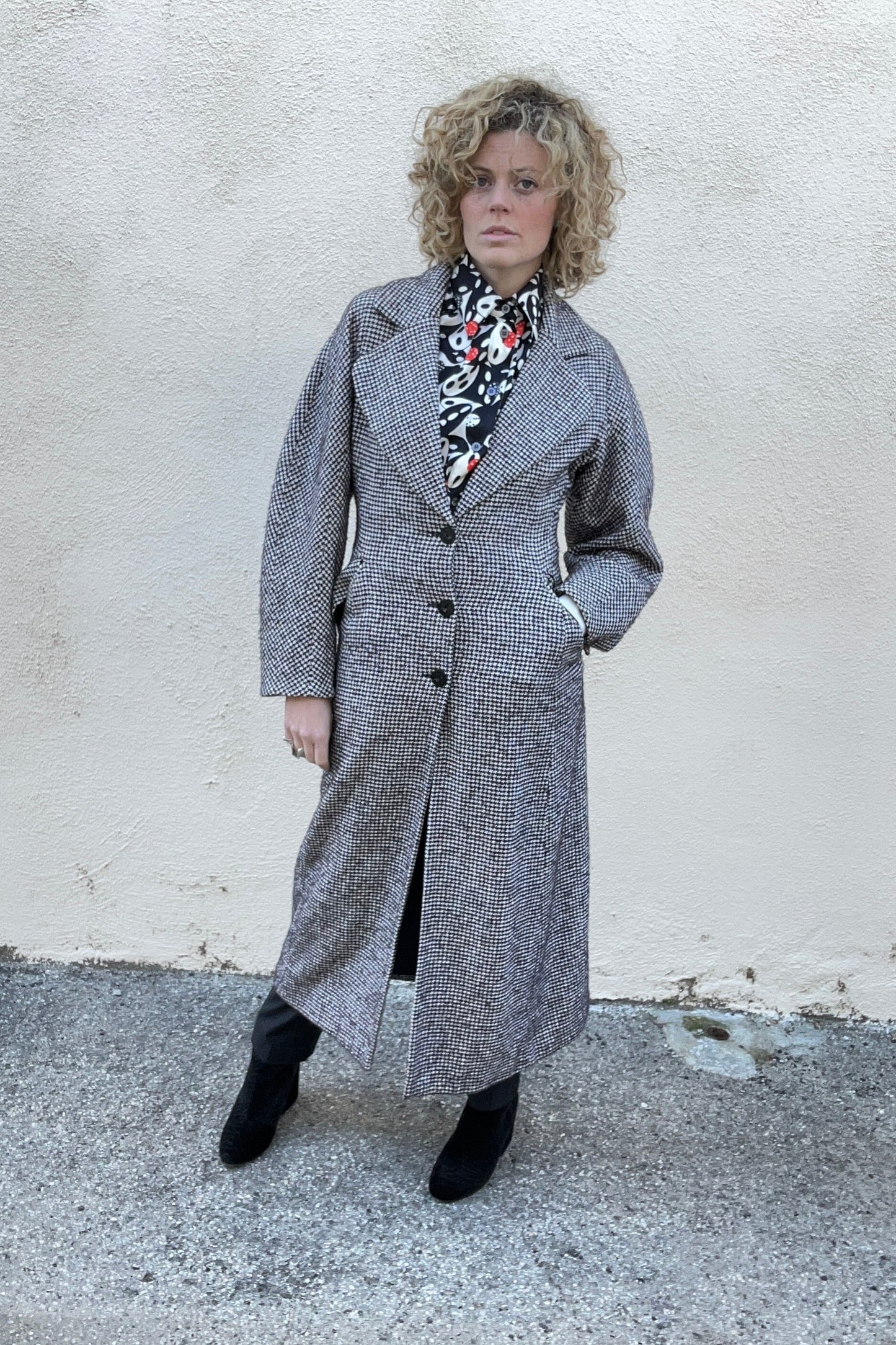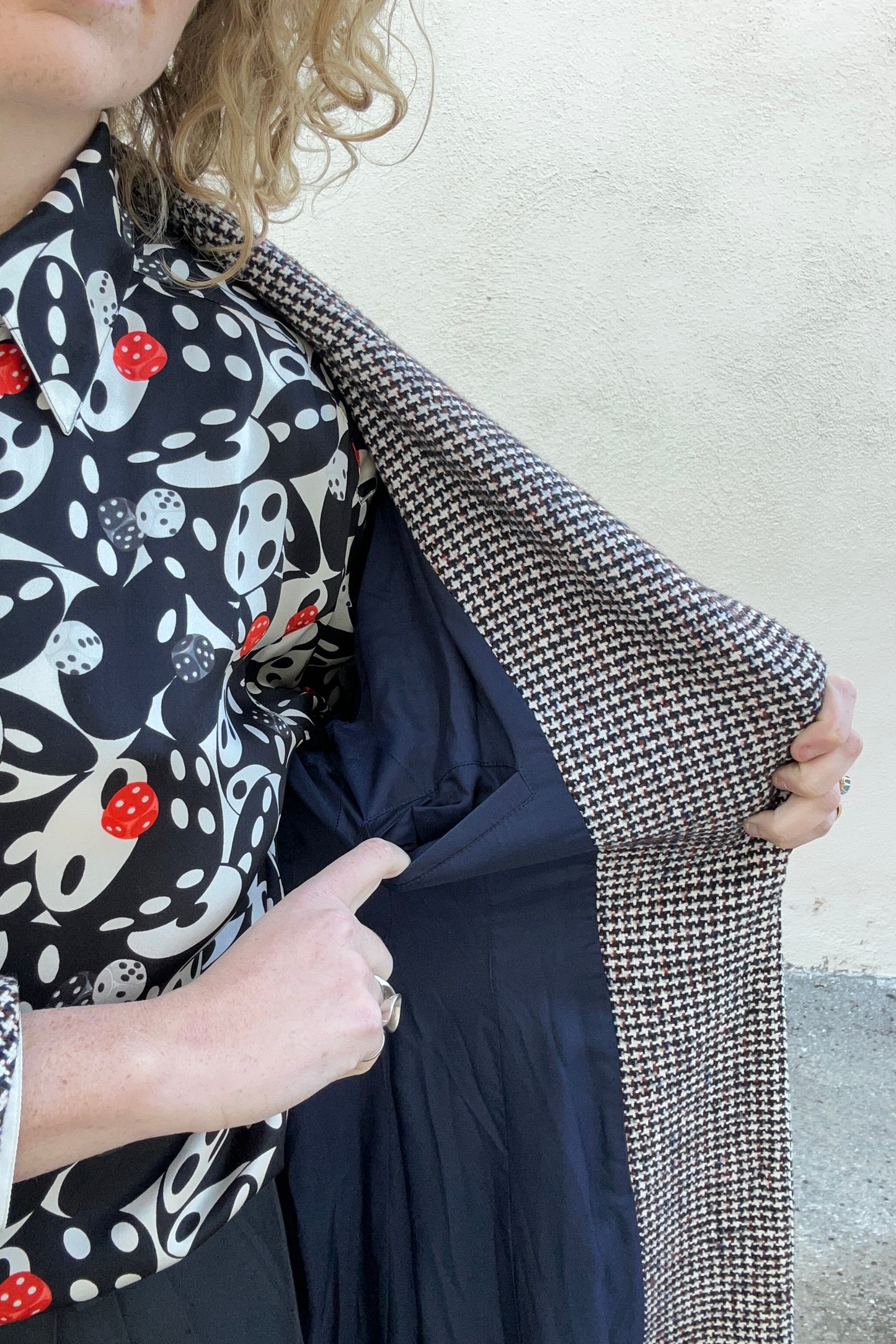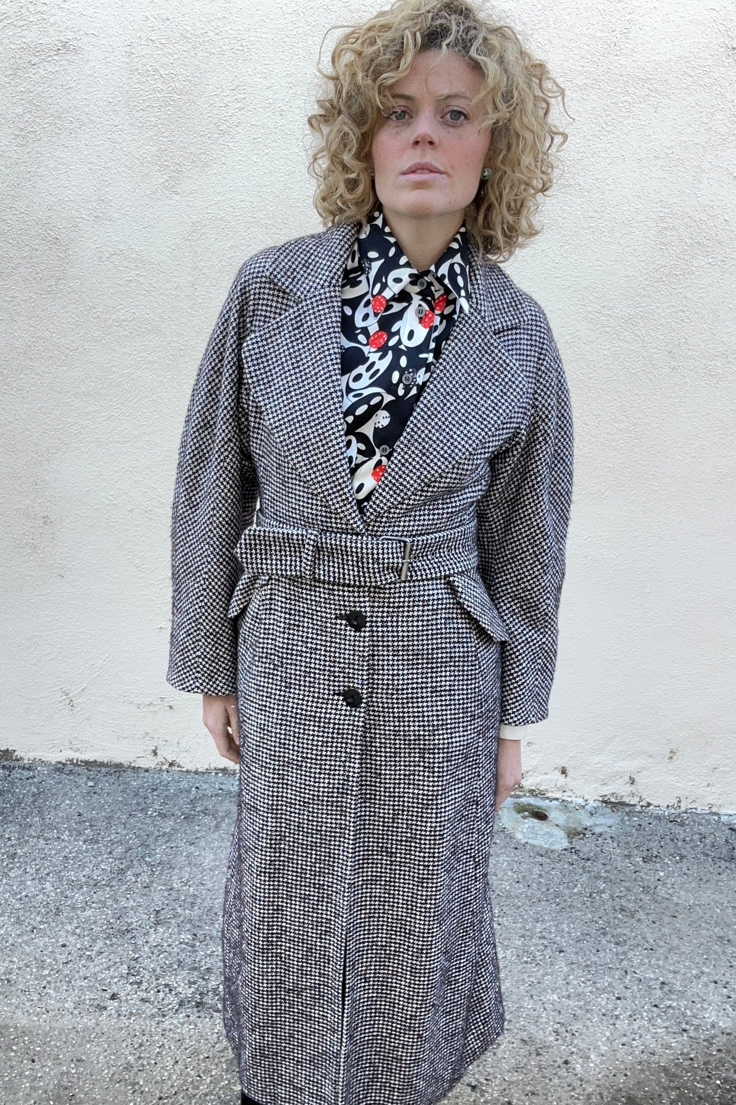 Rachel Comey Houndstooth Wool Coat in excellent condition. Just absolutely darling collar and body combo. A cozy sleek vintage vibe. Unmarked size, fits like a Small/Medium. Lined with satin inside. Has hidden side pockets and two front closure clasps. Looks cute worn open as well. Marked size 2. Fits XS/S. Dry clean only. Do not wash. 49% cotton, 34% wool, 17% polyester. 100% rayon lining.
