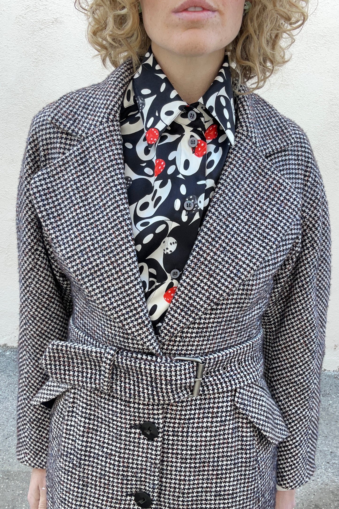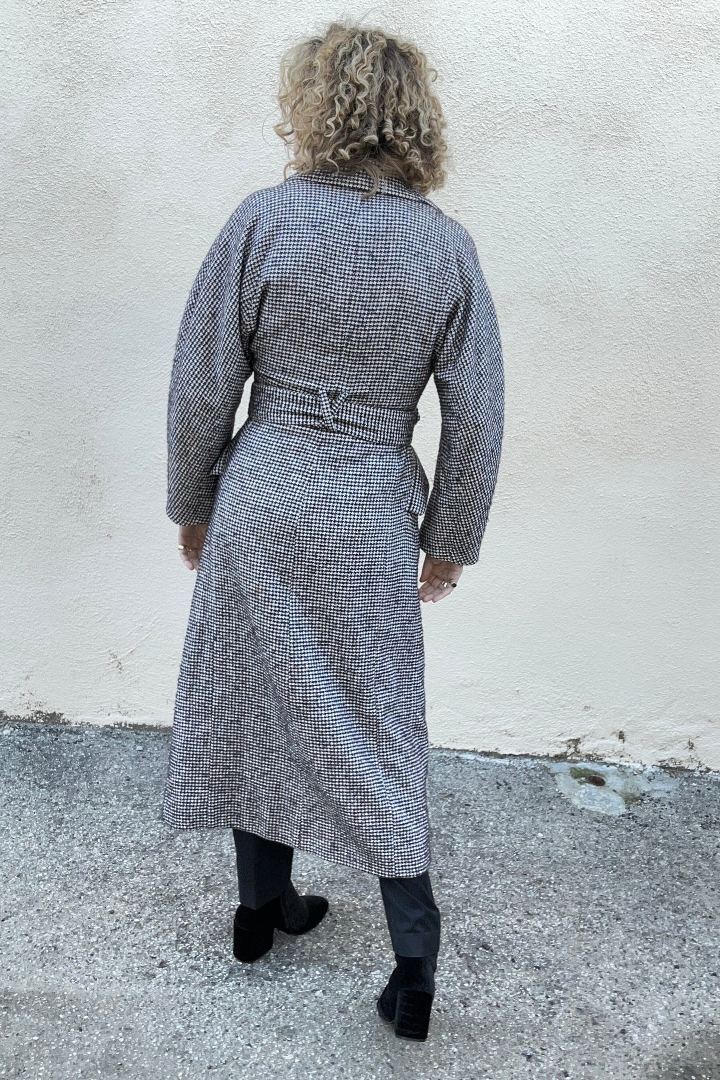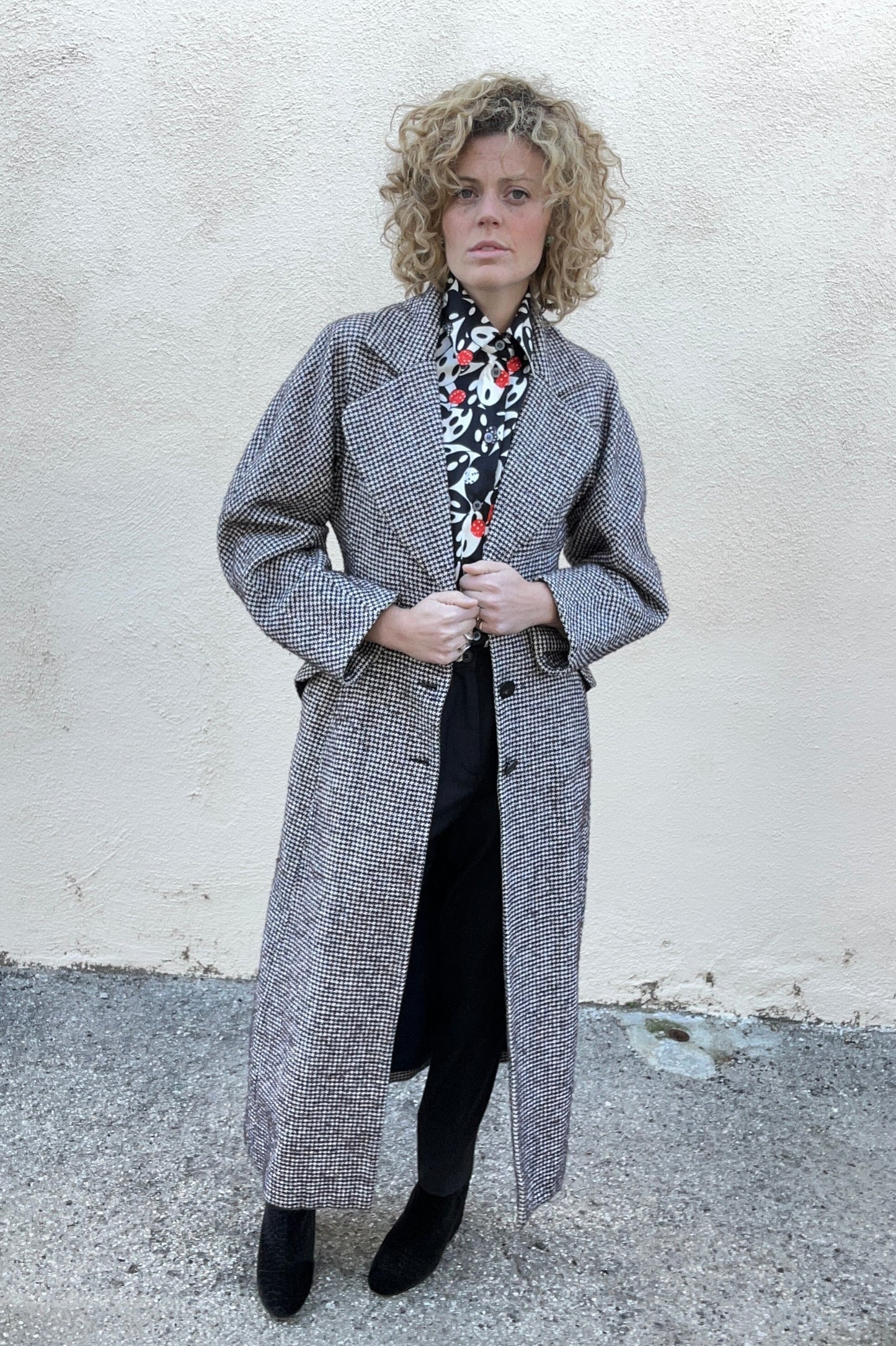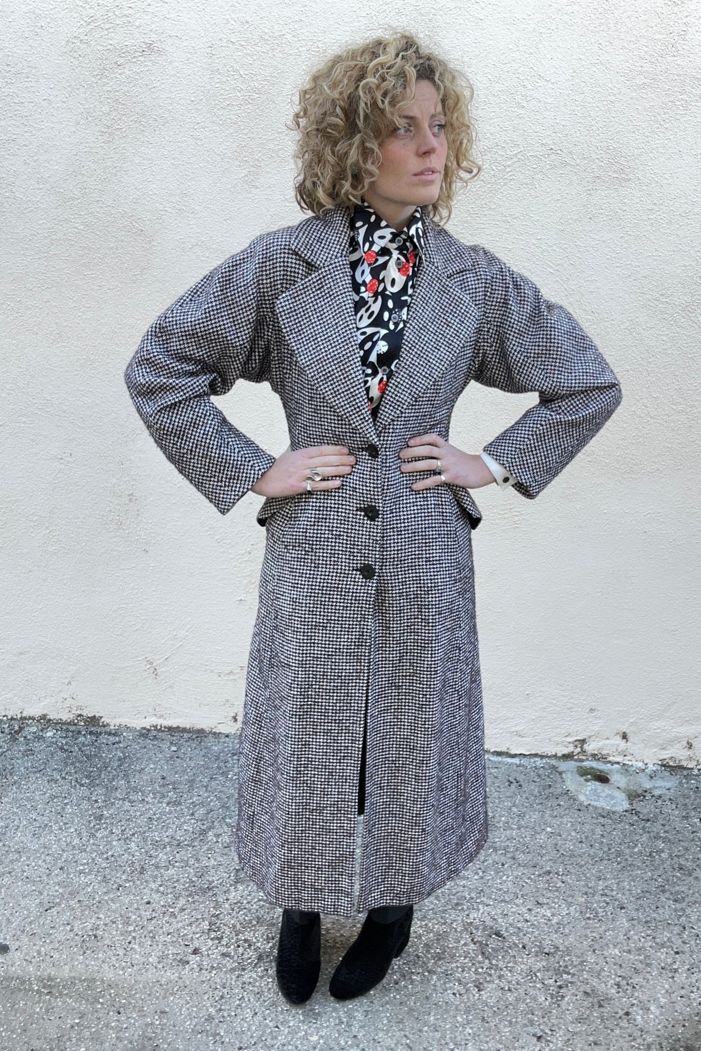 Rachel Comey Houndstooth Wool Coat in excellent condition. Just absolutely darling collar and body combo. A cozy sleek vintage vibe. Unmarked size, fits like a Small/Medium. Lined with satin inside. Has hidden side pockets and two front closure clasps. Looks cute worn open as well. Marked size 2. Fits XS/S. Dry clean only. Do not wash. 49% cotton, 34% wool, 17% polyester. 100% rayon lining.