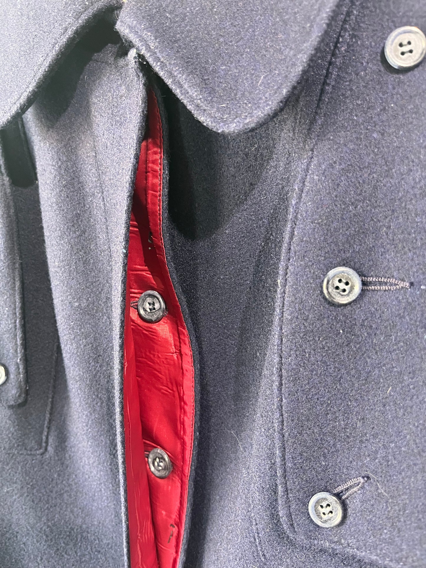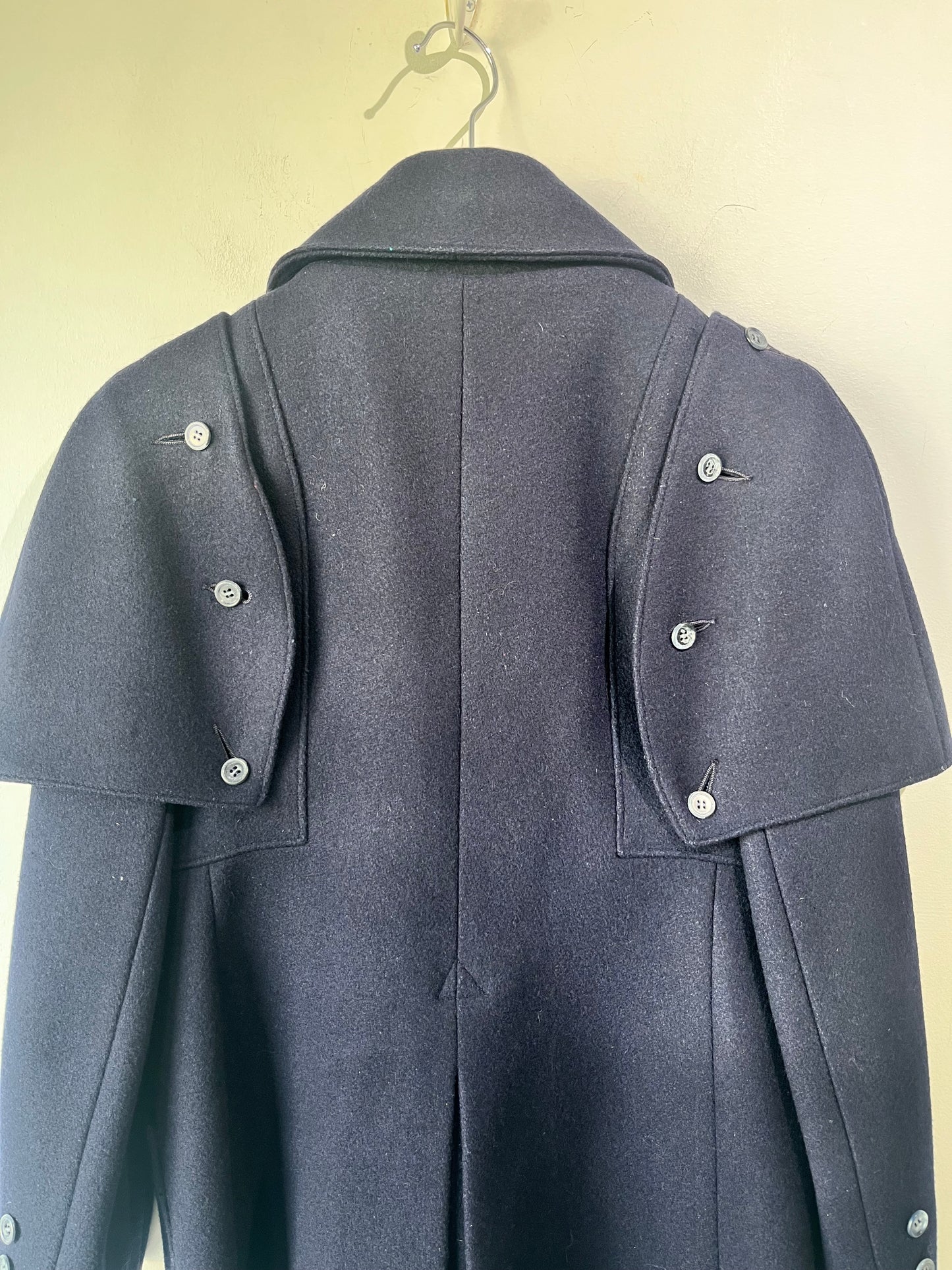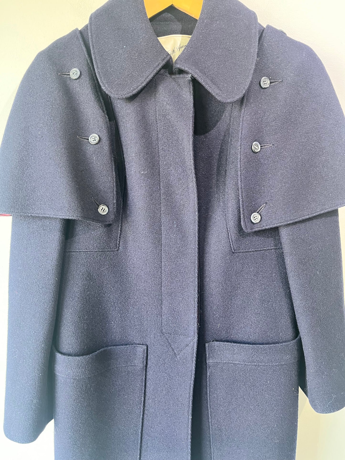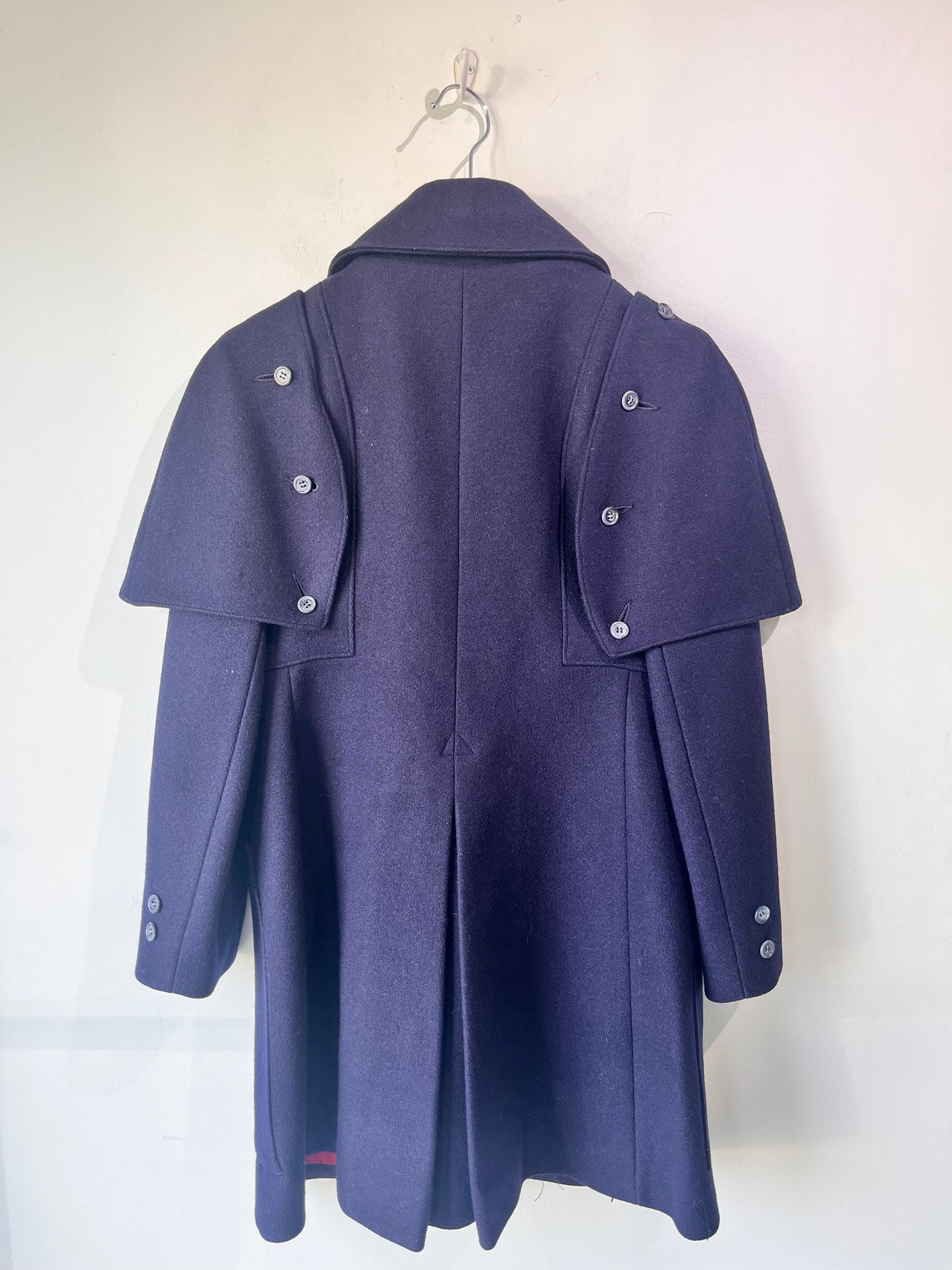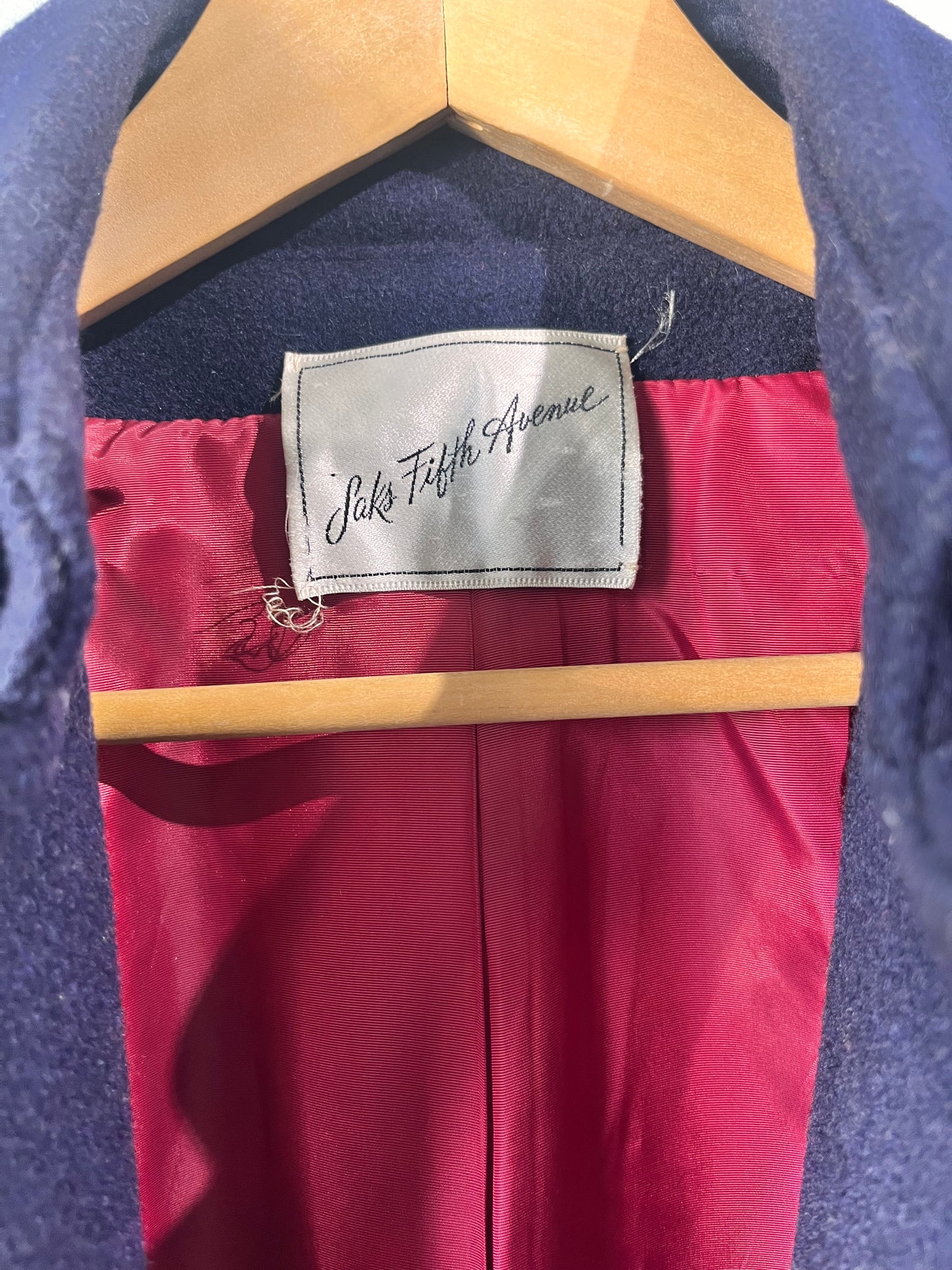 Saks Fifth Avenue Navy Wool Great Coat. The details are absolutely everything on this amazing coat, from the button down capelet shoulders to the vented rear hem to the hidden red placket lining. Timeless, classic, chic and just dying to be seen this winter! Two exaggerated patch pockets at the front will keep your hands warm and things safe. Features a hidden placket with button closure as well as a single top snap closure. Snag this little beauty at a fantastic price before she's gone! Fully Lined. Excellent condition.