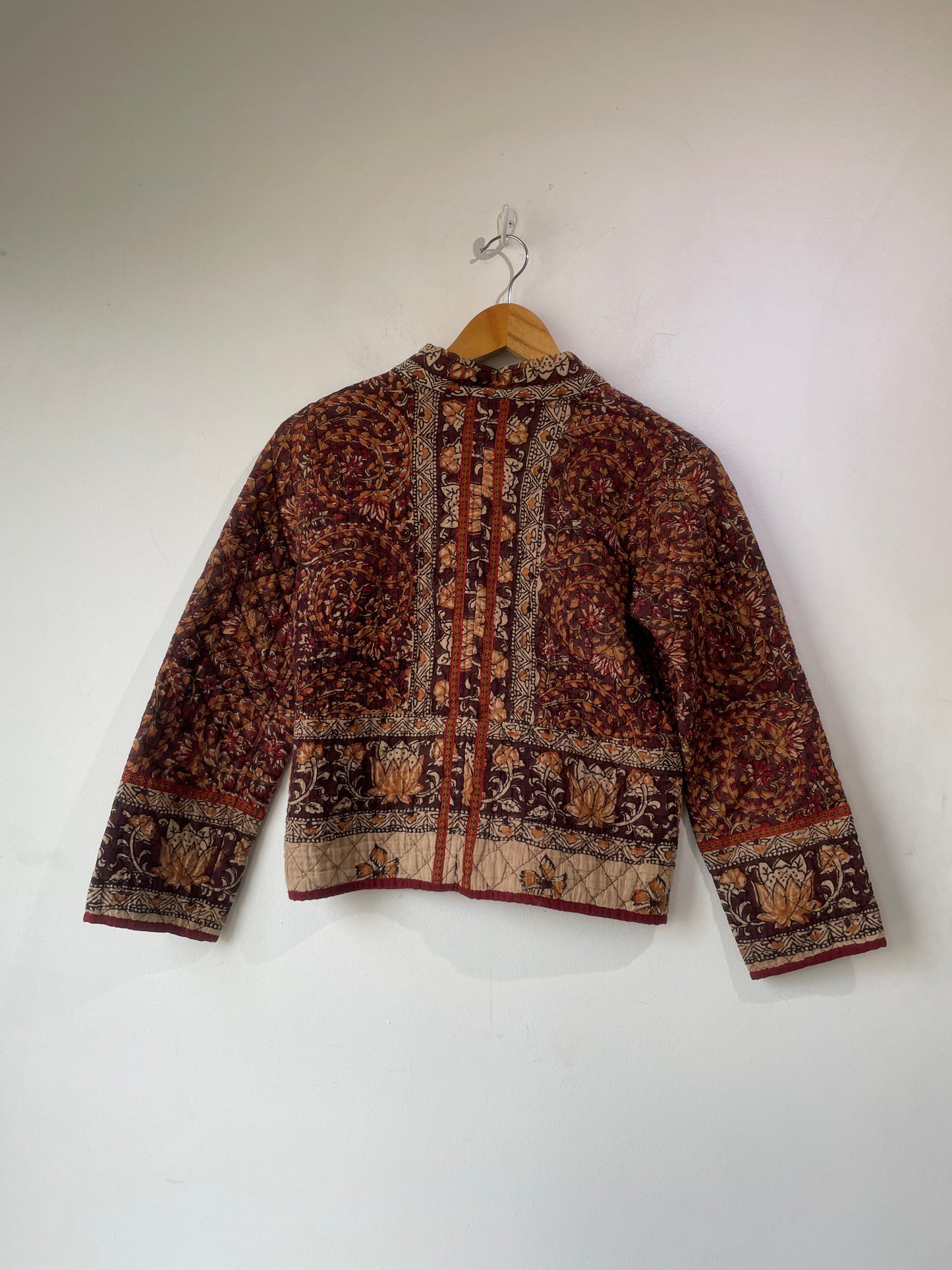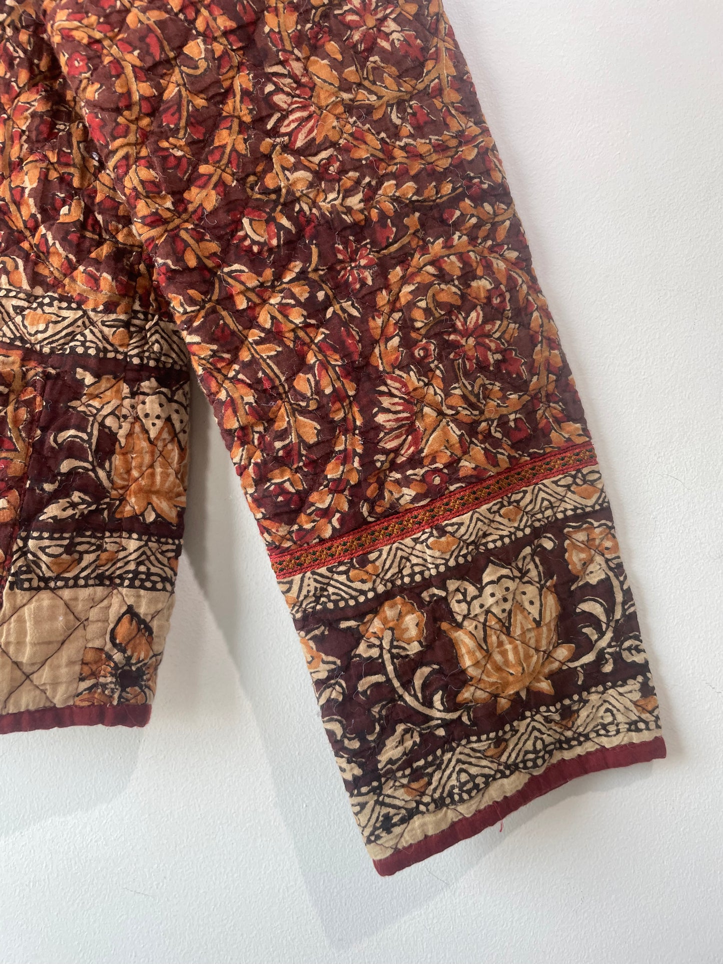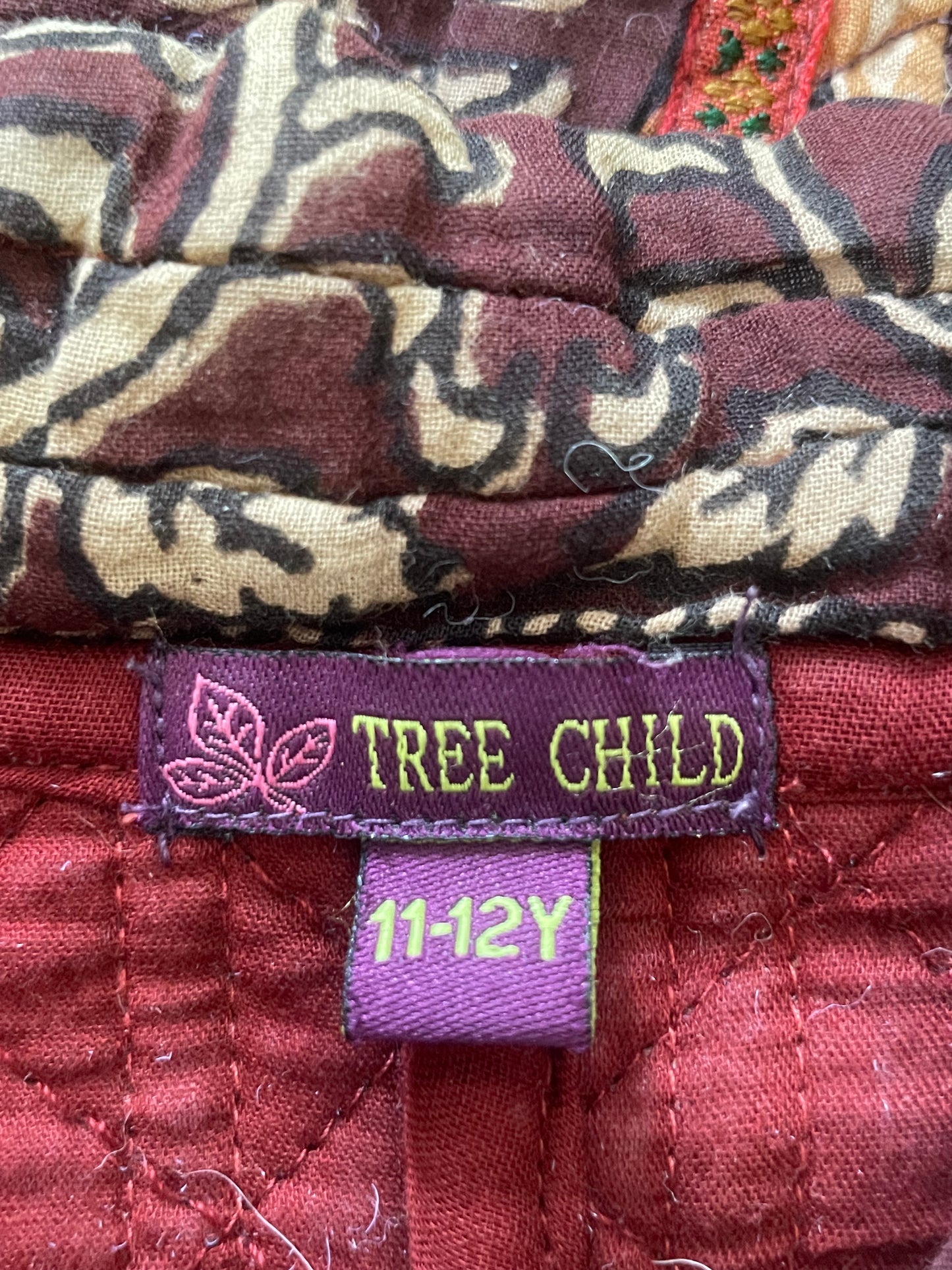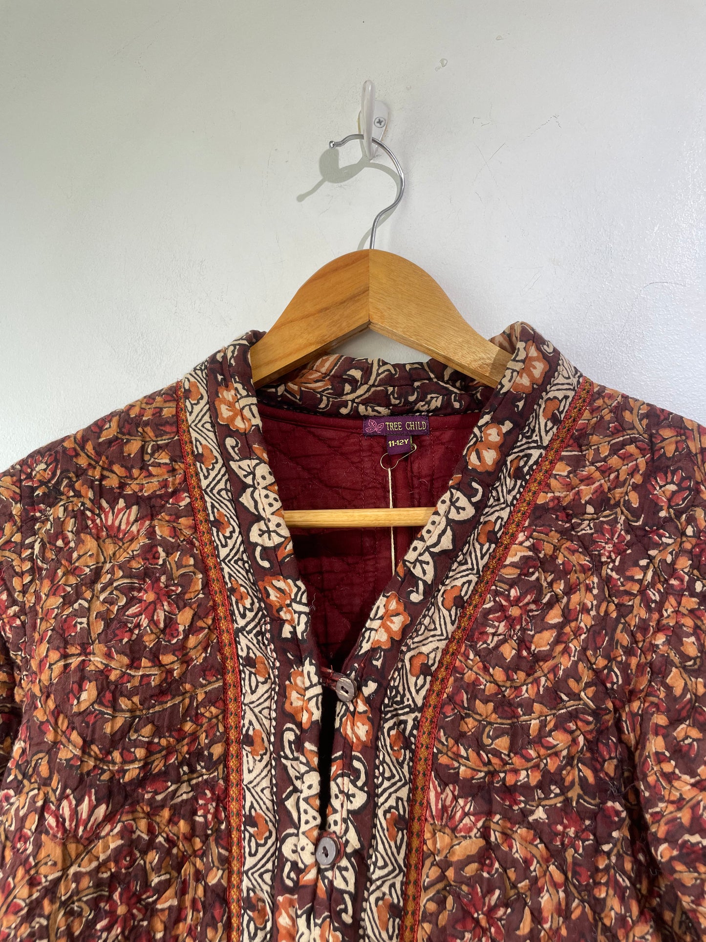 Tree Child Owl Block-Print Quilted Jacket. A beautiful orange and brown quilted jacket. Features owls printed on pockets, button up front, and floral tape details. A wonderful; little jacket for days with a little chill. In very good condition. Unmarked materials, likely cotton. Marked for ages 11-12, but could fit XS-S, please refer to measurements.